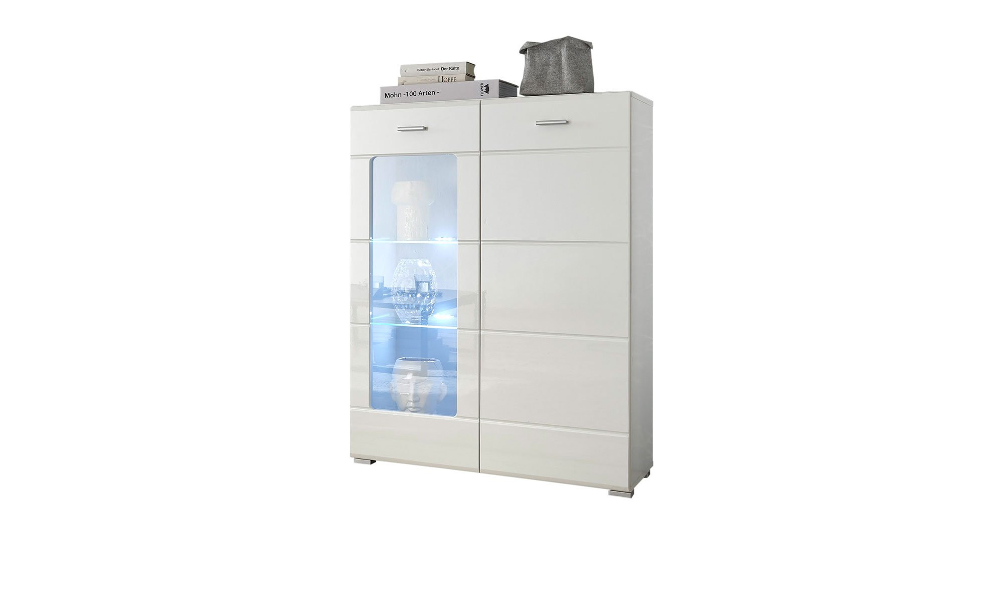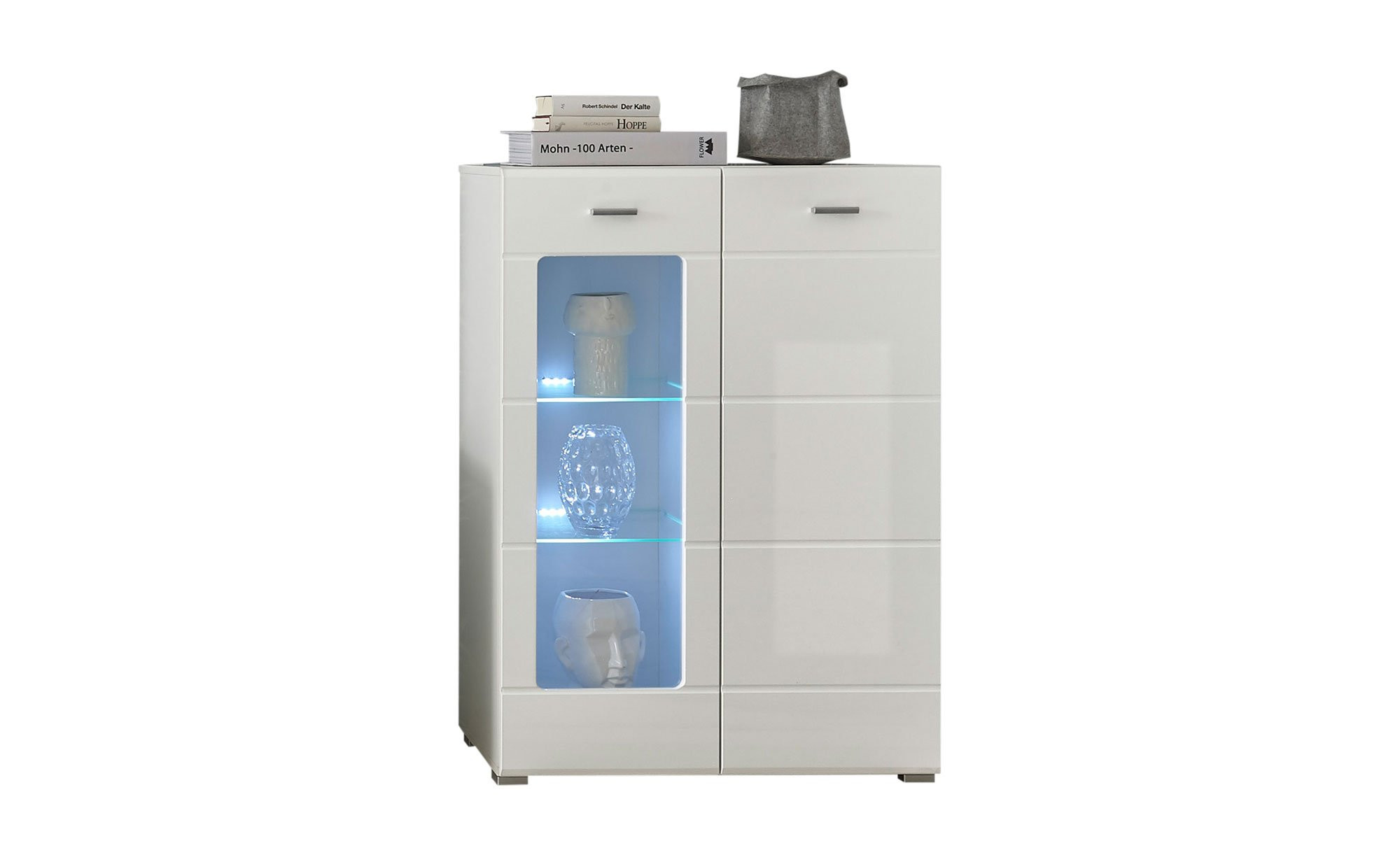Während silberne Kunststofffüße für stabilen Halt sorgen, helfen Stangengriffe derselben Farbe dabei, die Türen zu öffnen. Im Innern des Möbelstücks gibt es vier Böden.