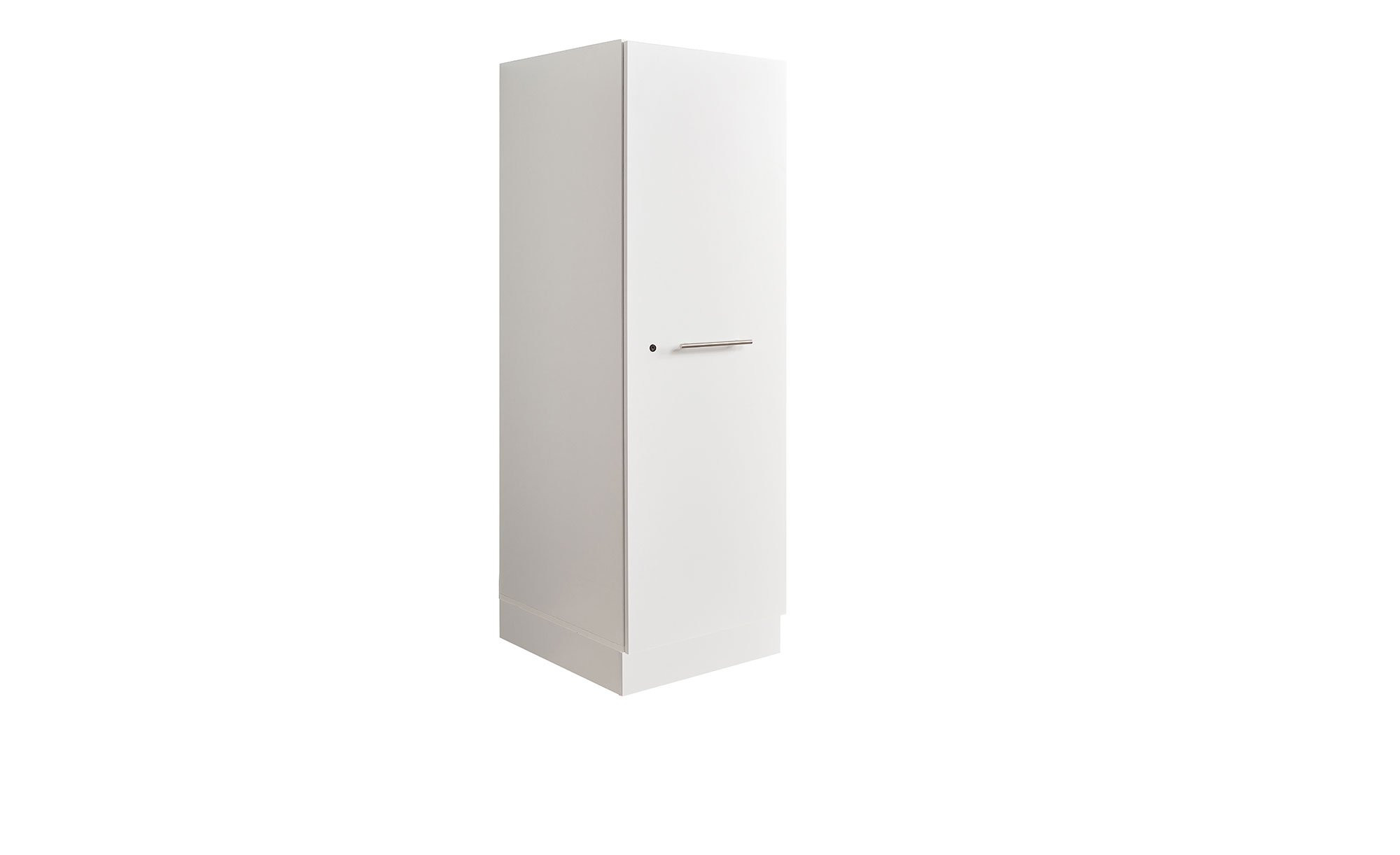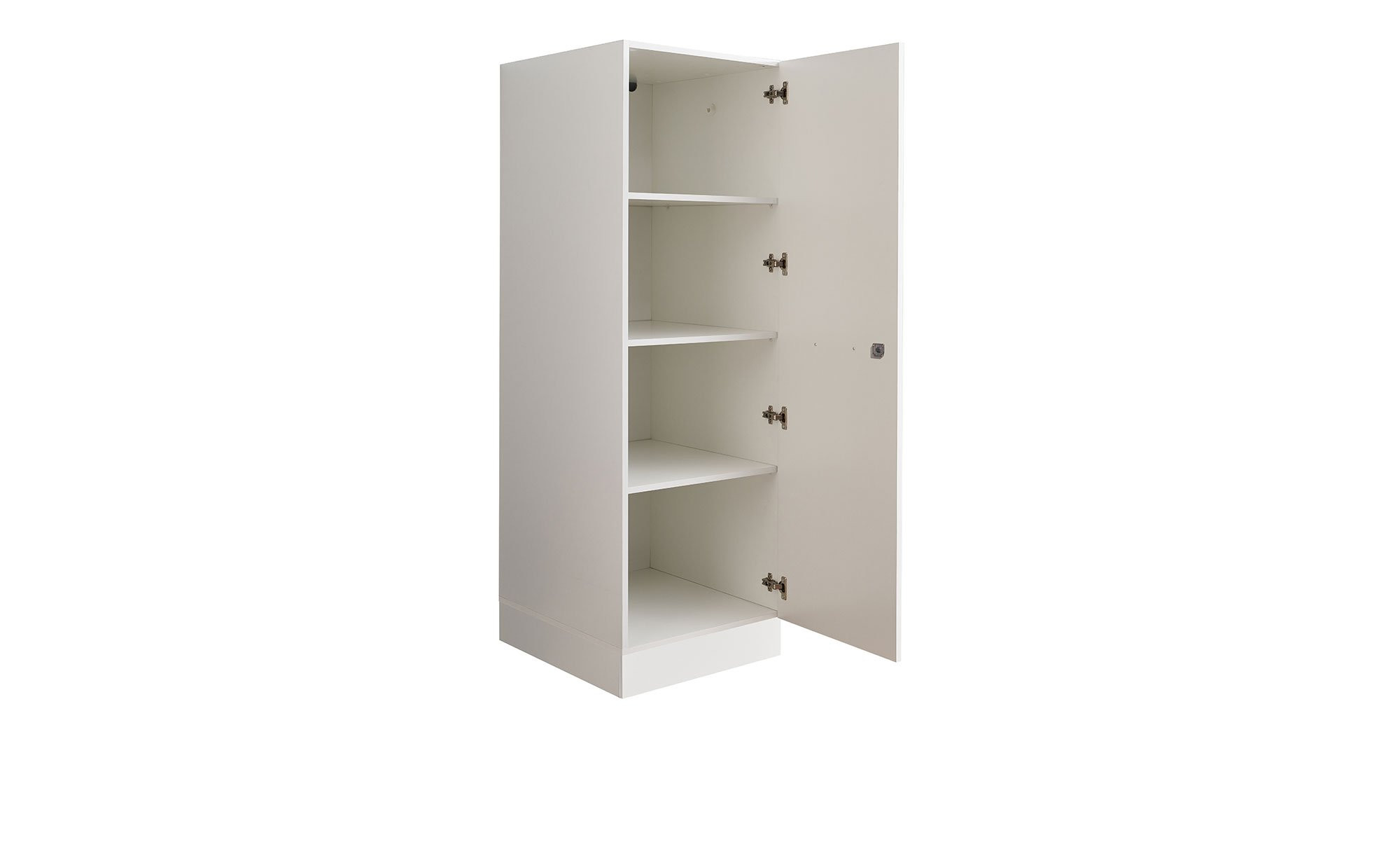 Vor einem Innenbereich mit drei Einlegeböden befindet sich eine gedämpfte Tür. Sie ist wechselseitig montierbar und kann bei Bedarf abgeschlossen werden.