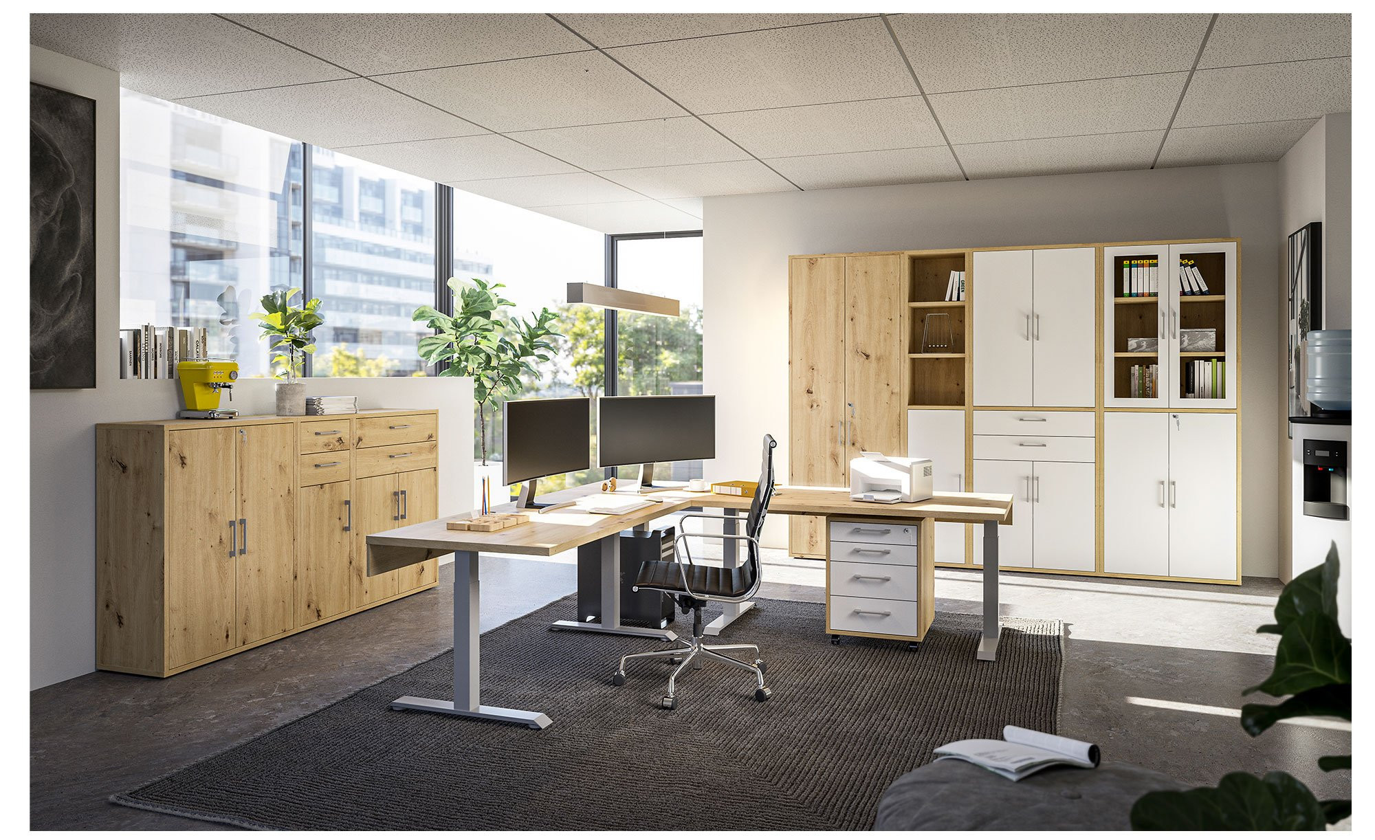 Während die beiden Türen in einem natürlichen Asteiche-Dekor gehalten sind, überzeugt der praktische Mittelboden in supermattem Anthrazit. Zusätzlich werden die ca. 77 x 211 x 40 cm großen Artikel durch ihre robuste Melaminharzbeschichtung vor Verschleiß geschützt.