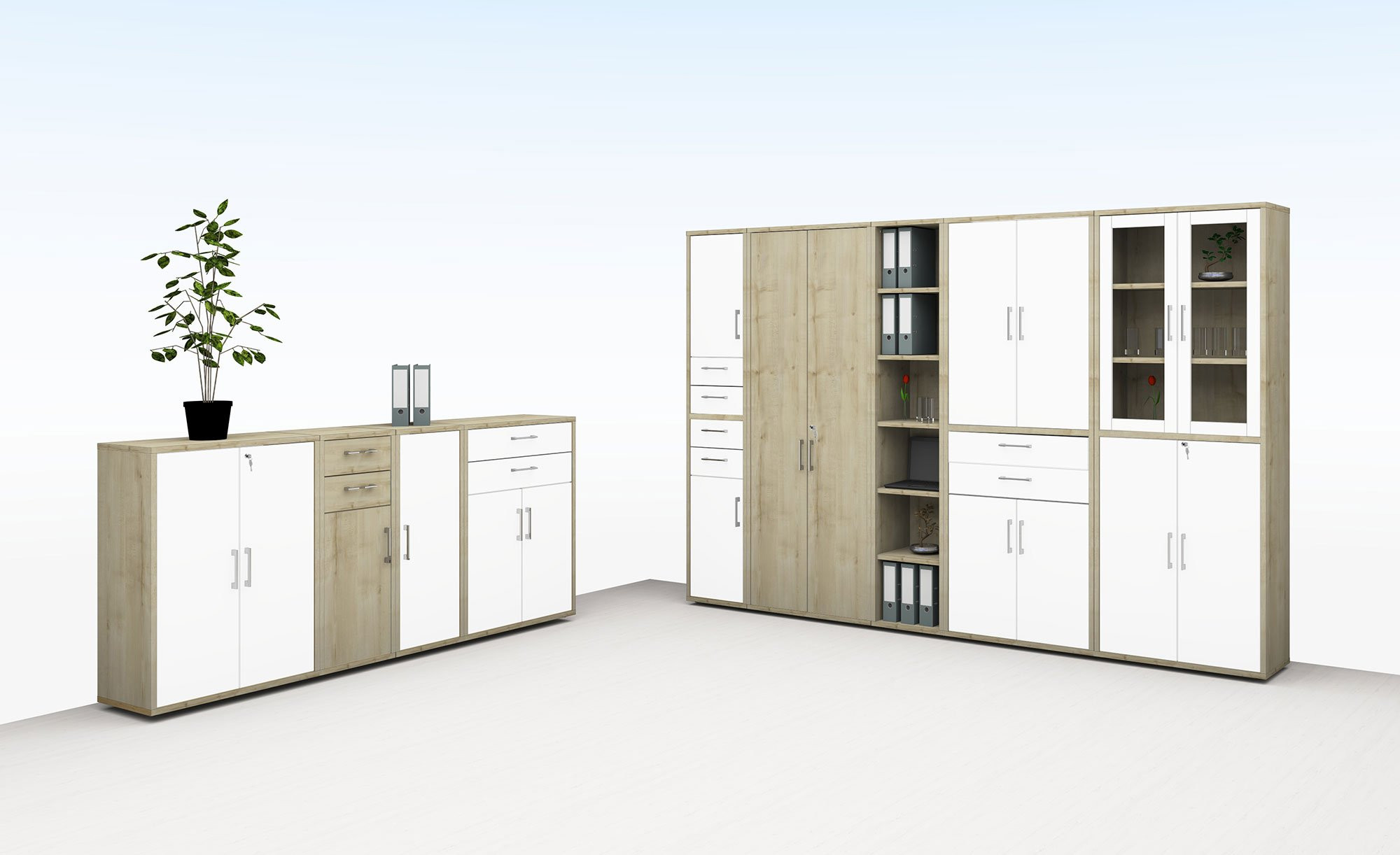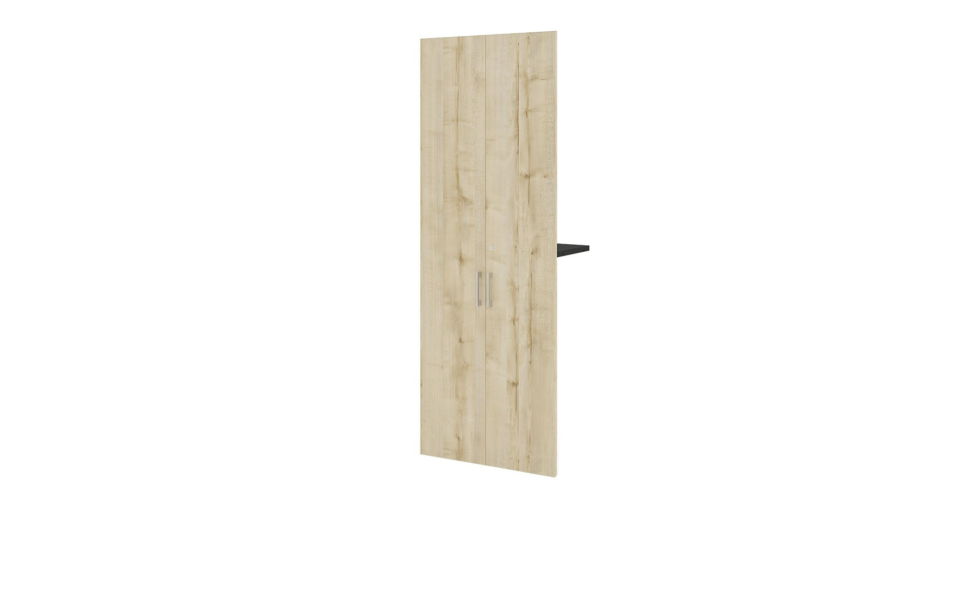 Die Türen sind im Dekor Birke gestaltet, der integrierte Mittelboden in supermattem Anthrazit. Insgesamt messen die Artikel ca. 77 x 211 x 40 cm. Sie sind mit einer widerstandsfähigen Melaminharzbeschichtung versehen, die vor Verschleiß schützt. Zudem erwarten Sie eine sanfte Soft-Close-Funktion und hochwertige Metallbeschläge. Optional lassen sich die Türen auch abschließen.