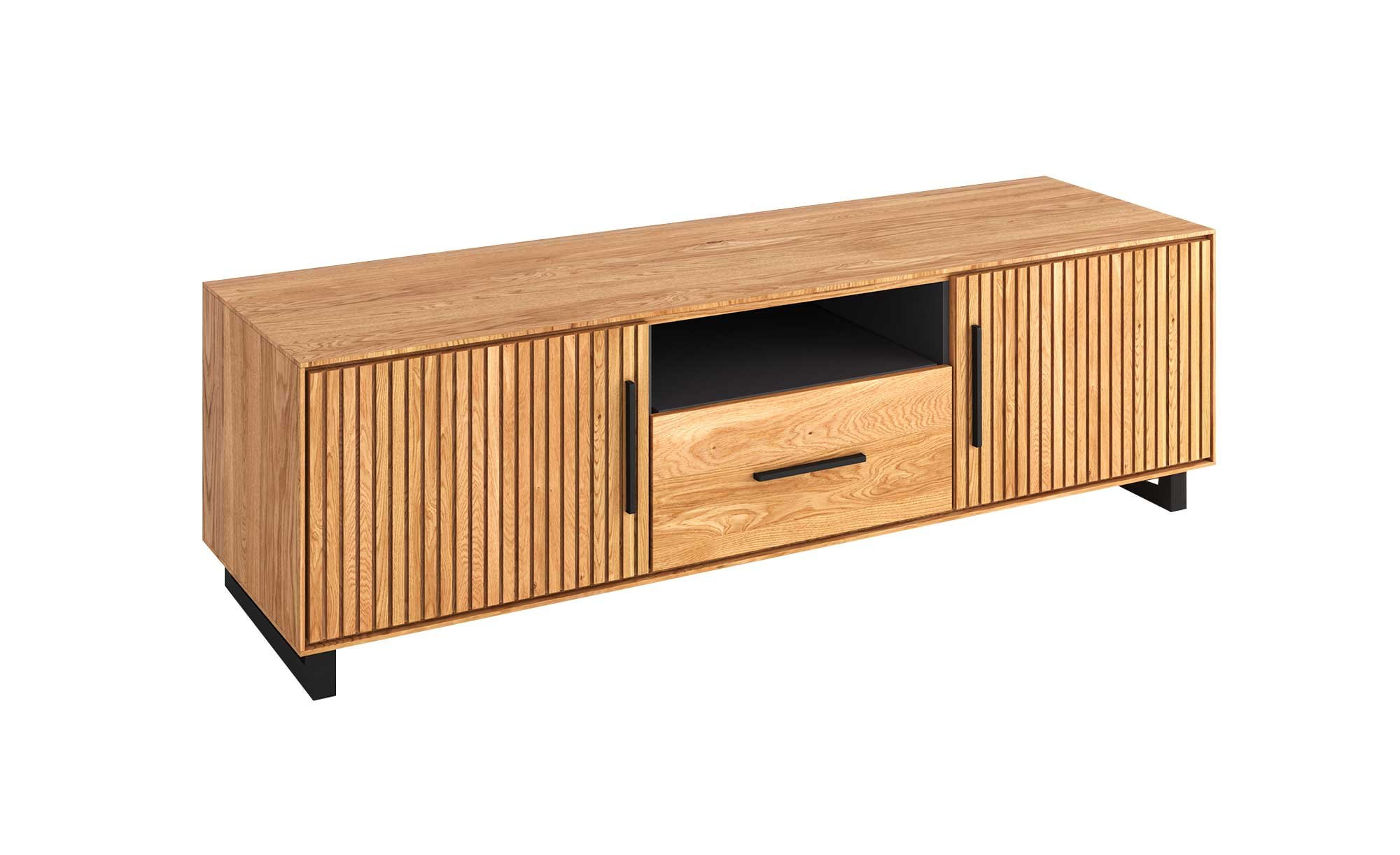 Zur ca. 165 x 60 x 45 cm großen Kommode gehören zwei gedämpfte Türen und in der Mitte ein Schubkasten mit Soft-Close. Außerdem gibt es ein offenes Ablagefach für schmale Geräte.