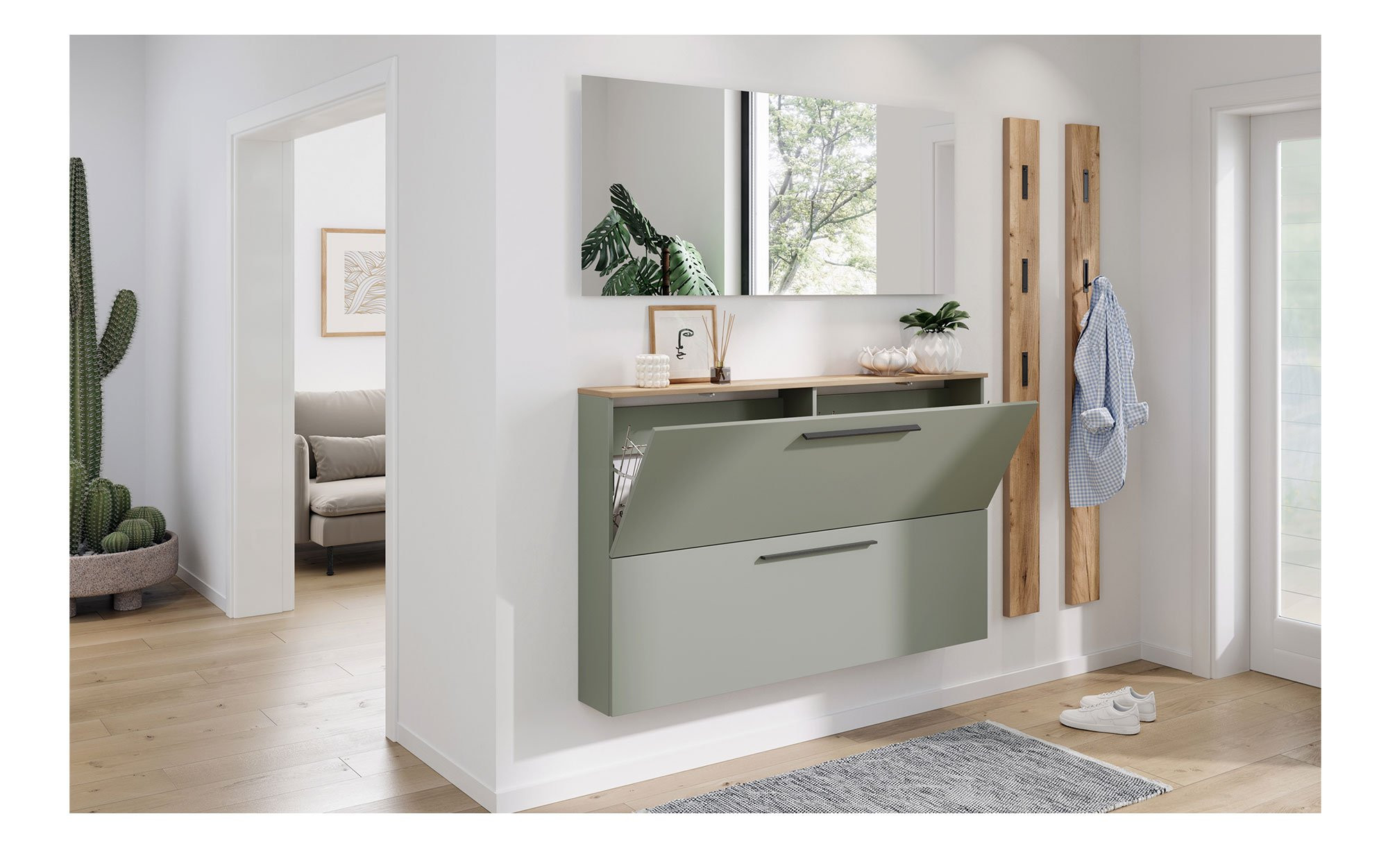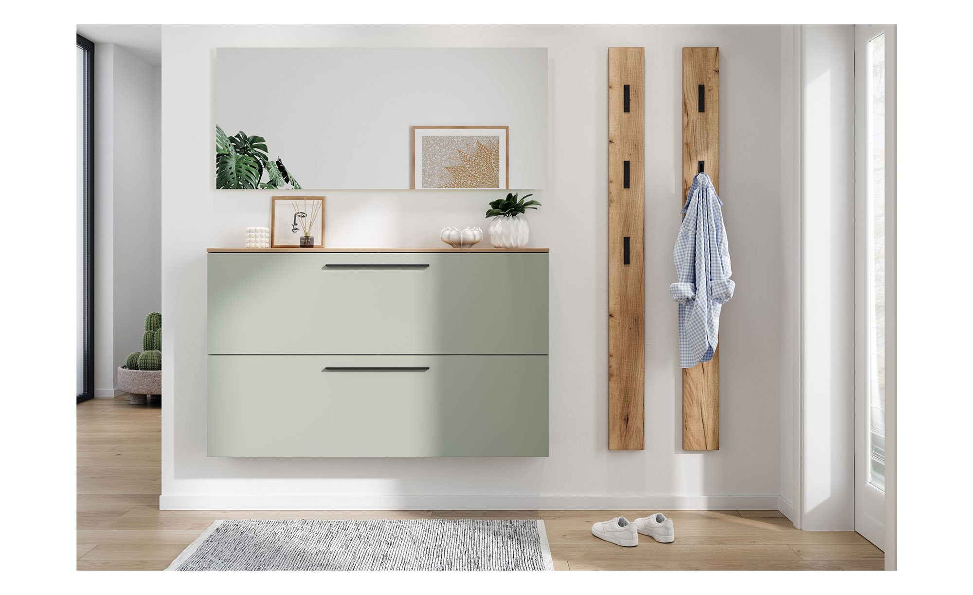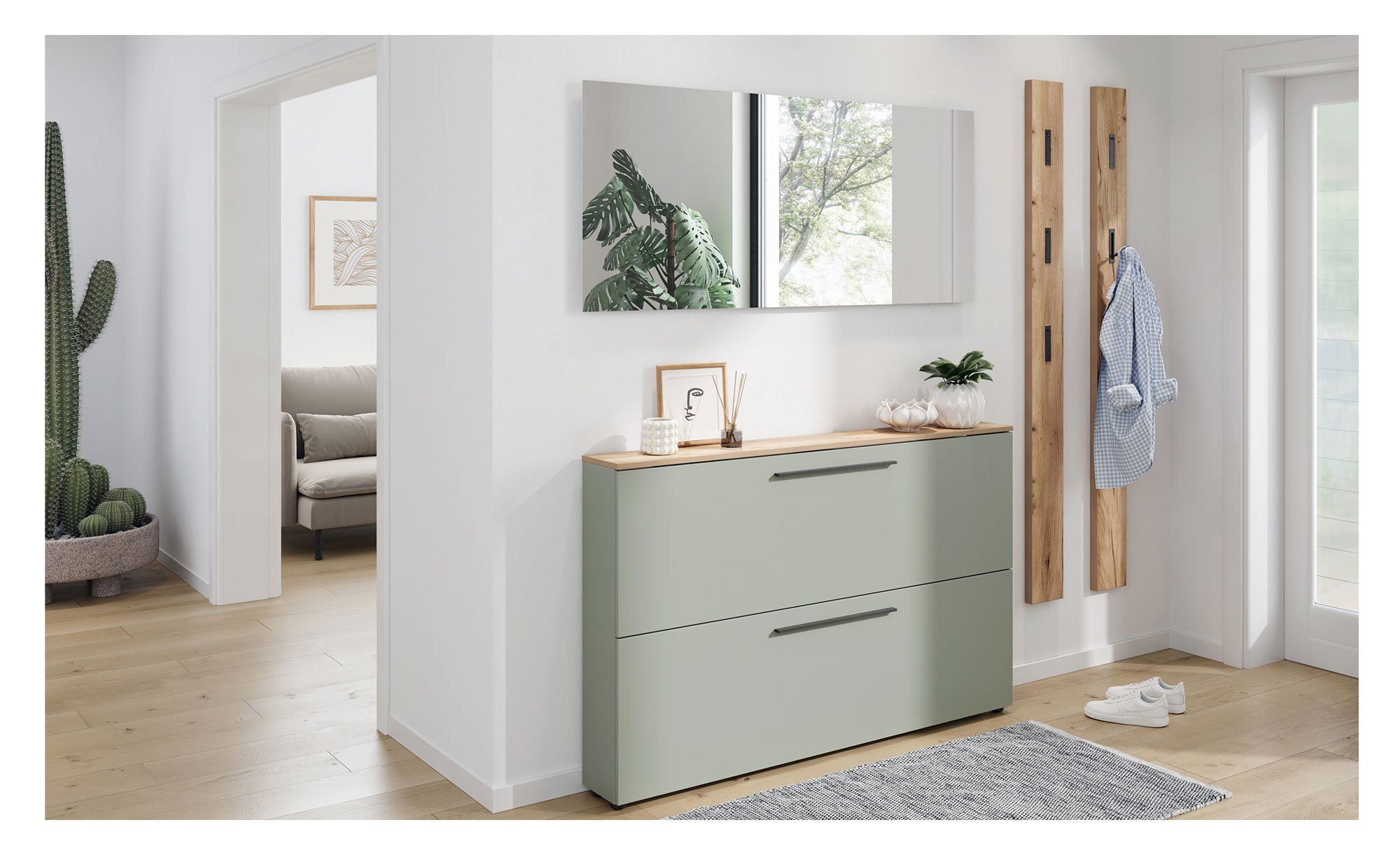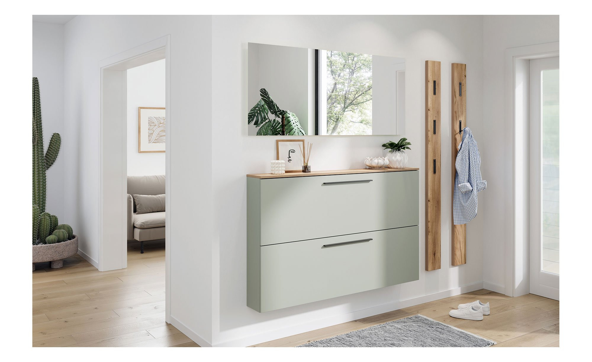 - Spiegel auf zurückspringender, beschichteter Trägerplatte, sodass eine Schattenfuge entsteht