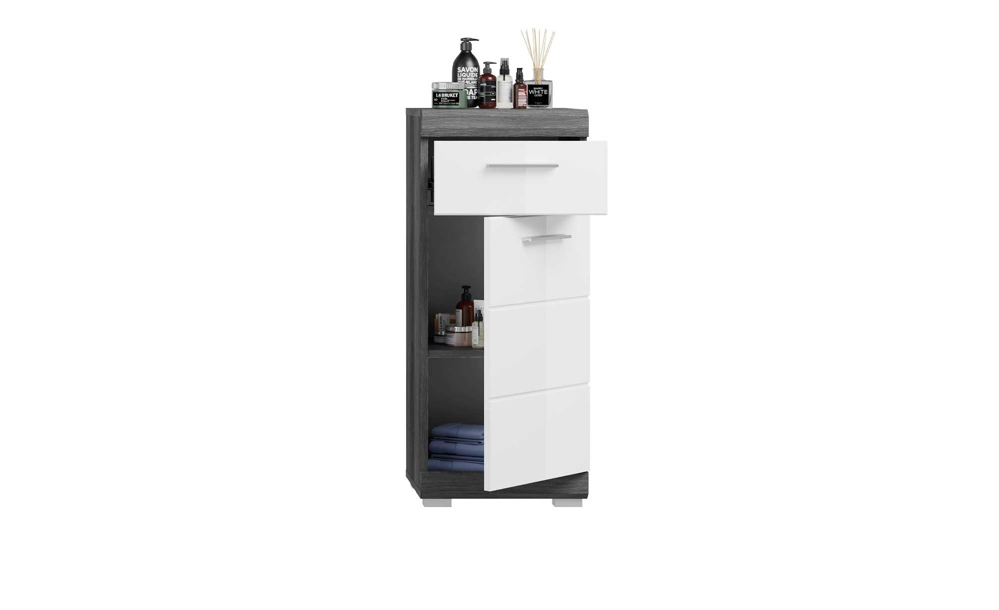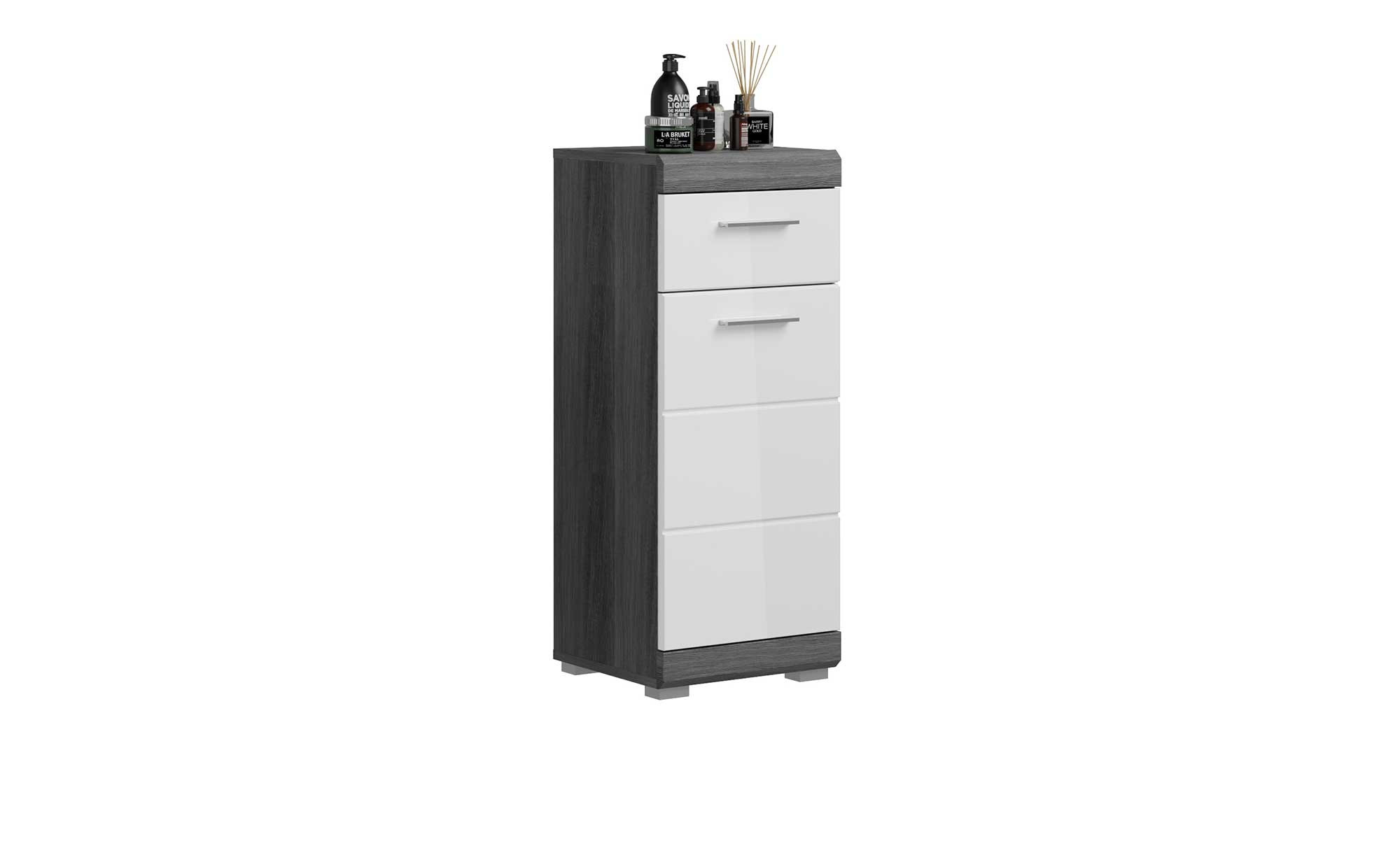 Durch seine glatten Oberflächen ist der ca. 37 x 88 x 31 cm große Schrank ausgesprochen pflegeleicht. Während der Korpus aus Holzwerkstoff gefertigt wurde und über ein Design in Rauchsilber verfügt, sind die MDF-Fronten hochglänzend weiß. Dazu passend gibt es chromfarbige Kunststoffgriffe.