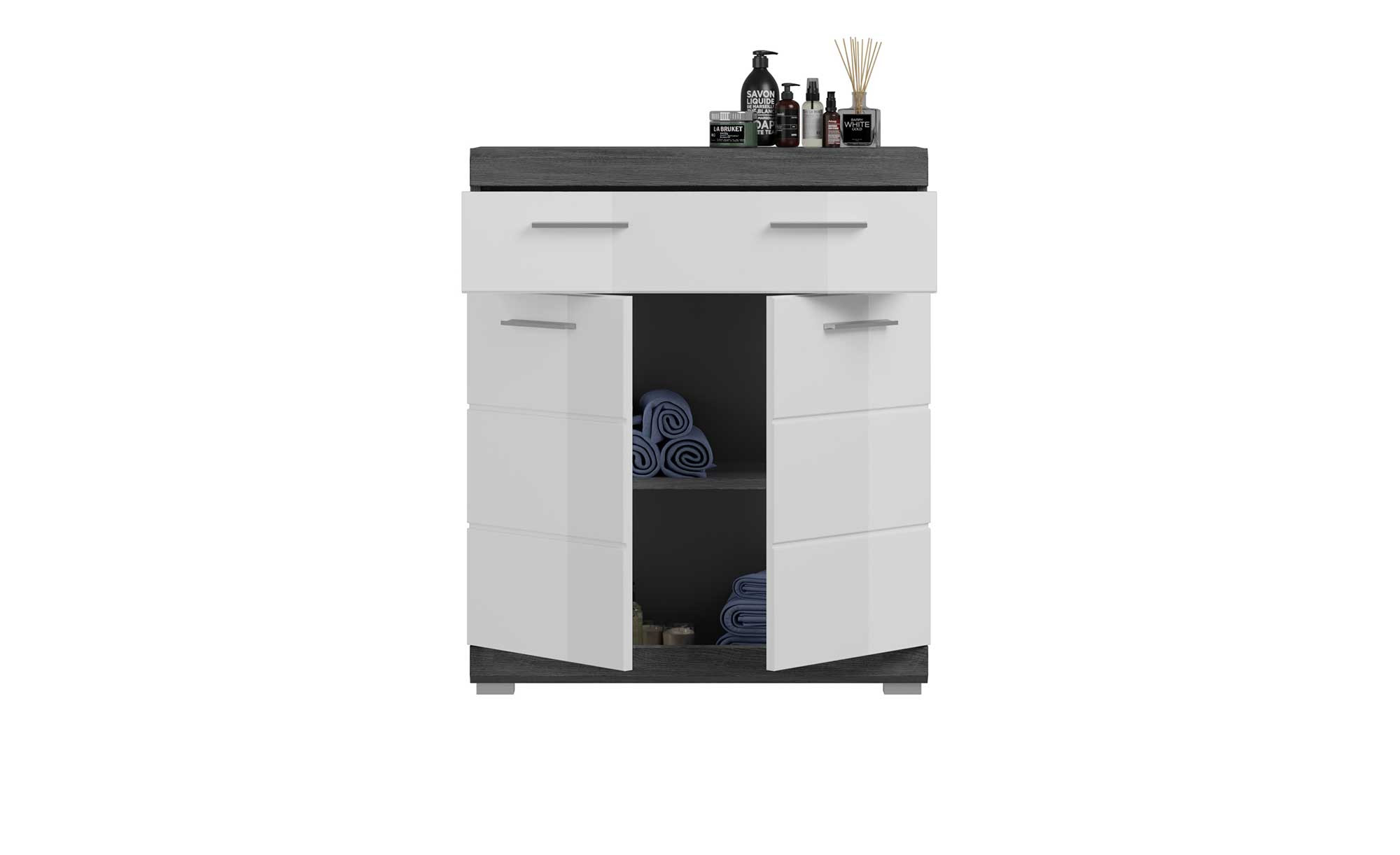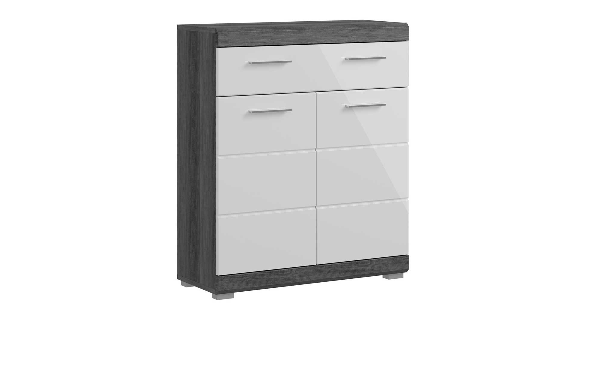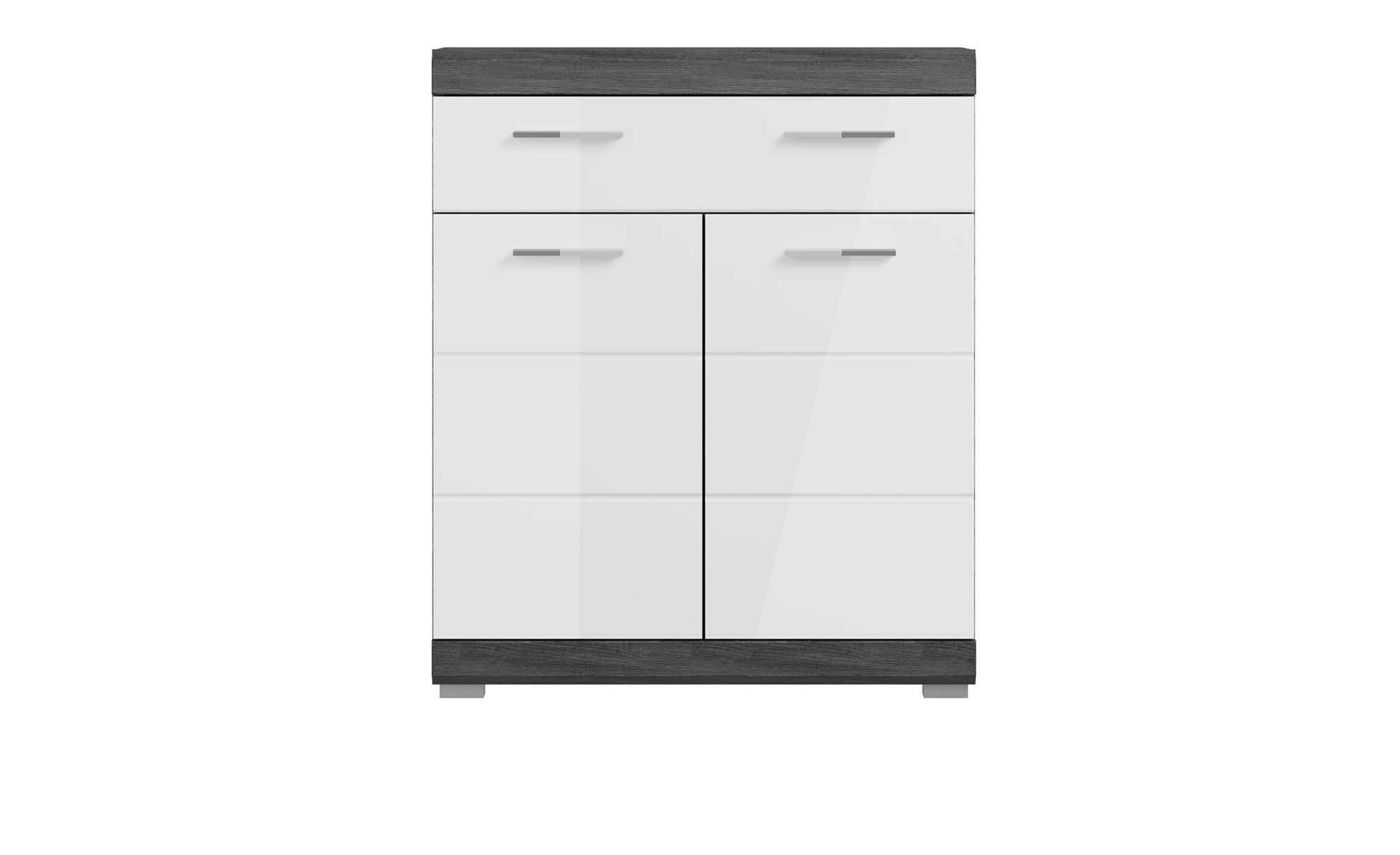Die wertigen MDF-Fronten des ca. 74 x 88 x 31 cm großen Schranks sind in hochglänzendem Weiß gestaltet und bilden einen gelungenen Kontrast zum rauchsilbernen Holzwerkstoff-Korpus. Dank seinen glatten Oberflächen ist der Artikel zudem sehr pflegeleicht. Optisch fügen sich chromfarbige Kunststoffgriffe perfekt ins Bild.