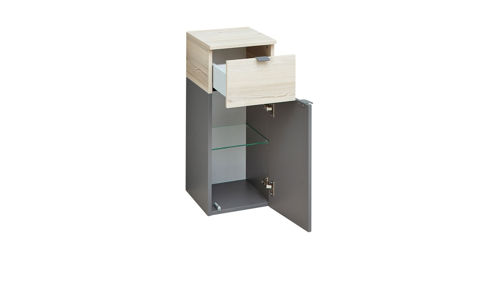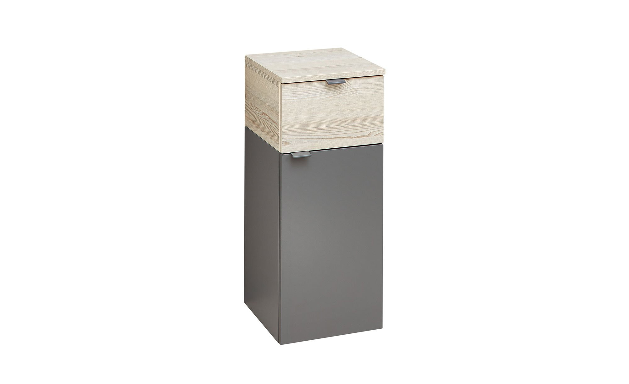 Das ca. 30 x 72 x 33 cm große Möbelstück besteht aus Holzwerkstoff in einem edlen Quarzgrau-Ton. Die Schublade und der obere Teil vom Korpus sind mit einer Polar Pinie Nachbildung versehen. Vor Verschleiß ist der Artikel dank der melaminharzbeschichteten Oberfläche geschützt.