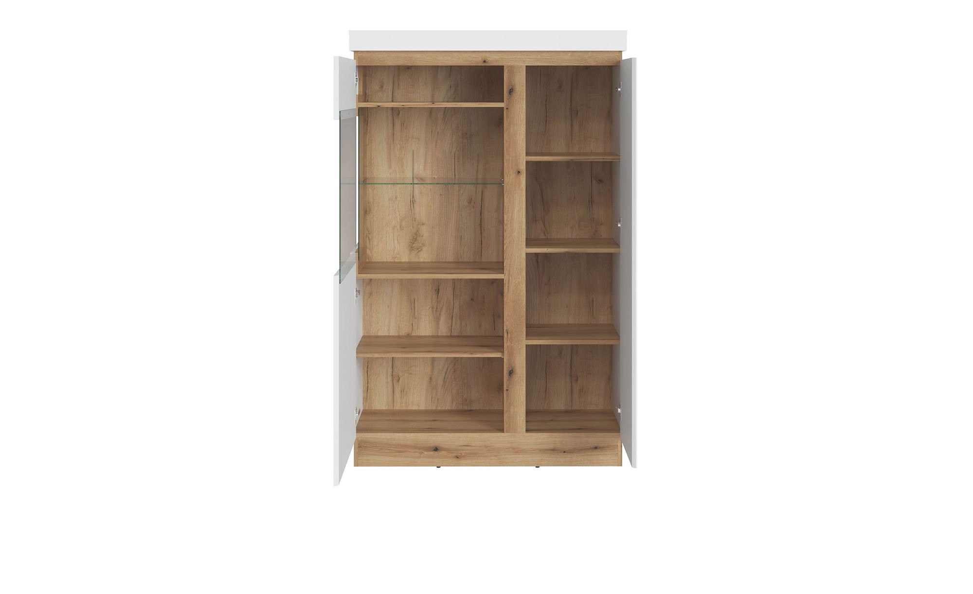Front und Korpus der ca. 104 x 164 x 40 cm großen Vitrine wurden aus Holzwerkstoff gefertigt und sind in der Farbe Alpinweiß gehalten. Als Absetzung fungiert ein natürliches Coast Evoke Eiche-Dekor, das sich darüber hinaus auch an der Rückwand und beim Innendekor findet. Zum Schutz vor Verschleiß wurde eine Beschichtung aus Melaminharz aufgetragen.