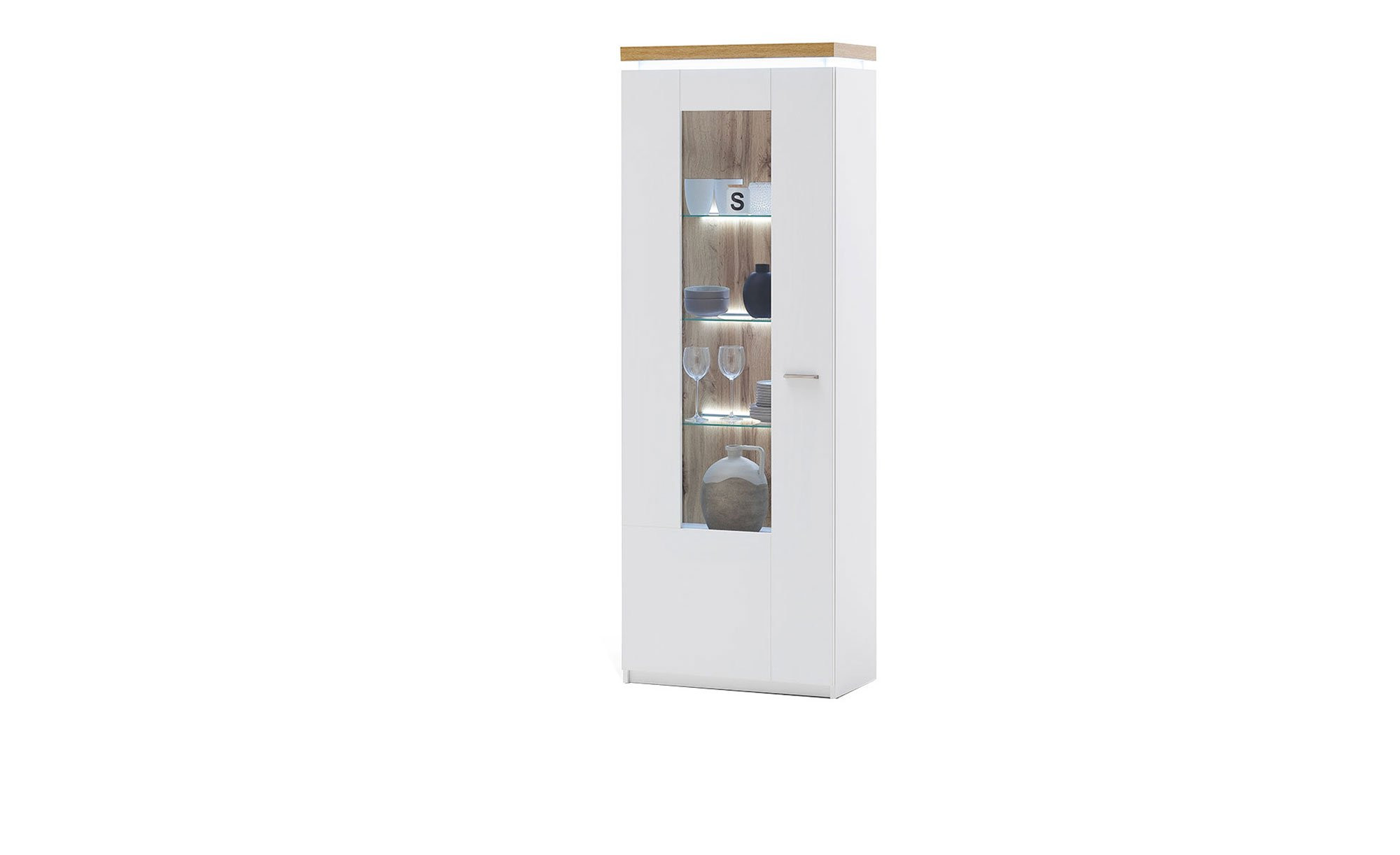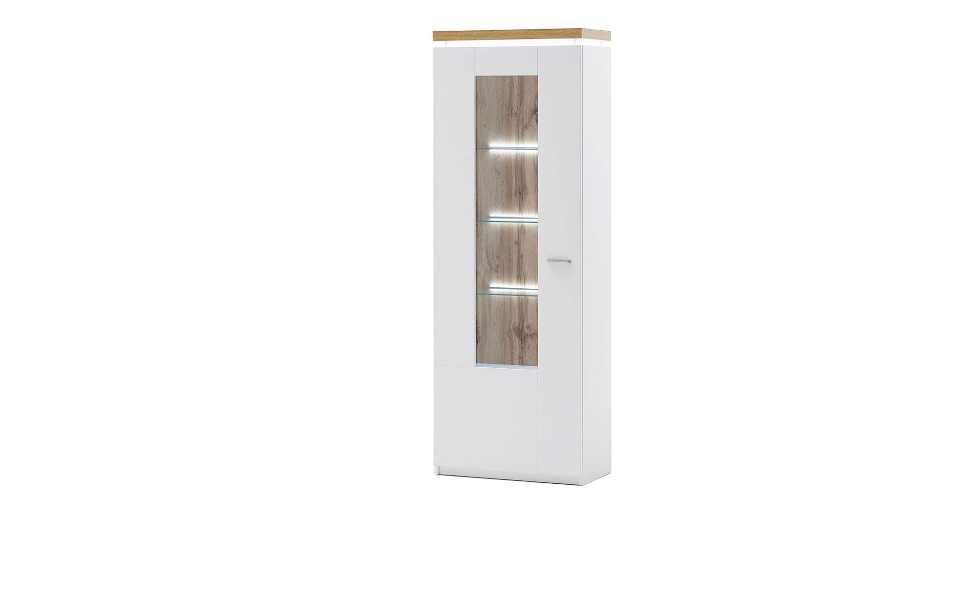 Während der Korpus und die Fronten der ca. 70 x 197 x 38 cm großen Vitrine ganz in Weiß gehalten sind, ziehen die Absetzung sowie die Rückwände im Dekor Wotan Eiche alle Blicke auf sich. Für eine lange Haltbarkeit wurden die Oberflächen mit widerstandsfähigem Melamin beschichtet. Metallgriffe und eine inkludierte Deckplattenbeleuchtung tragen einen weiteren Teil zum wertigen Erscheinungsbild bei.