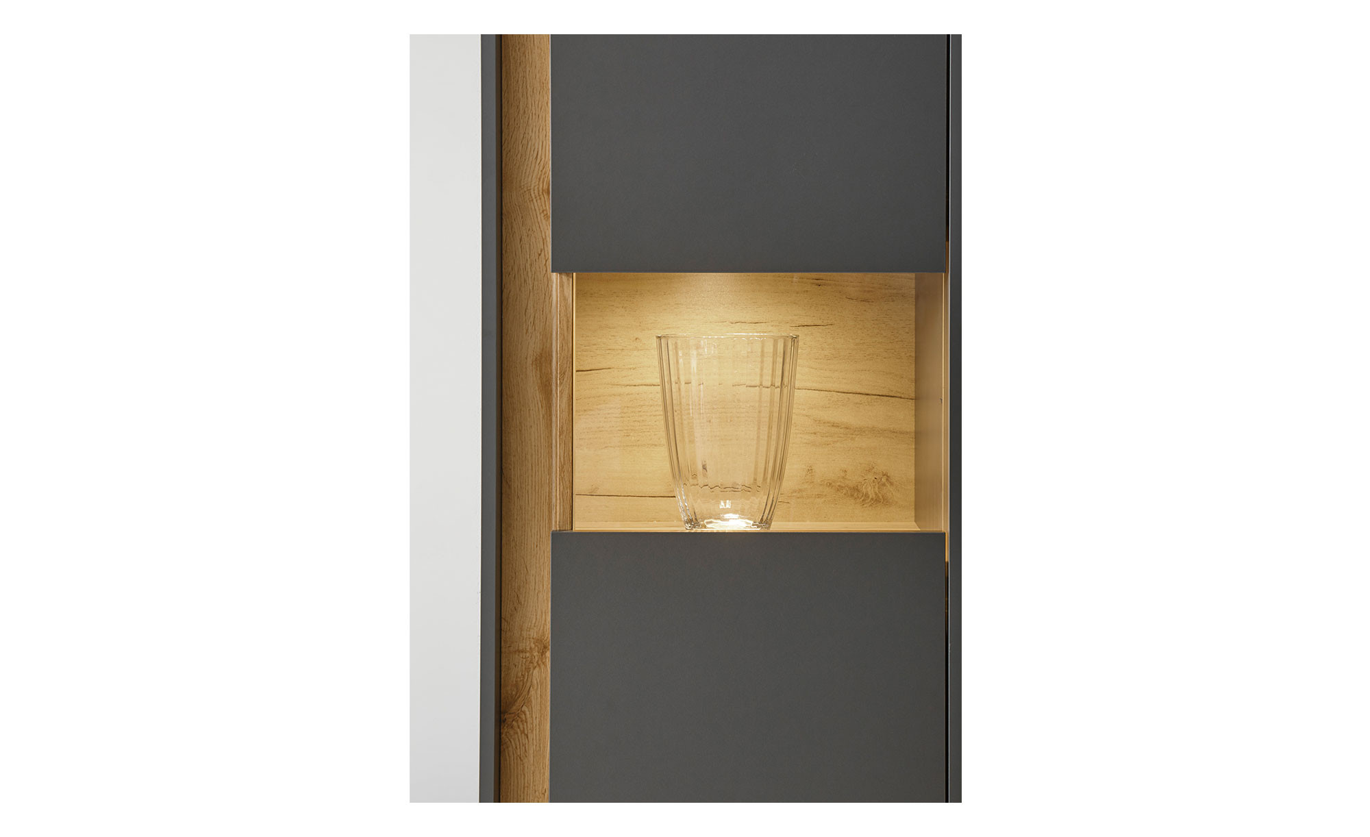 Die wechselseitig montierbare Tür verfügt mittig über einen Glaseinsatz. Durch diesen können Sie nicht nur das Innere der Vitrine bewundern, es entsteht auch ein gelungener Farbmix. Optional ist dieses Fach beleuchtbar, die LEDs dafür erhalten Sie bei uns.
