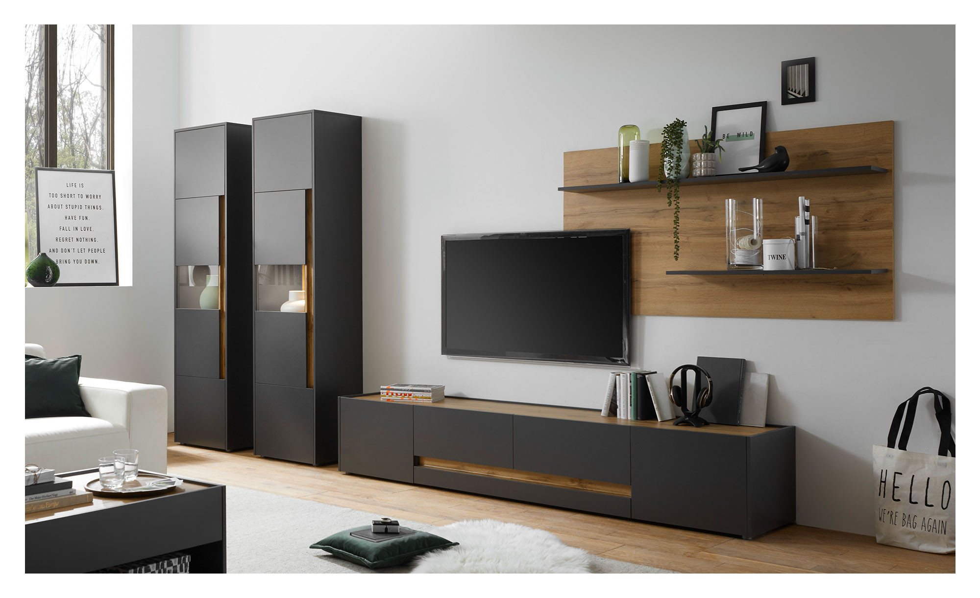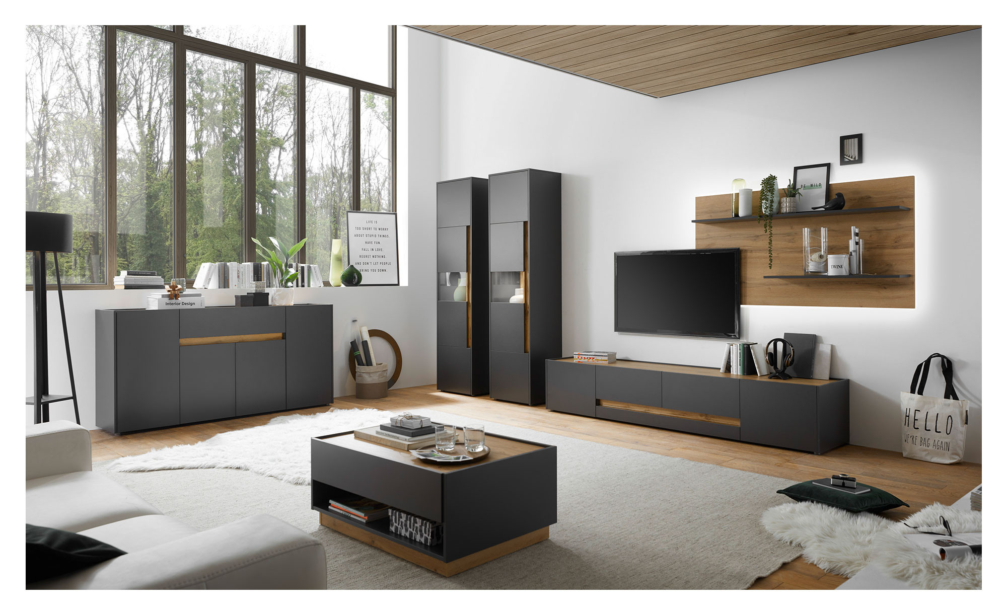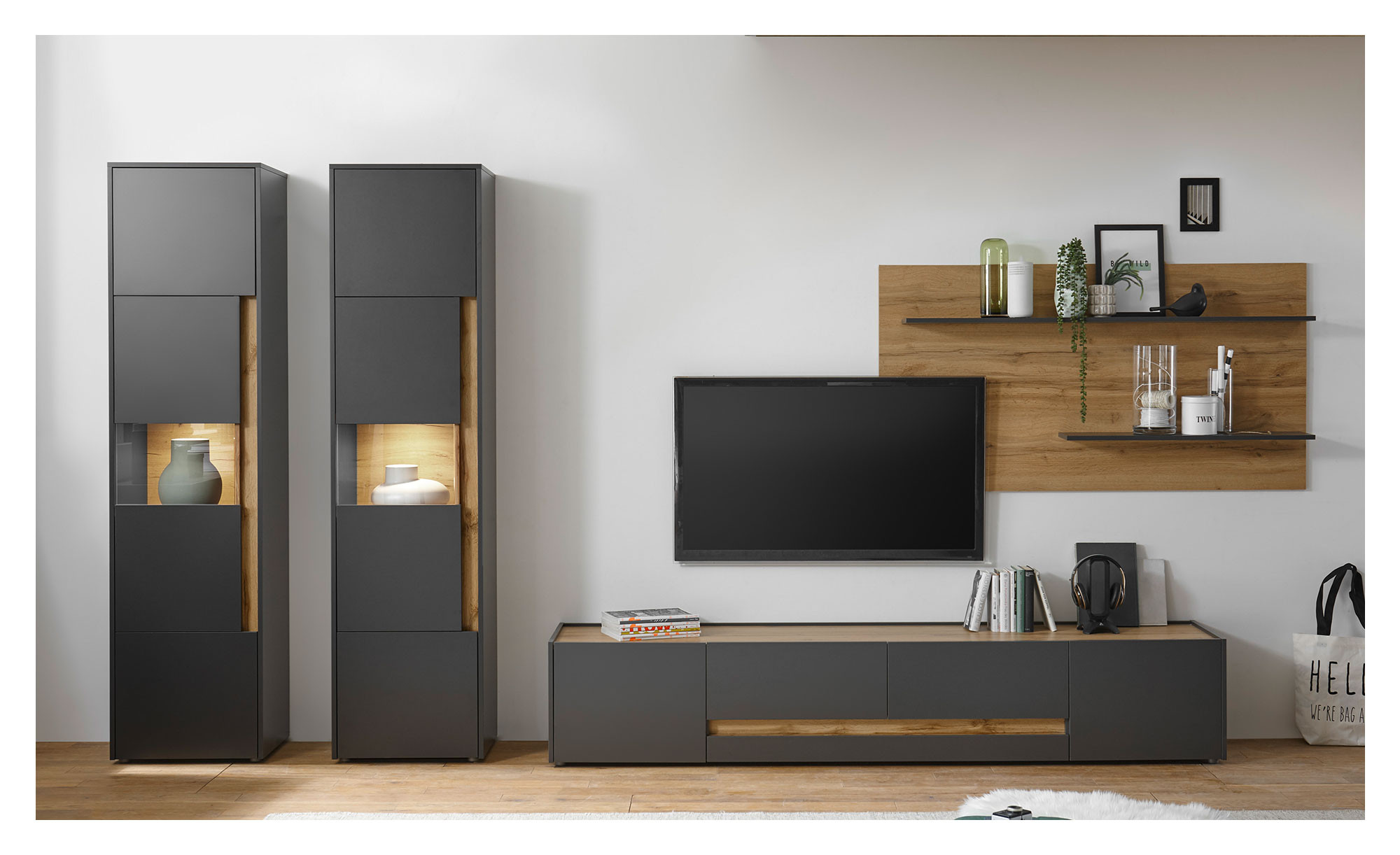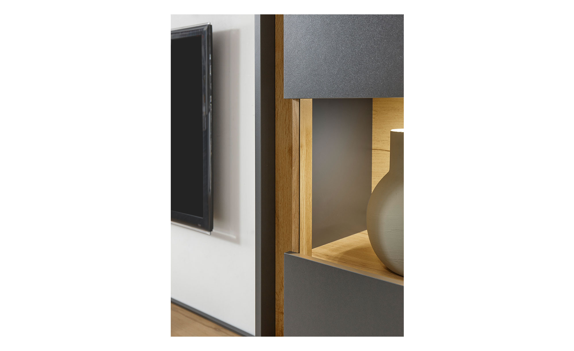 Der Korpus und die Fronten des ca. 50 x 197 x 40 cm großen Schranks wurden in einem stilvollen Anthrazit gehalten. Ihre Beschichtung mit Melaminharz trägt zur Widerstandsfähigkeit bei und verlängert die Lebensdauer merklich. Während die schwarzen Kunststofffüße perfekt ins Bild passen, heben sich die längliche Absetzung an der Front sowie das Innendekor und die Rückwände im Dekor Wotan Eiche auf aufregende Weise ab.