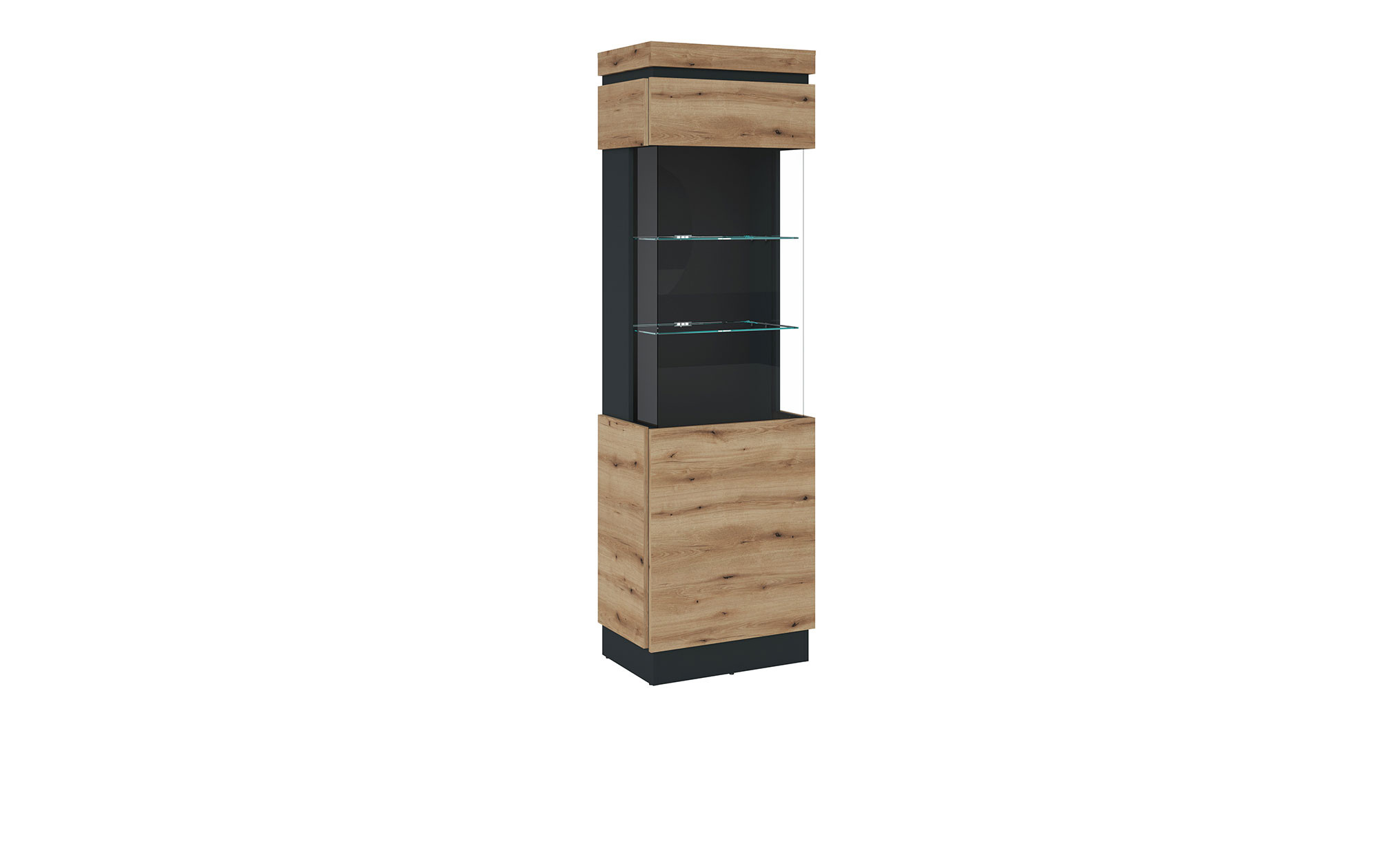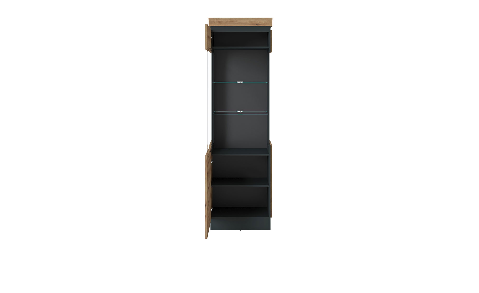 Durchsichtiges Glas gibt einen Blick ins Innere der ca. 60 x 201 x 40 cm großen Vitrine frei. Hinter einer Tür mit Dämpfung und linksseitigem Anschlag erwarten Sie fünf Böden und sechs Fächer. Kleine wie große Gegenstände finden hier Platz.
