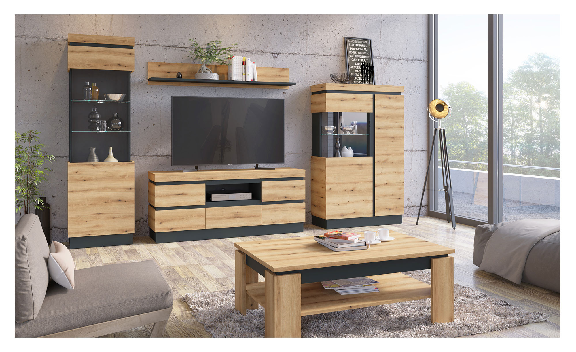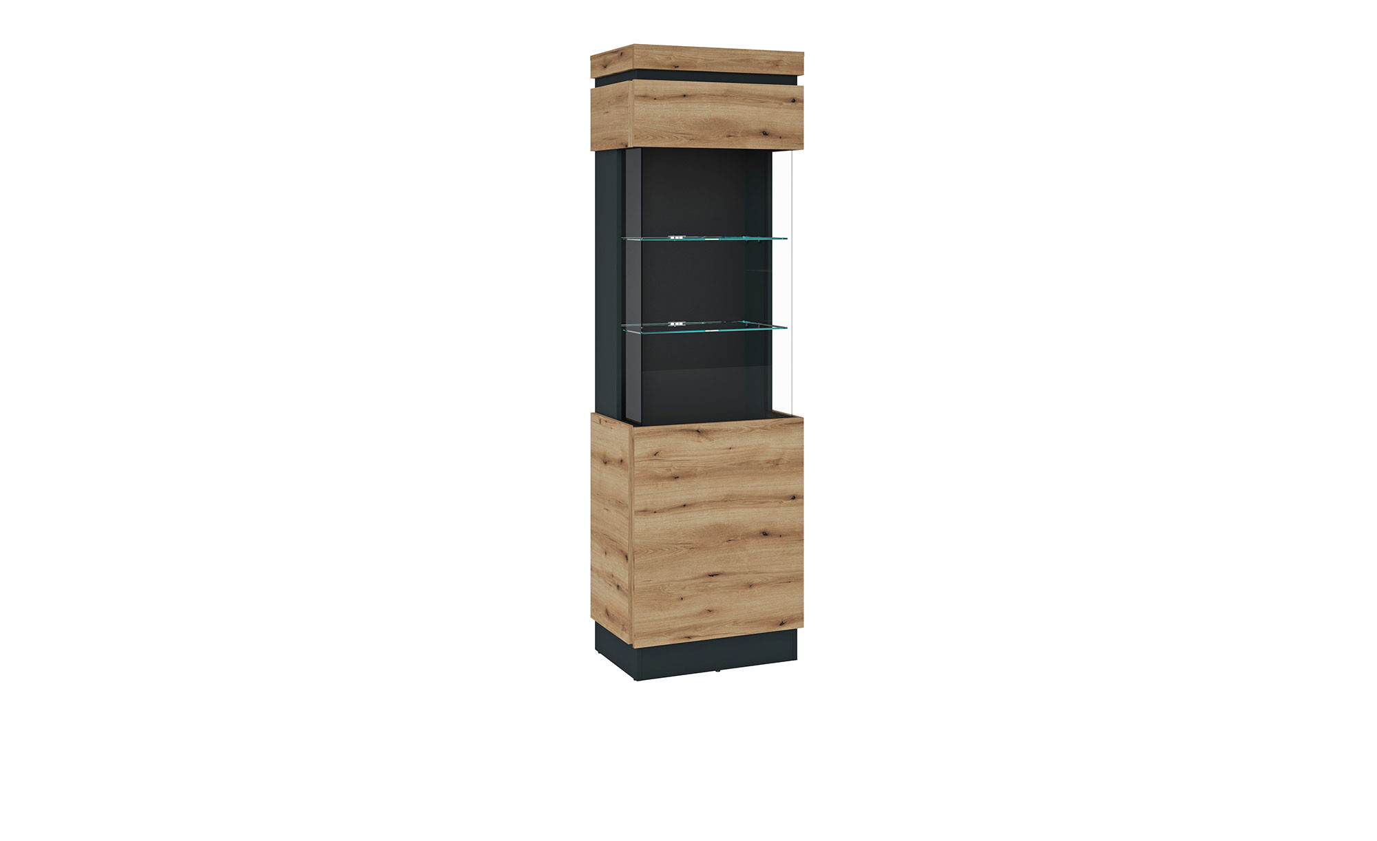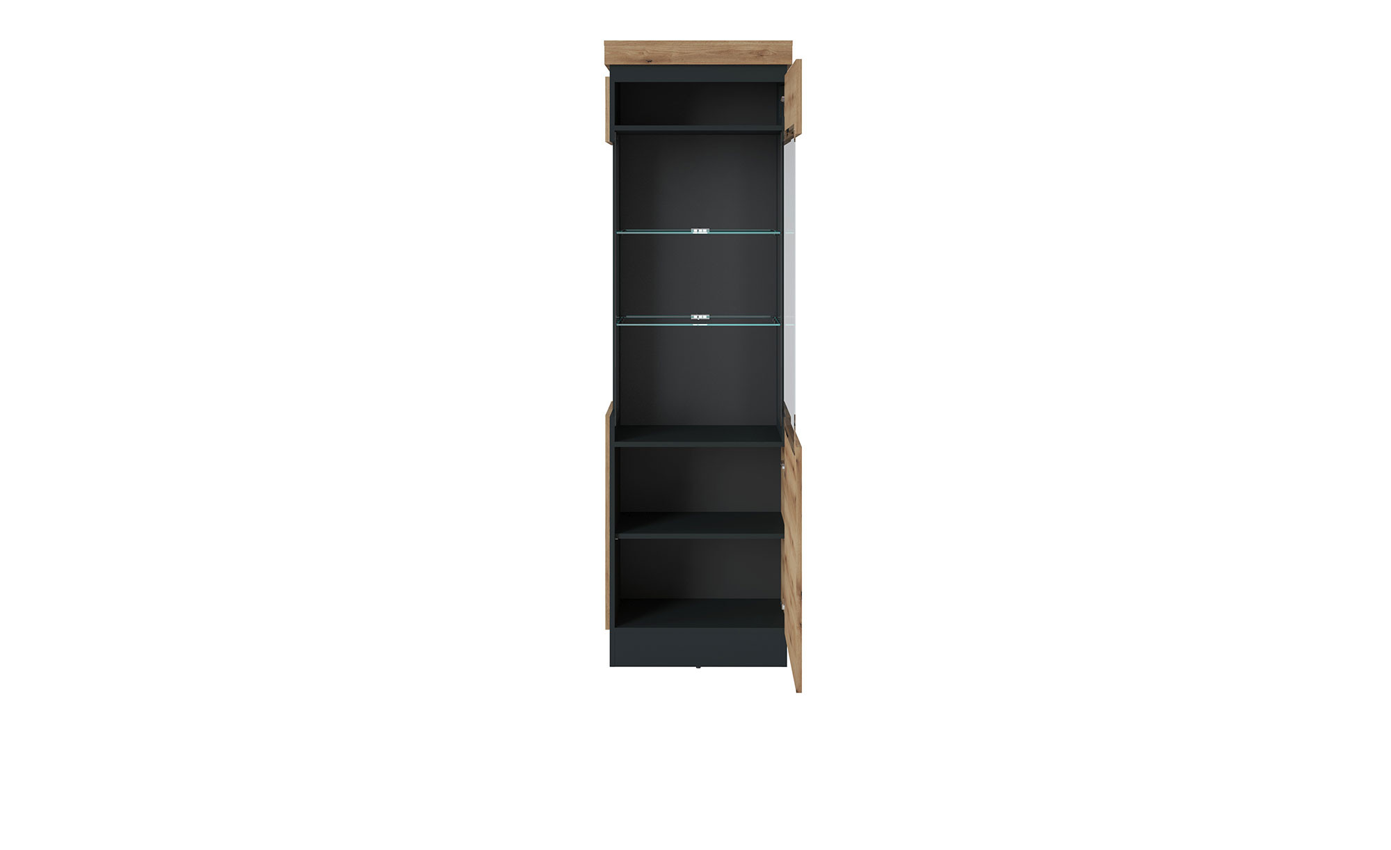 Front und Korpus der ca. 60 x 201 x 40 cm großen Vitrine wurden im Dekor Coast Evoke Eiche gestaltet und mittels einer Melaminharzbeschichtung vor Verschleiß geschützt. Eine Kosmos graue Absetzung, schwarze Rückwände und Füße sowie ein ebensolches Innendekor sorgen für ein zeitgemäßes Flair.