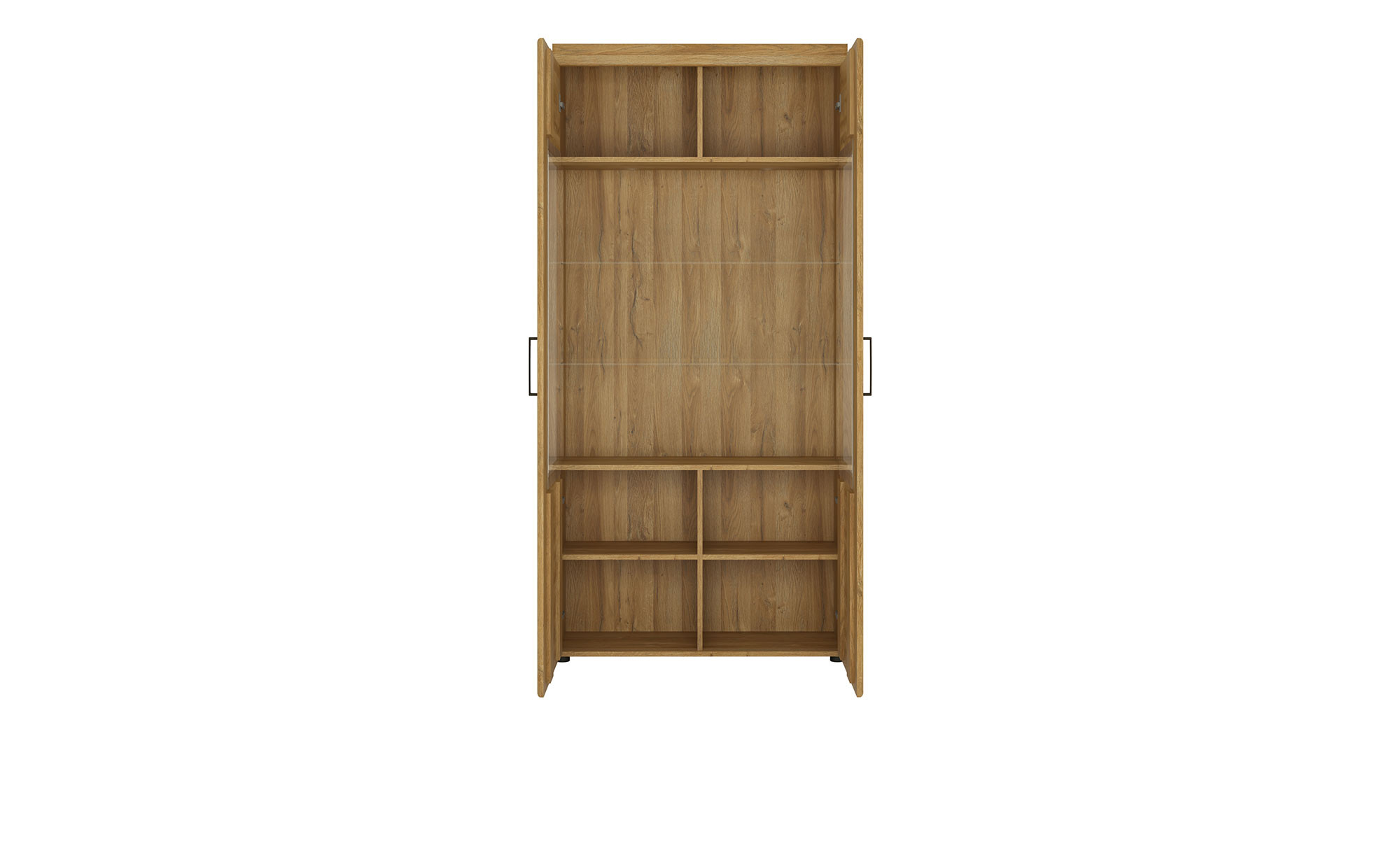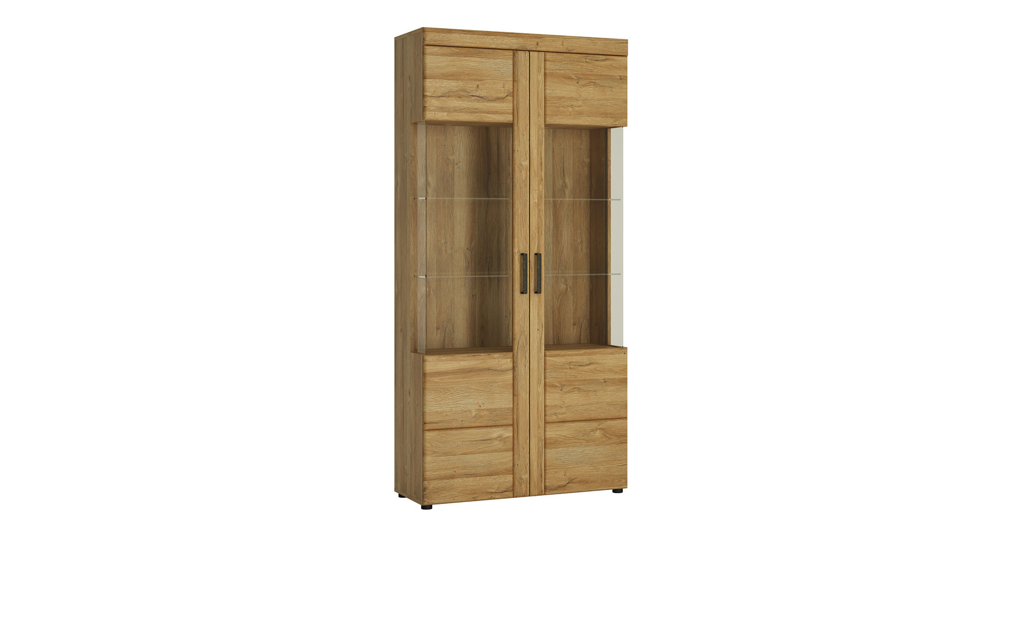 Am Korpus und der Front findet sich das naturnahe Dekor Grandson Eiche, welches einen gemütlichen Charme versprüht. Das Innendekor und die Rückwände wurden hingegen im Wotan Eiche-Look gestaltet. Durch den Glasausschnitt in den Türen werfen Sie einen Blick ins Innere des ca. 93 x 195 x 37 cm großen Schranks und beziehen hier platzierte Utensilien direkt mit in die Raumgestaltung ein. Metallgriffe in antiker Zinn-Optik und schwarze Kunststofffüße verleihen dem Erscheinungsbild schließlich seinen letzten Schliff.