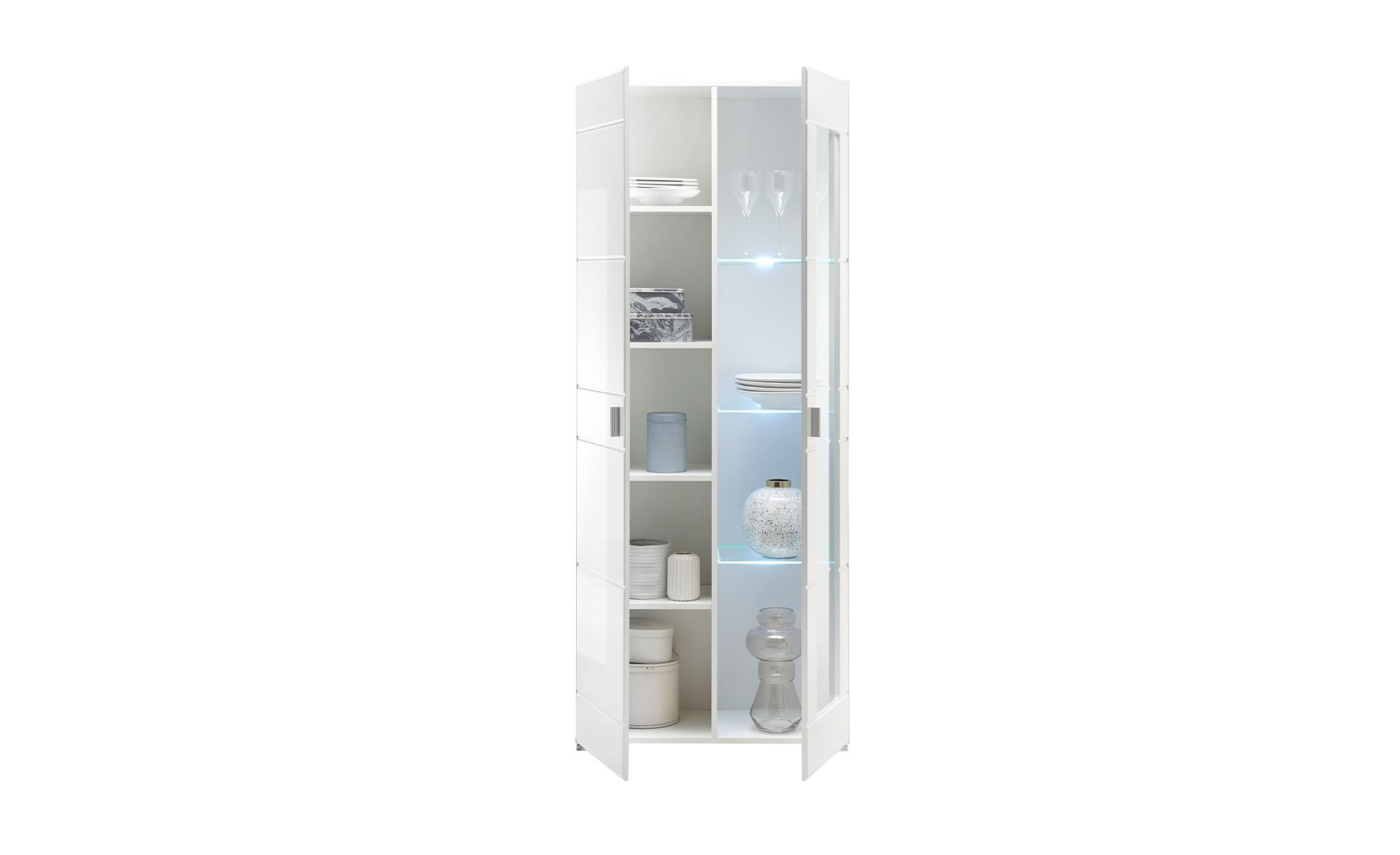 Das Möbelstück misst ca. 79 x 194 x 42 cm und verfügt über einen weißen Korpus aus Holzwerkstoff. Eine Beschichtung aus robustem Melaminharz verhindert zuverlässig einen allzu schnellen Verschleiß. Die Front besteht aus hochglänzendem MDF und ist ebenfalls in Weiß gehalten. Auch das Innendekor, das Sie durch die Klarglas-Einsätze zum Teil bereits von außen sehen können, passt sich dem Farbschema an. Hier sorgt eine LED-Beleuchtung zusätzlich für eine ansprechende Lichtstimmung.