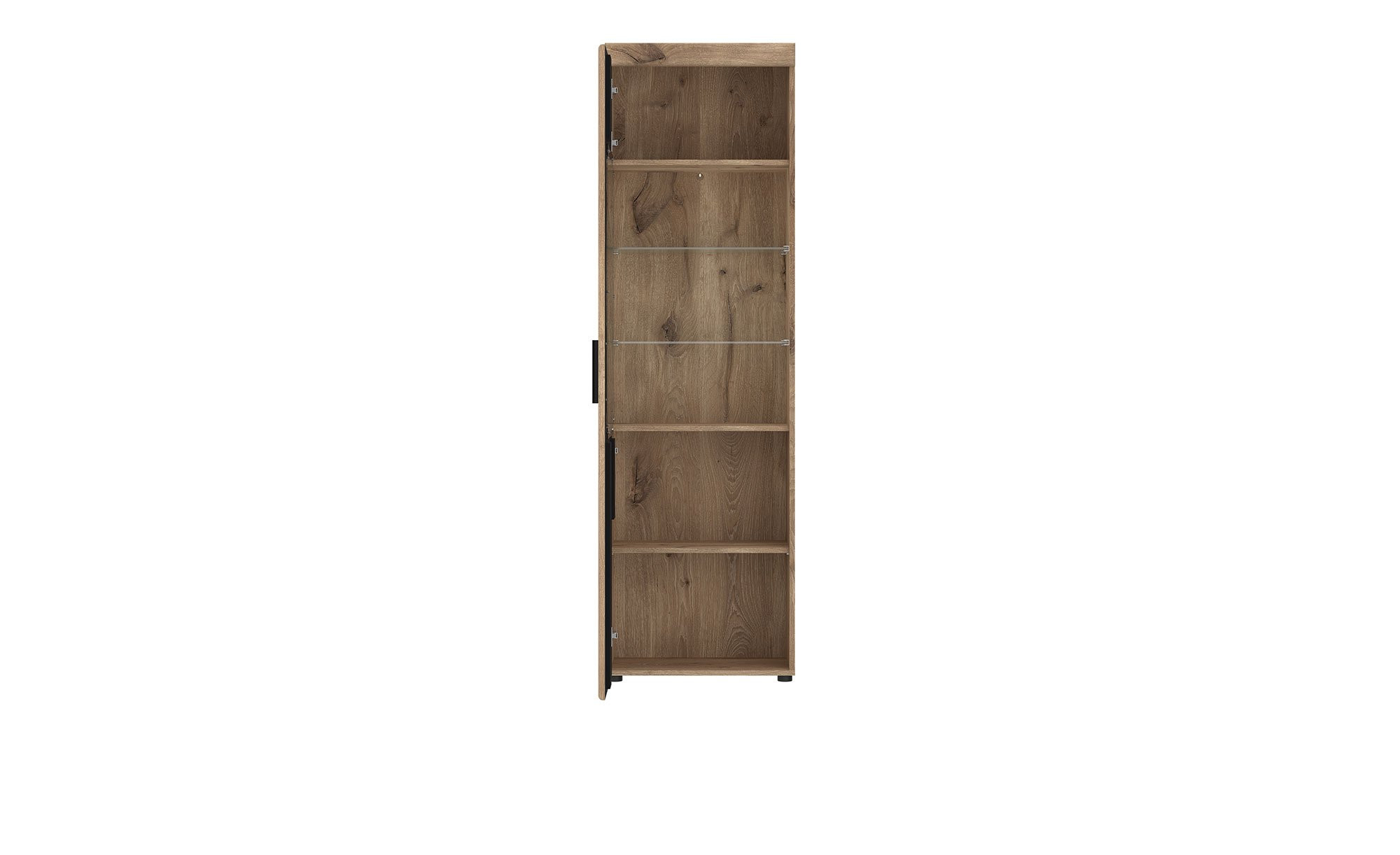 Das Möbelstück ist ca. 58 x 195 x 37 cm groß und besteht aus Holzwerkstoff. Es begeistert mit einer modernen Farbkombination; Front und Korpus sind im Dekor Viking Eiche gehalten, die Absetzung hingegen in Kosmos Grau. Eine Beschichtung mit Melaminharz beugt zuverlässig Verschleiß vor. Durch einen großzügigen Klarglas-Einsatz können Sie zudem bereits von außen einen Blick ins Innere des Artikels werfen.