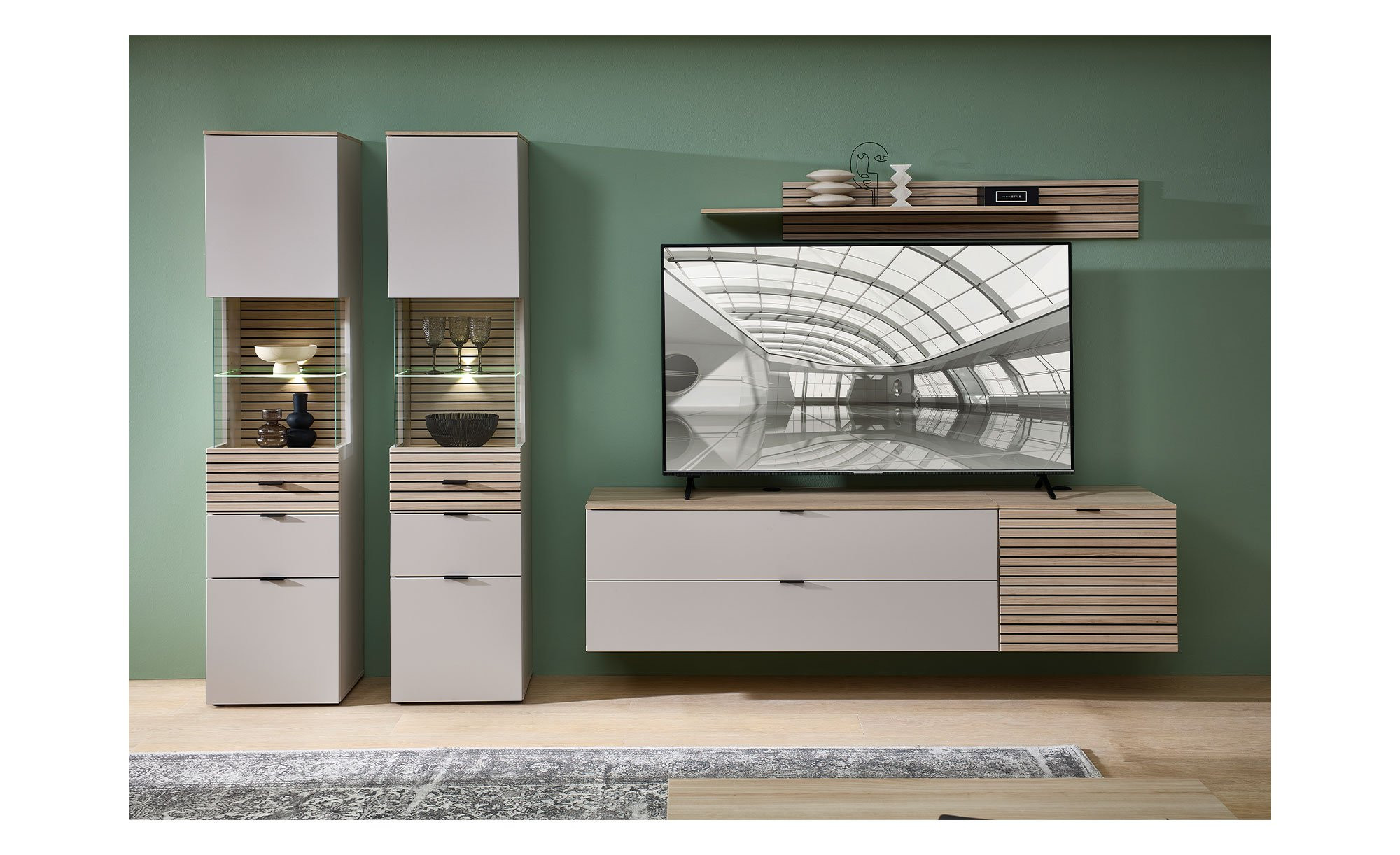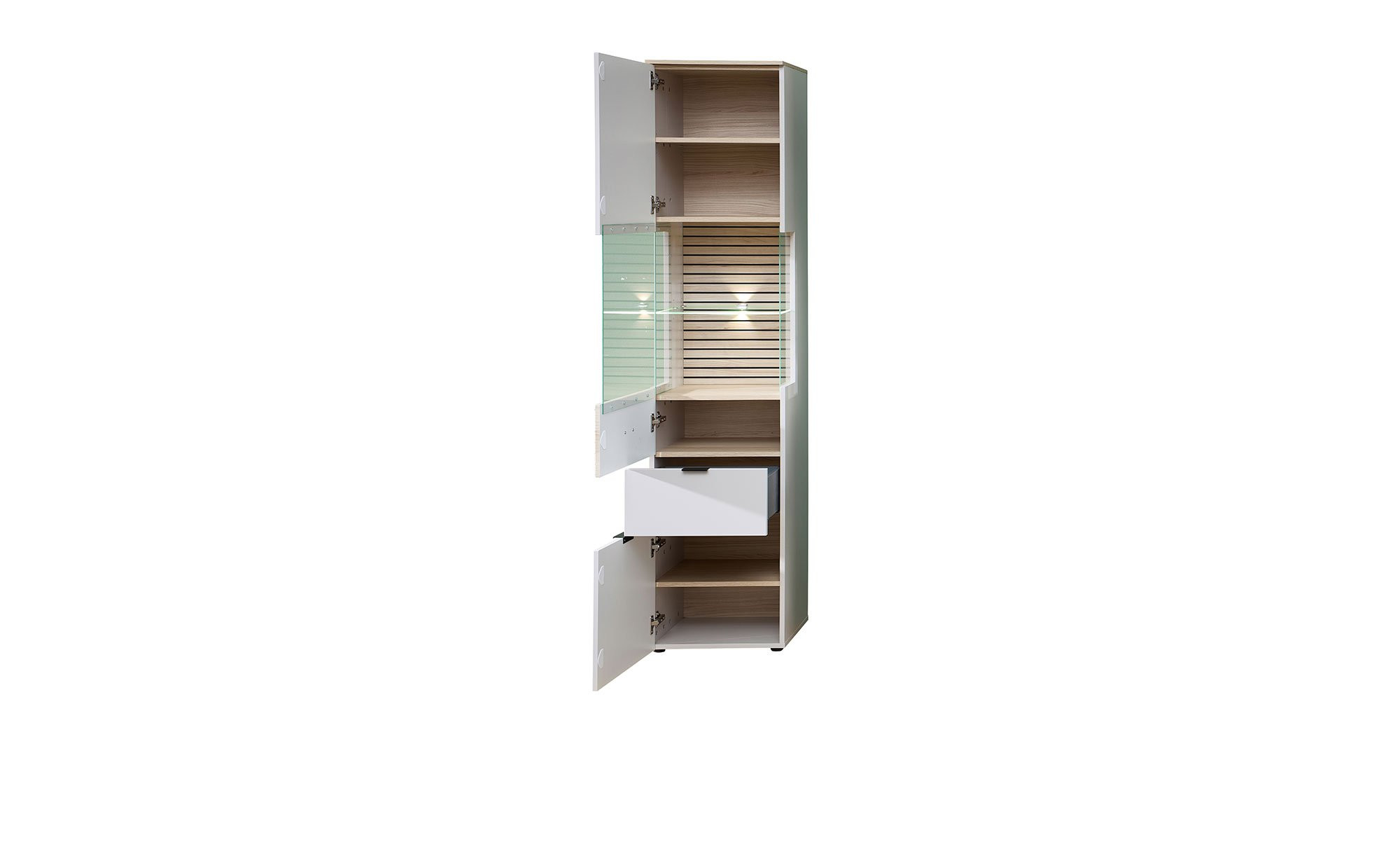 Dank eines Klarglas-Ausschnitts in der Mitte der Front und an den Seiten können Sie bereits von außen einen Blick ins Innere des Artikels werfen. An dieser Stelle wurde ein Glasboden integriert, ansonsten gibt es vier Holzböden. Eine LED-Beleuchtung setzt ausgestellte Gegenstände perfekt in Szene.