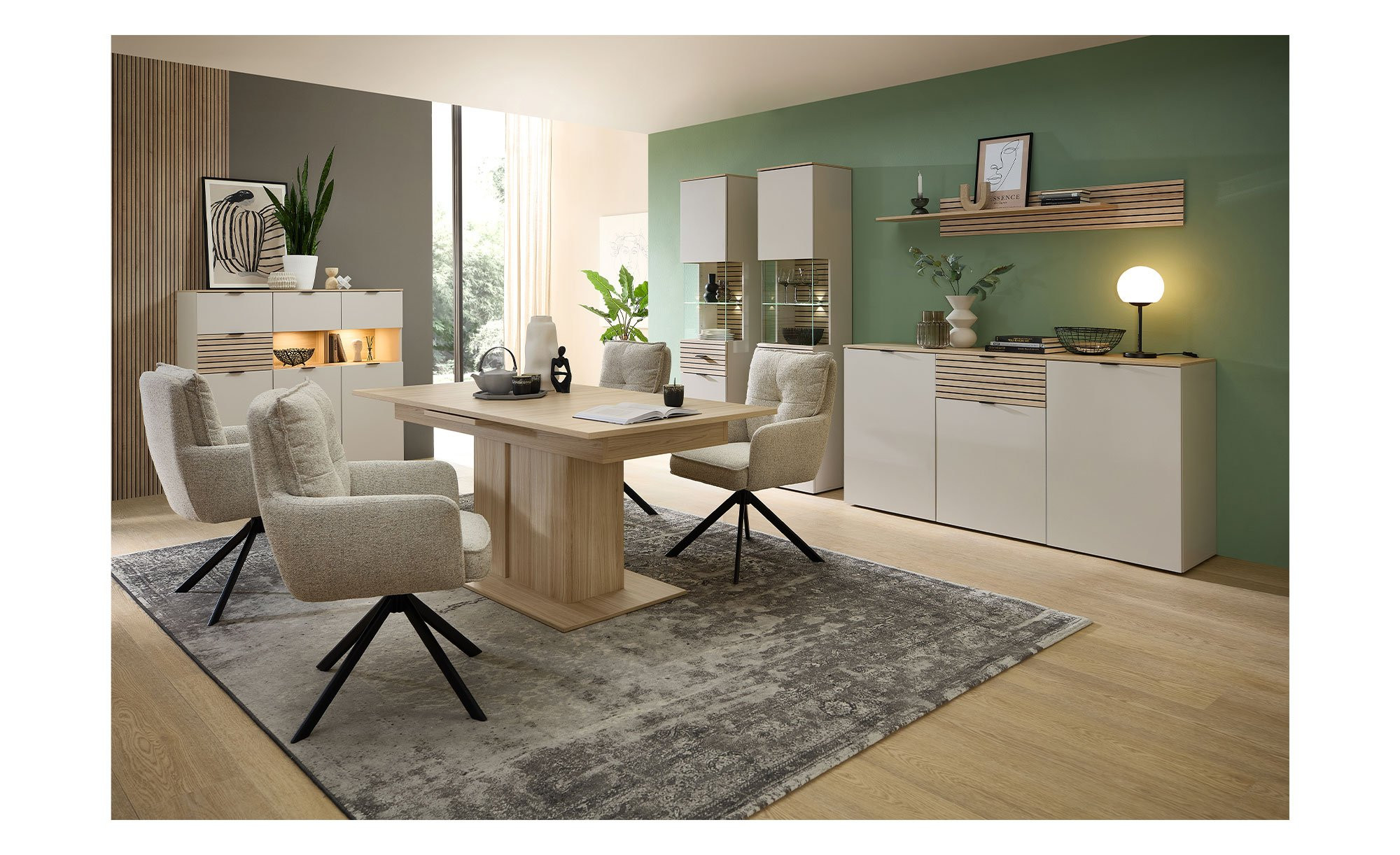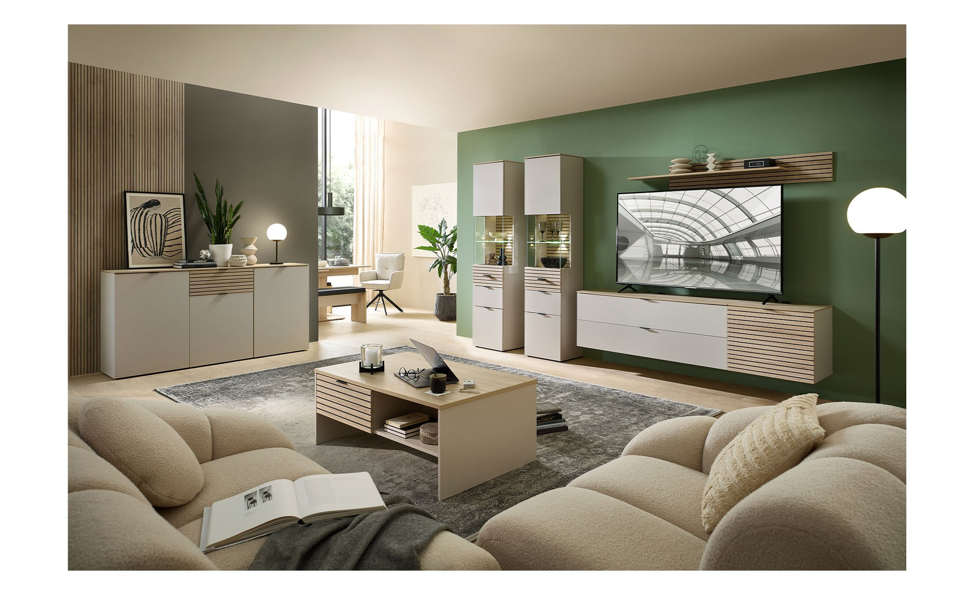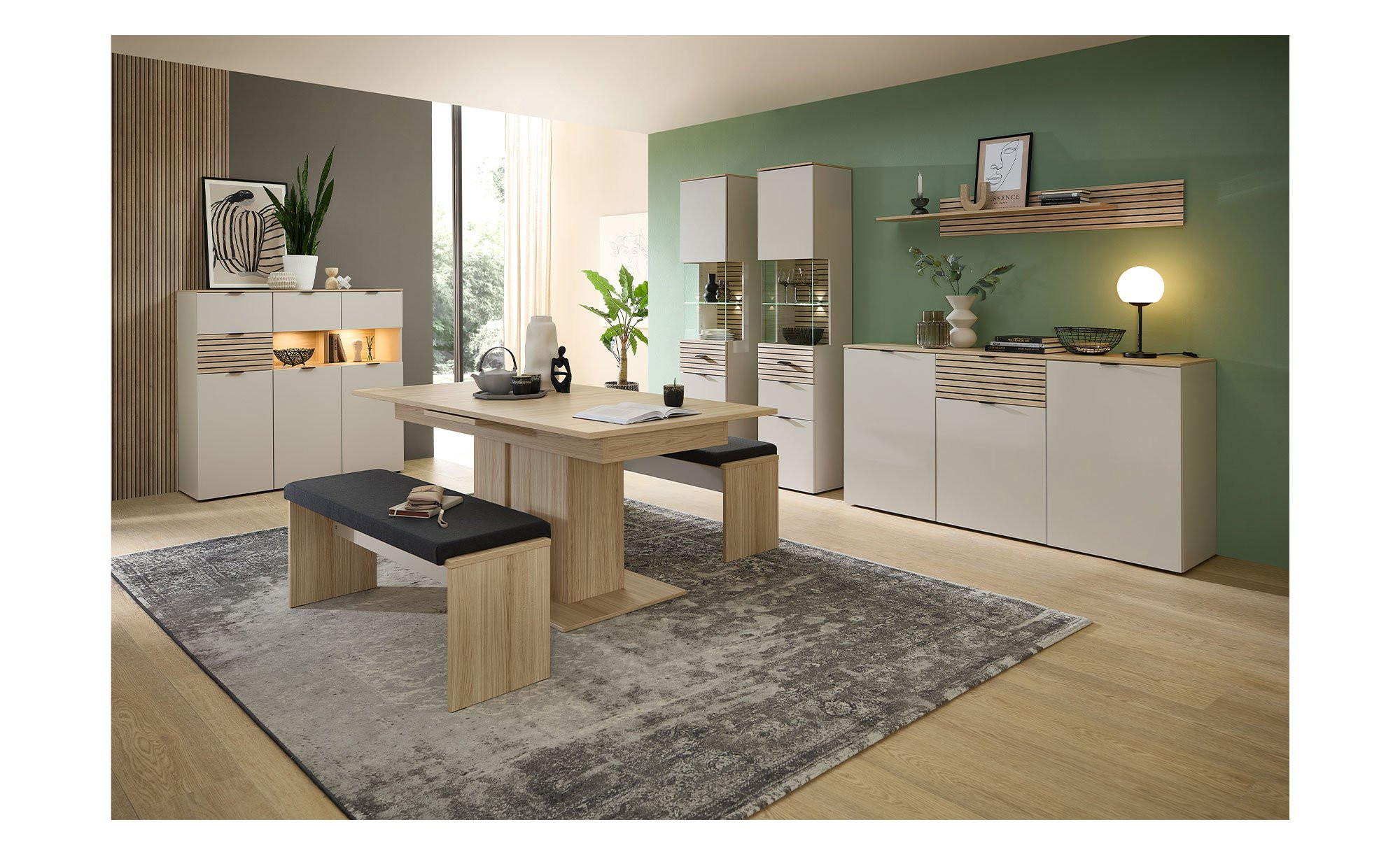 Das Möbelstück misst ca. 45 x 200 x 36 cm und besteht aus Holzwerkstoff in einem modernen Kaschmir-Ton. An der supermatten Vorderseite und an Teilen der Rückwand begeistert zudem eine Eiche Riva-Nachbildung in Leisten-Optik. Auch der Oberboden trägt dieses Dekor. Kunststoffgleiter fungieren als Füße, zudem wurden Metallgriffe in mattem Schwarz integriert.
