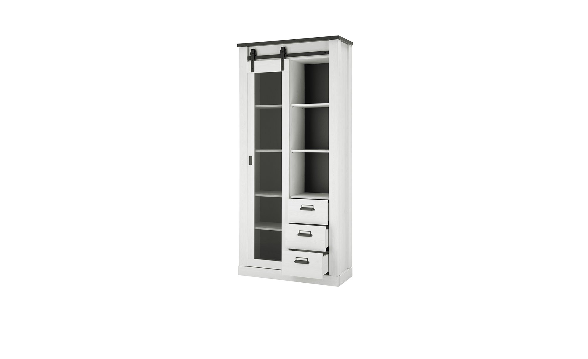 Die Vitrine hat Maße von ca. 93 x 201 x 38 cm und ist in einem Pinie weiß-Dekor gestaltet. Der Korpus und die Front bestehen aus Holzwerkstoff und sind mit einer Melaminbeschichtung versehen, die vor Verschleiß schützt. Die Anthrazit-Farbe der Applikationen und der Rückwand sowie die schwarzen Metallgriffe setzen stilvolle Akzente und passen perfekt zum Gesamtbild.