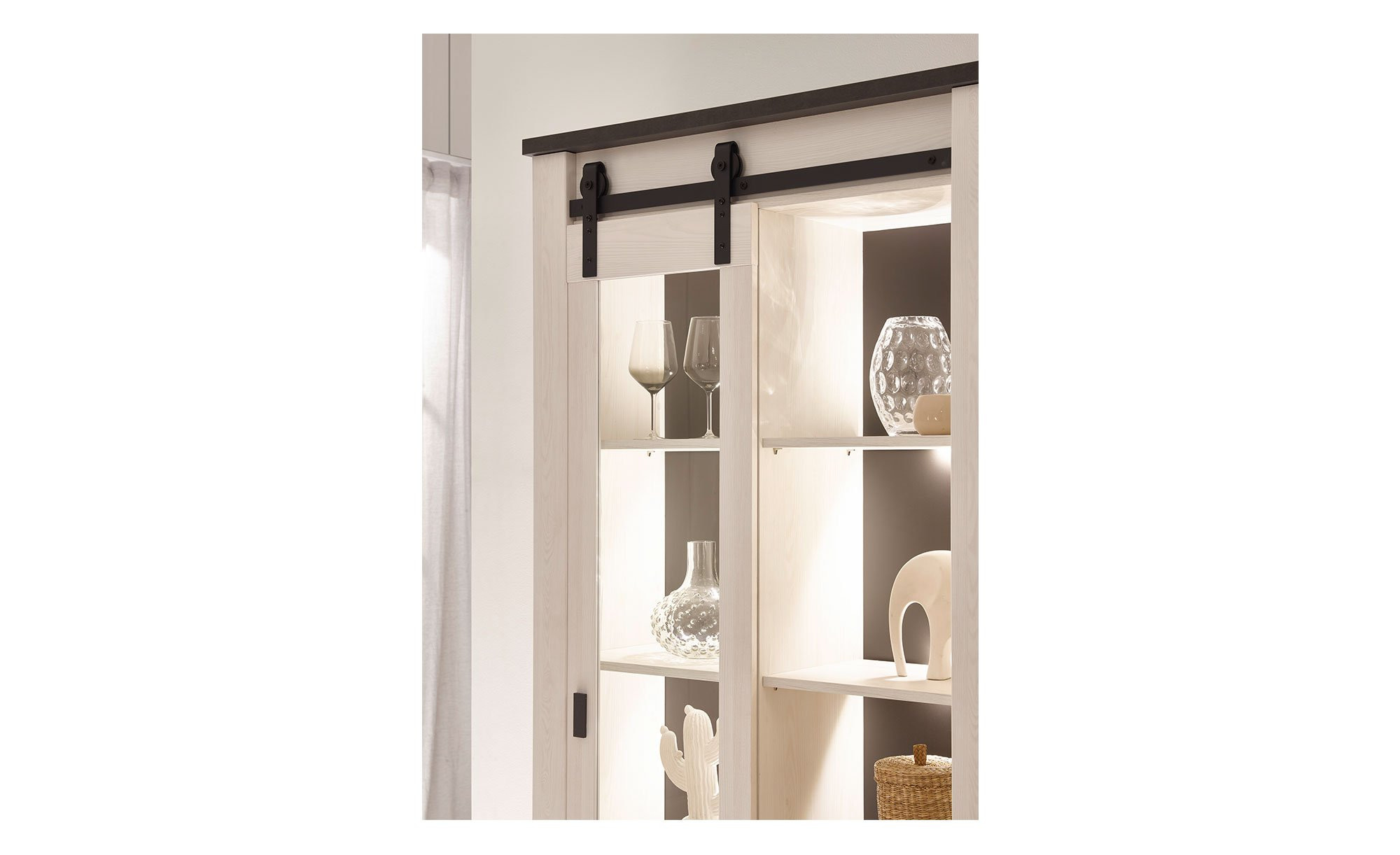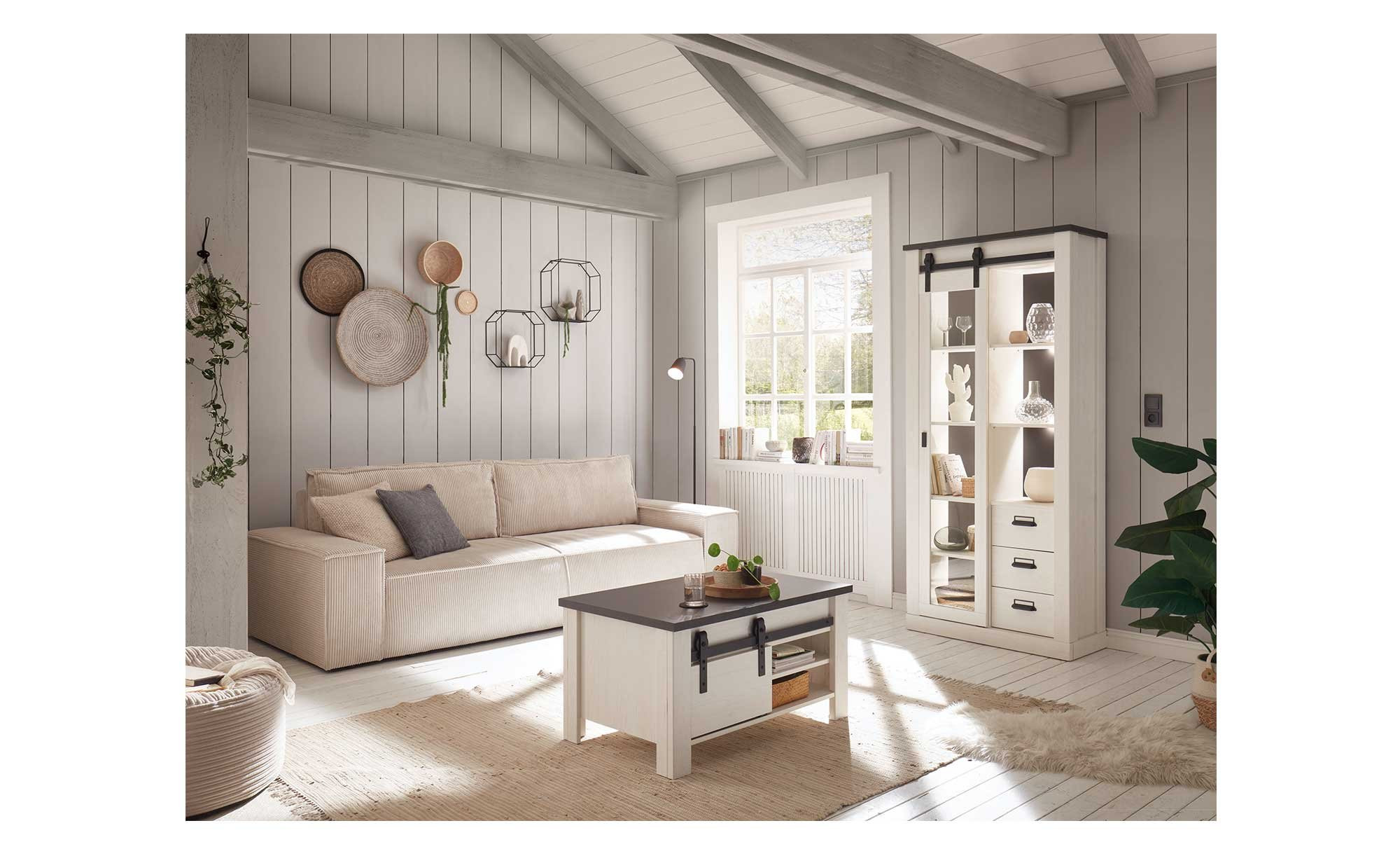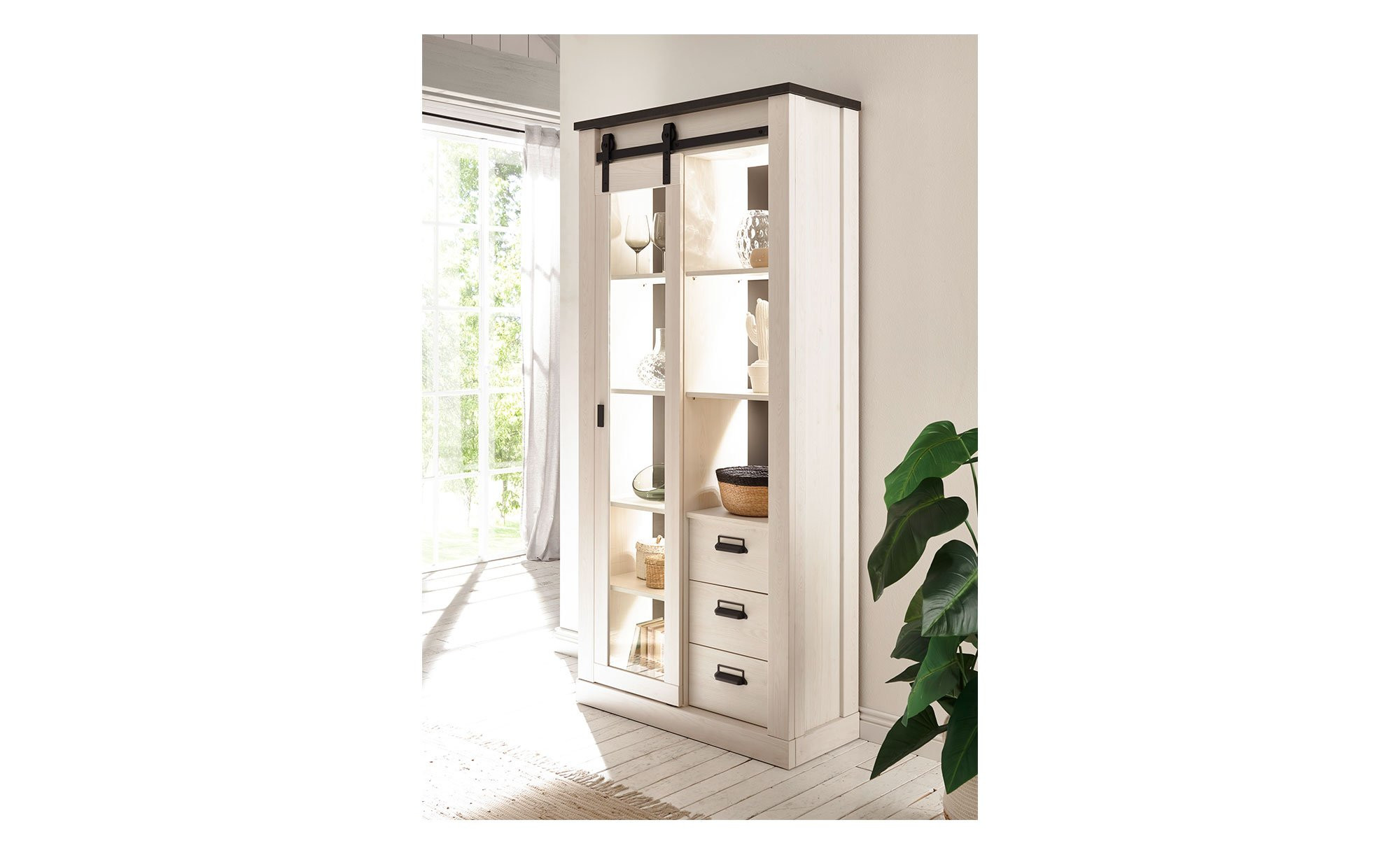 Die Vitrine Shilo ist ein Möbelstück im modernen Landhausstil und verleiht Ihrem Zuhause eine gemütliche Atmosphäre.