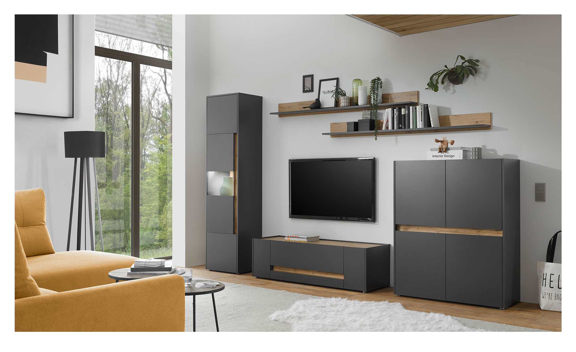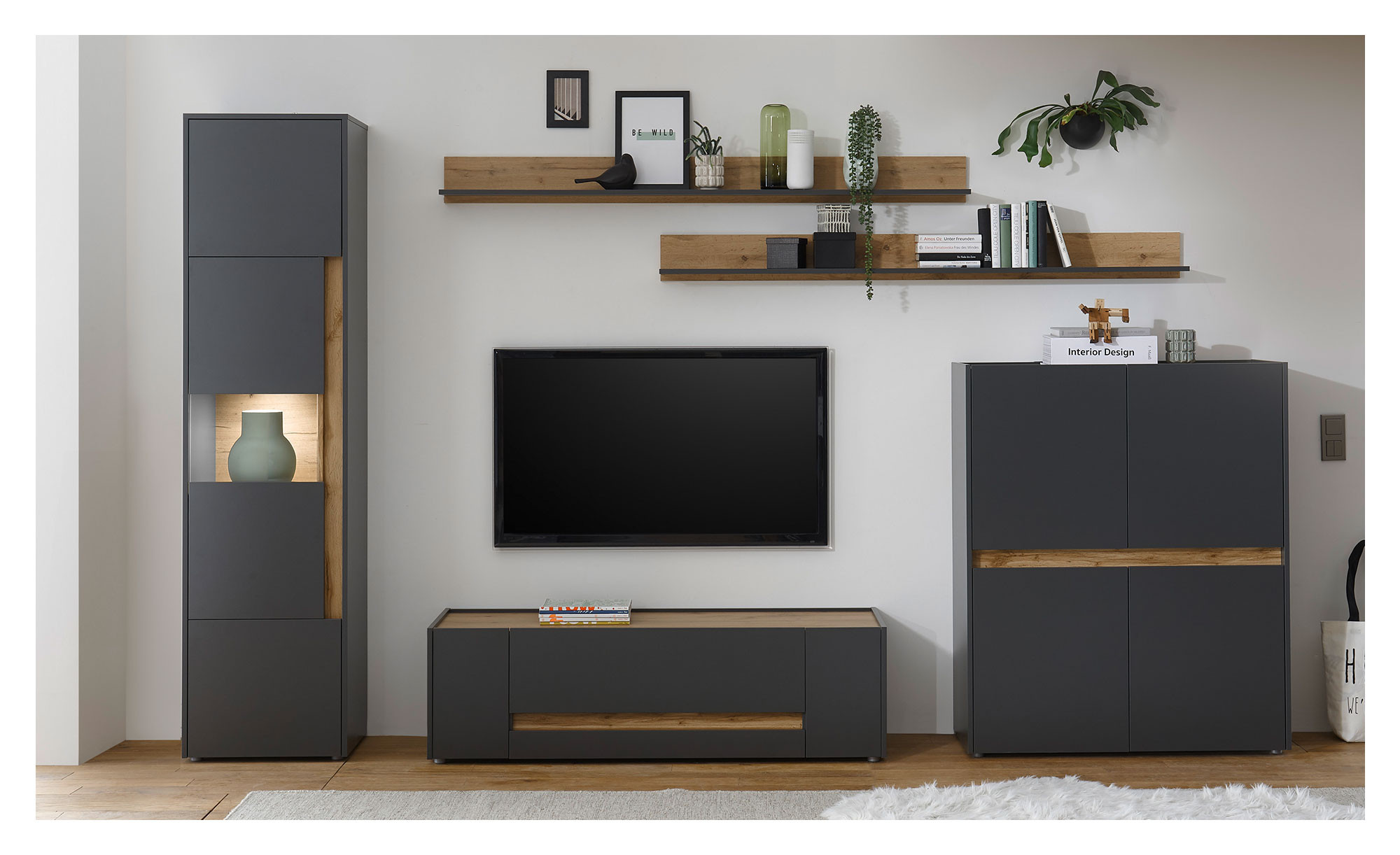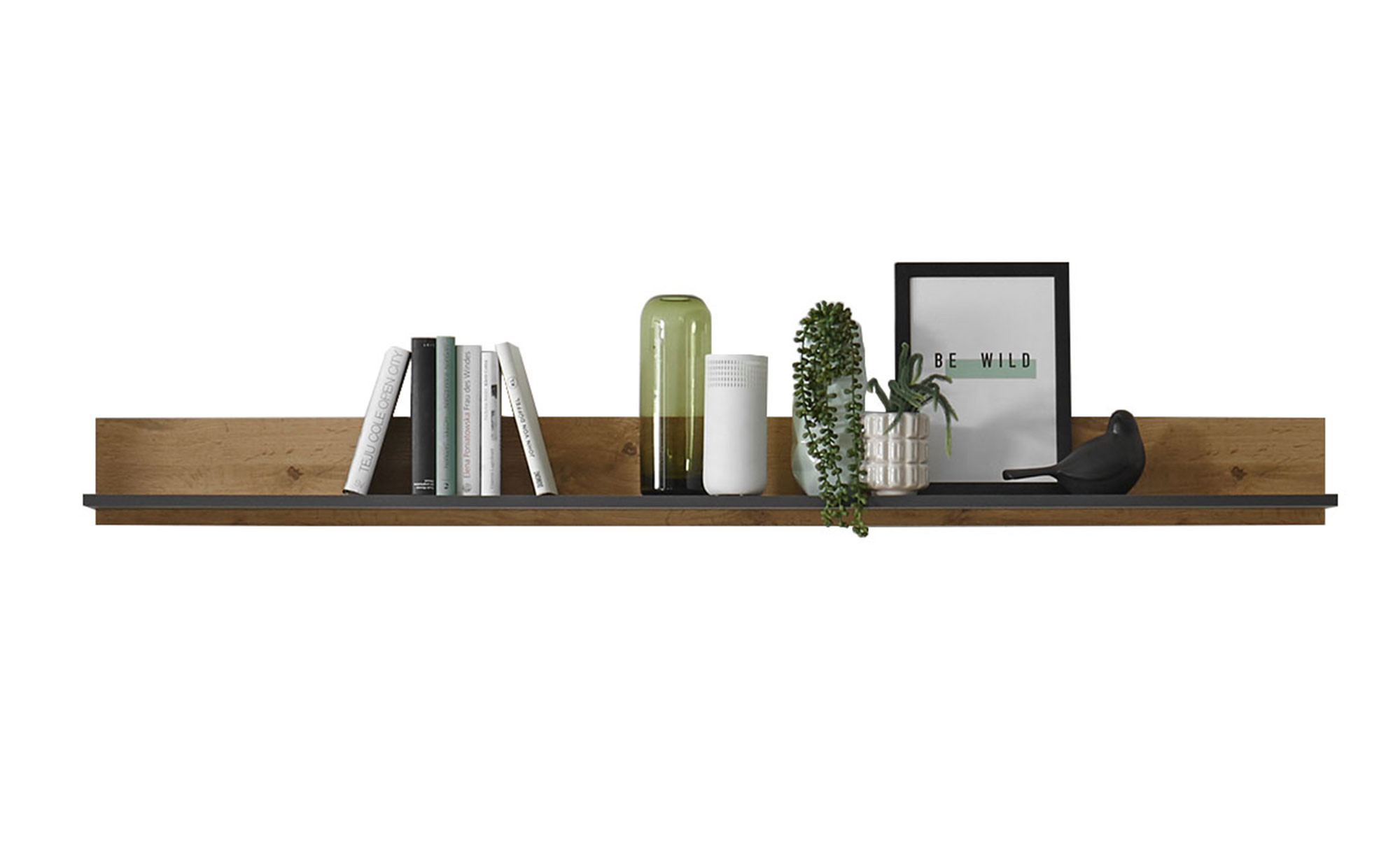 Das ca. 170 x 15 x 20 cm große Board im Dekor Wotan Eiche wurde an den Oberflächen mit Melaminharz beschichtet. Dieses macht diese widerstandsfähig gegenüber Kratzern und ist zudem leicht zu reinigen. Auf einem anthrazitfarbenen Boden finden diverse kleinere Gegenstände Platz.