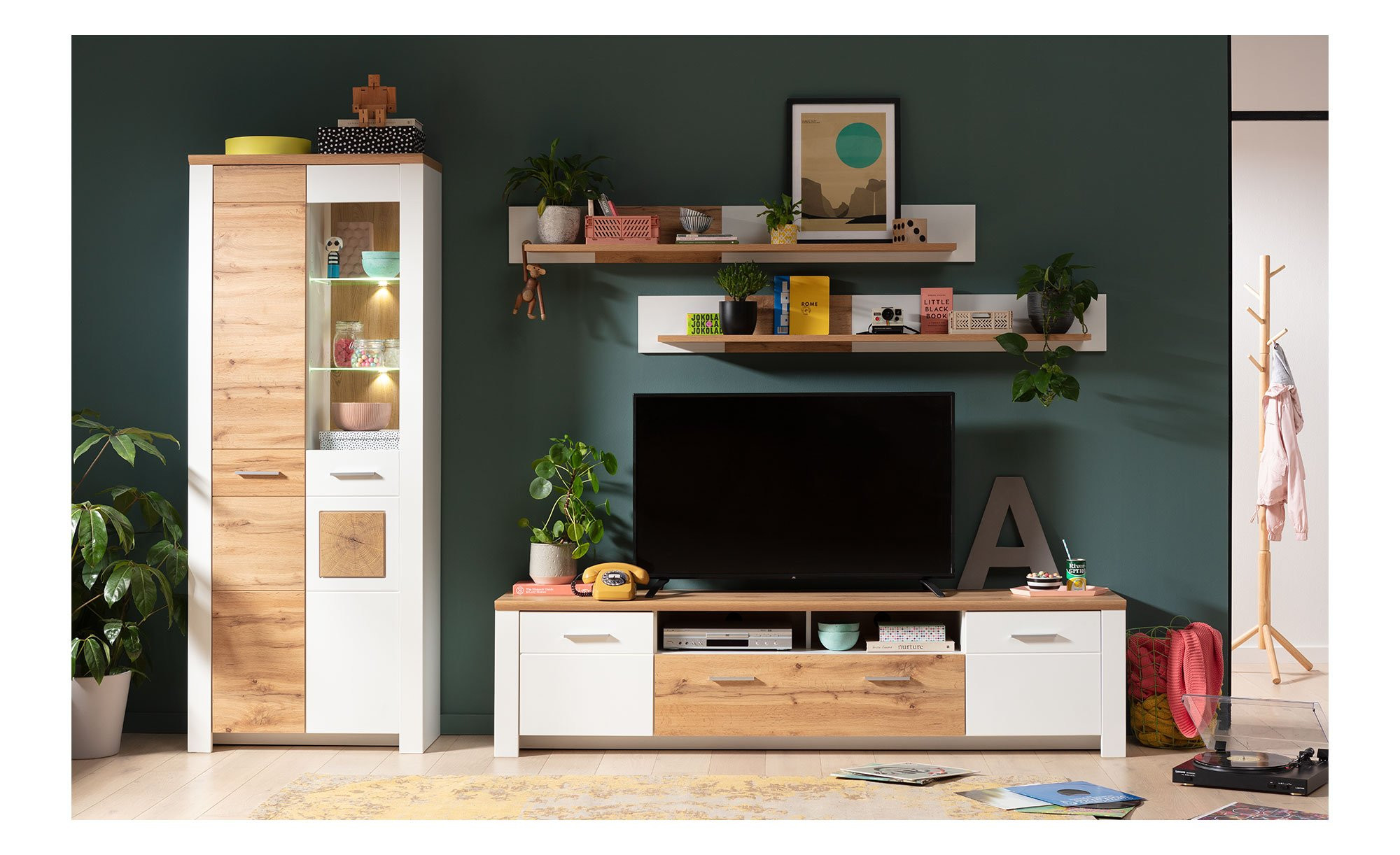 Das ca. 164 x 20 x 22 cm große Möbelstück begeistert mit seinem modernen Design. Es besteht aus MDF und ist in einem supermatten Weiß gestaltet. Als besondere Hingucker fungieren die zusätzlichen Absetzungen mit Nachbildungen im Dekor Eiche Altholz und Hirnholz.