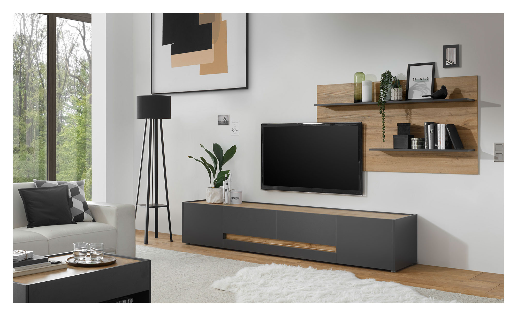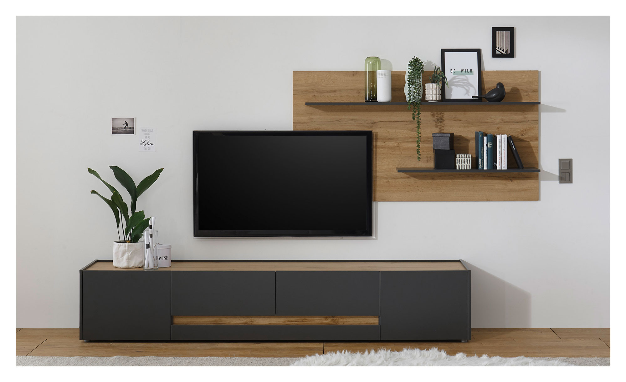 Ein ca. 155 x 80 x 20 cm großer Korpus bildet die Basis des Paneels. Er zieht dank seines Wotan Eiche-Dekors alle Blicke auf sich und versprüht ein herrlich naturnahes Flair. Die Melaminharzbeschichtung schützt vor Kratzern und ist leicht zu reinigen.