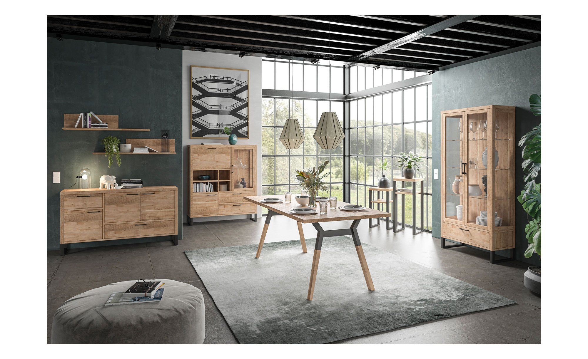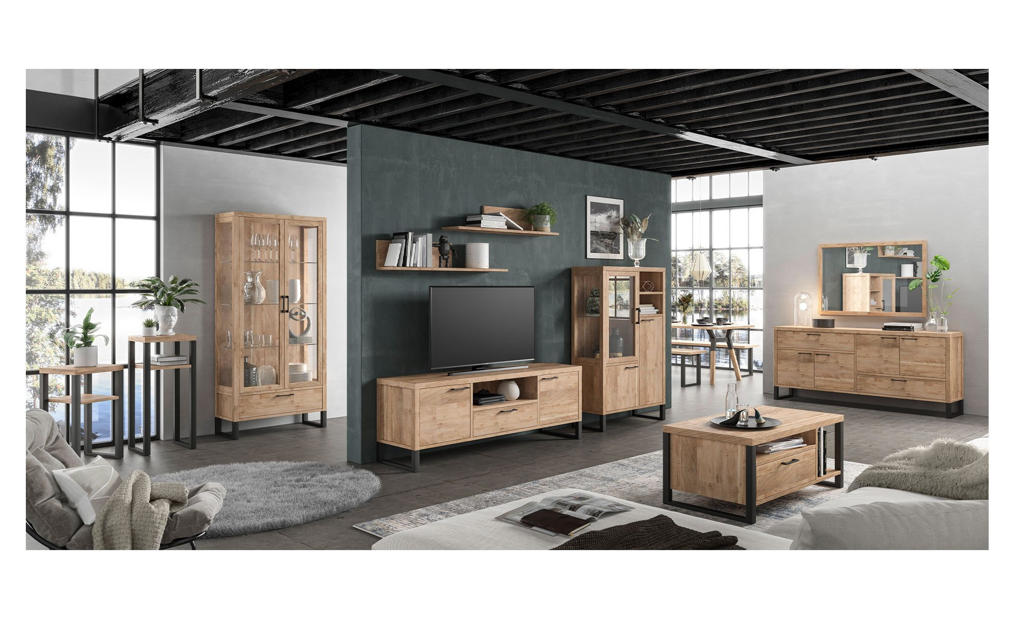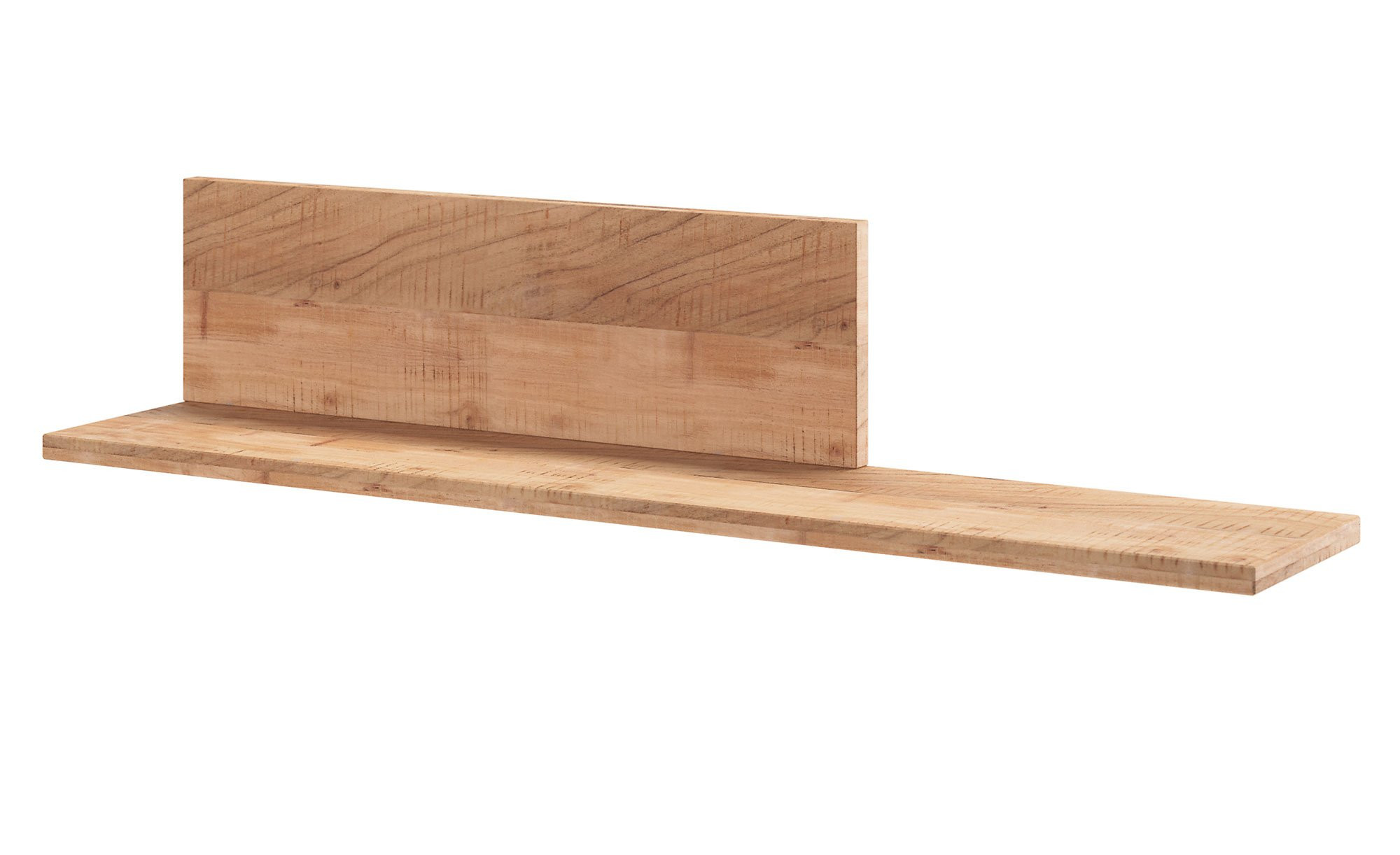 Front und Korpus des ca. 110 x 22 x 22 cm großen Regals bestehen aus Akazienholz. Durch die sägeraue Oberfläche versprüht das linksbündige Möbelstück einen ganz besonderen Charme.