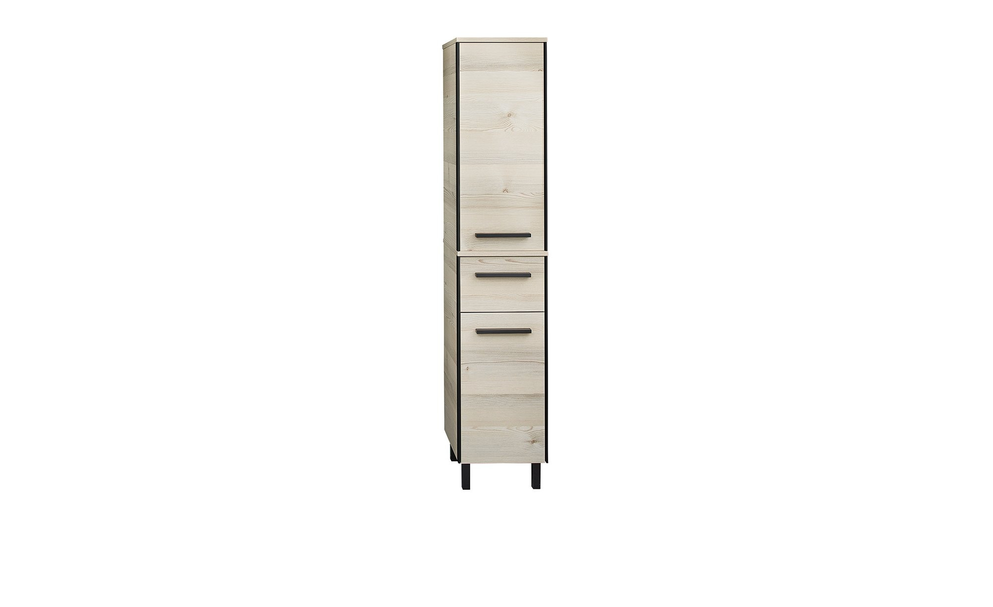 Sowohl der Korpus als auch die Front des ca. 30 x 70 x 33 cm großen Möbels wurden in einer Polar Pinie quer Nachbildung gestaltet. Hinzu kommen ein schwarzes L-Profil am Korpus sowie matt-schwarze Griffe.