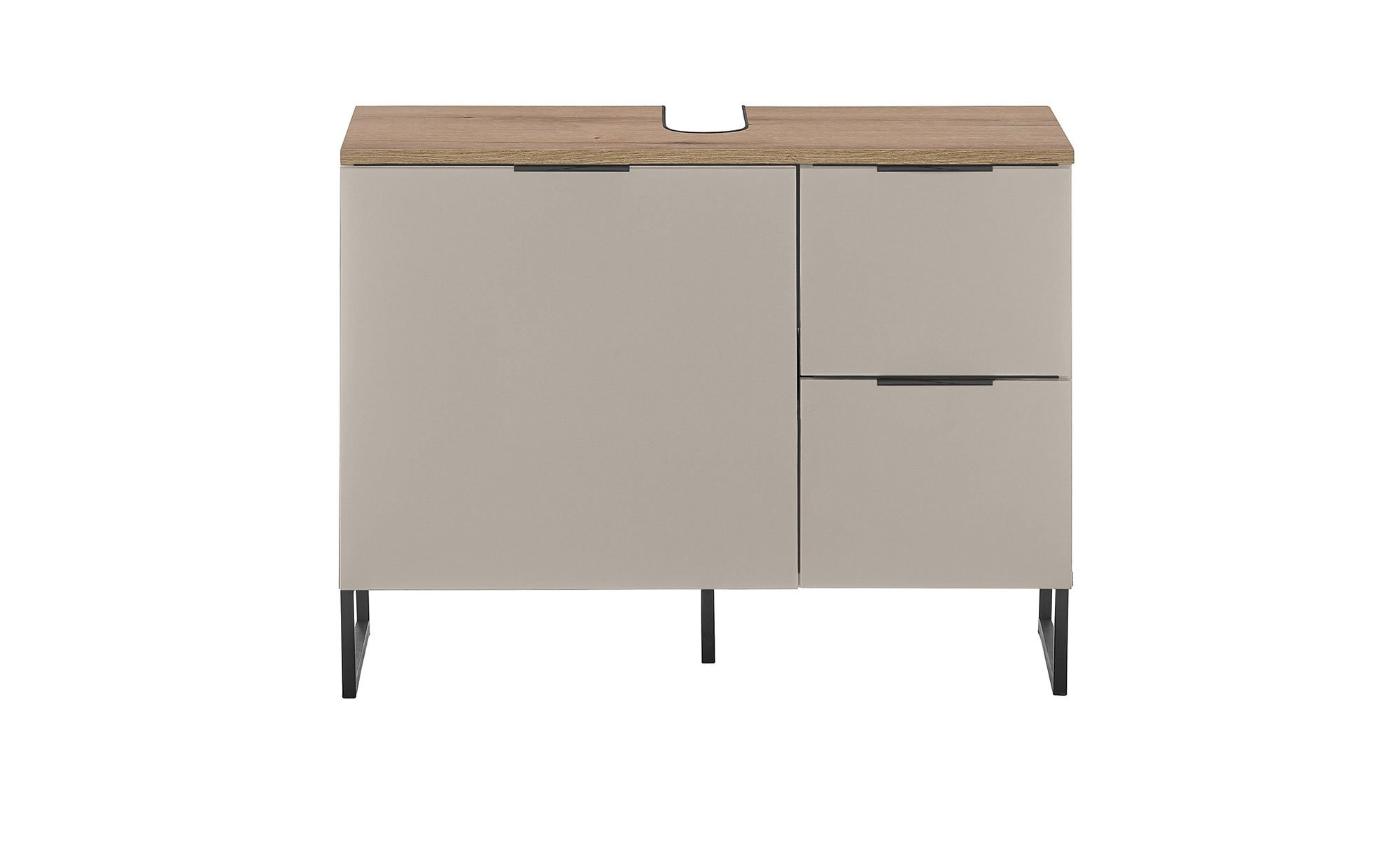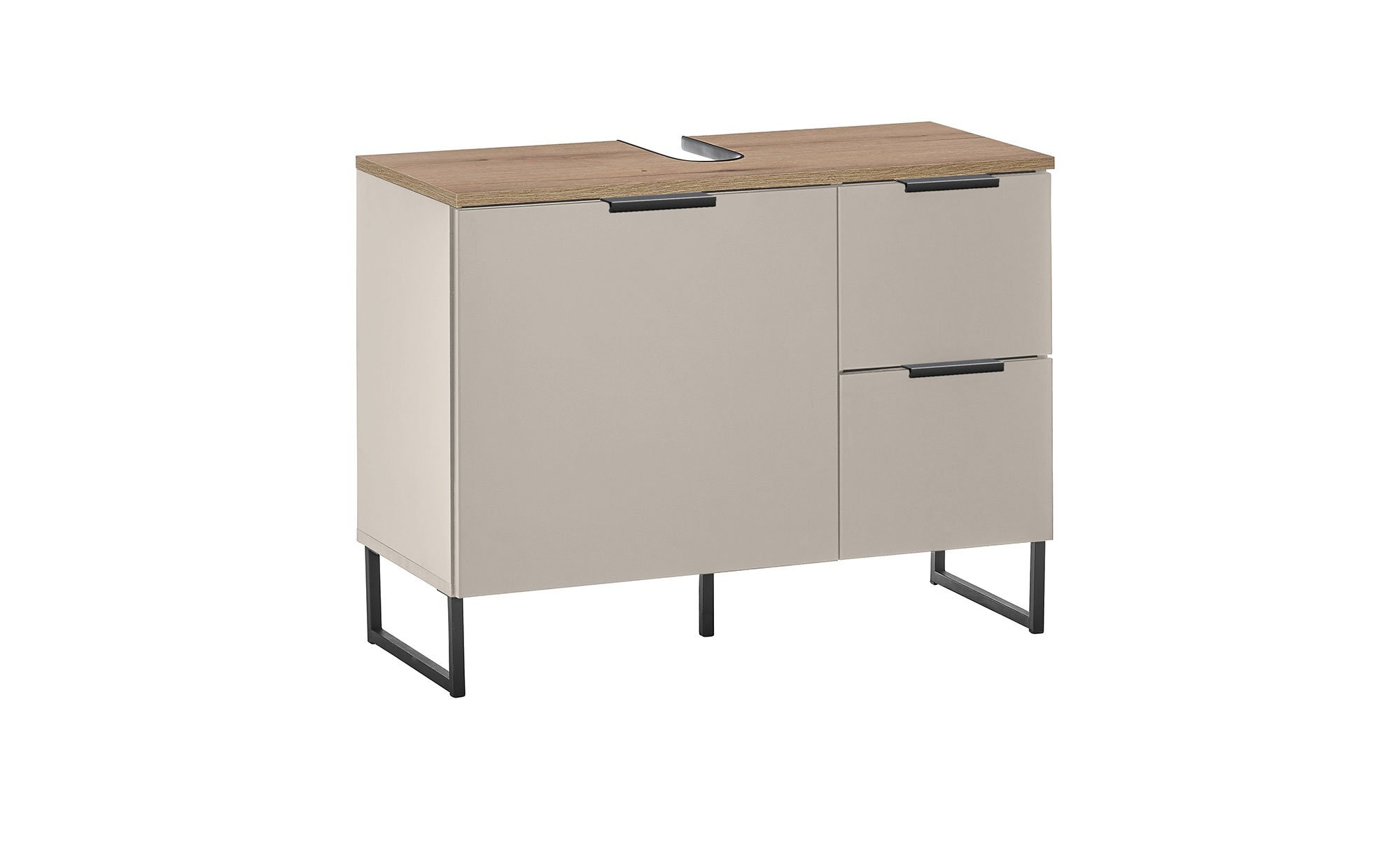 Der ca. 80 x 60 x 35 cm große Schrank besteht aus Holzwerkstoff im Farbton Kaschmir. Lediglich die mit einem Ausschnitt für Ihren Siphon versehene Oberplatte hebt sich davon ab; sie trägt ein ansprechendes Evoke Eiche-Dekor.