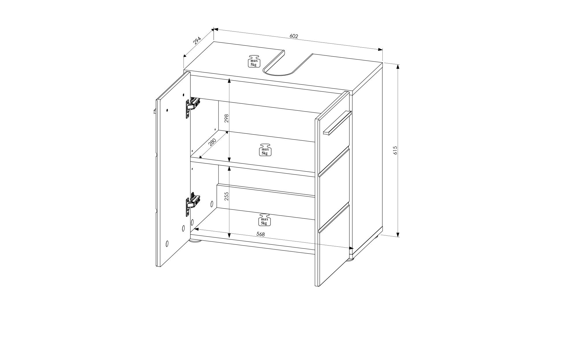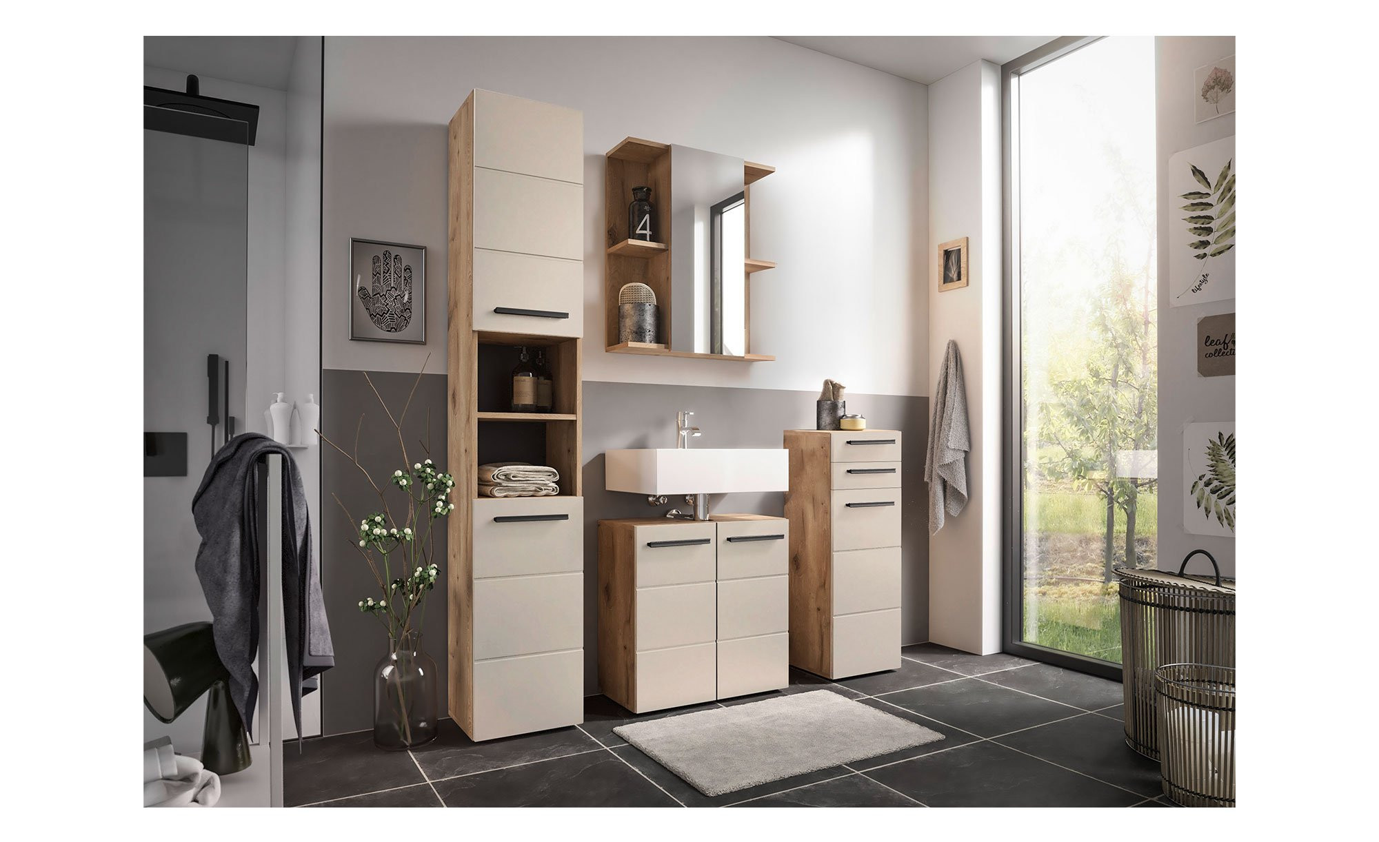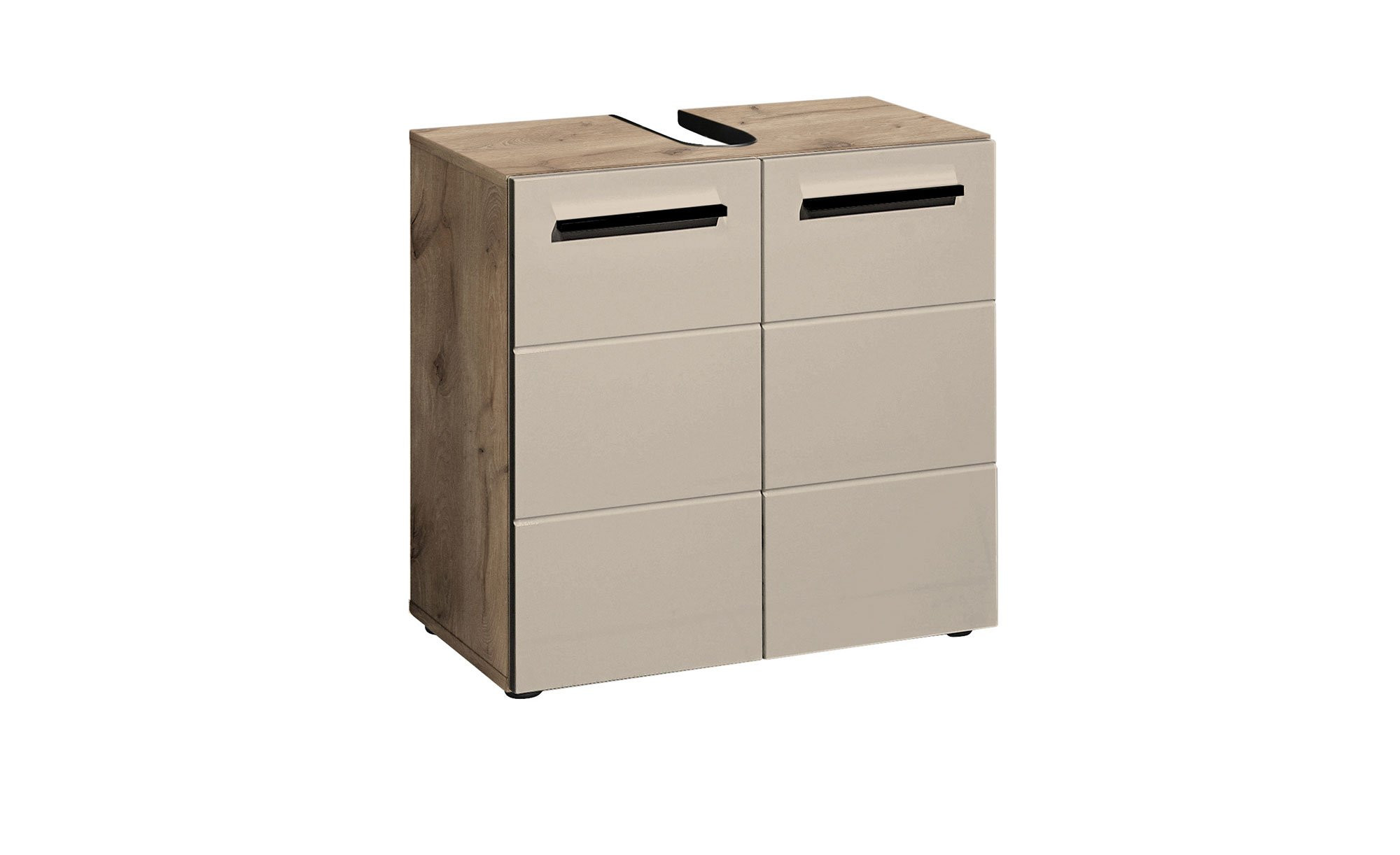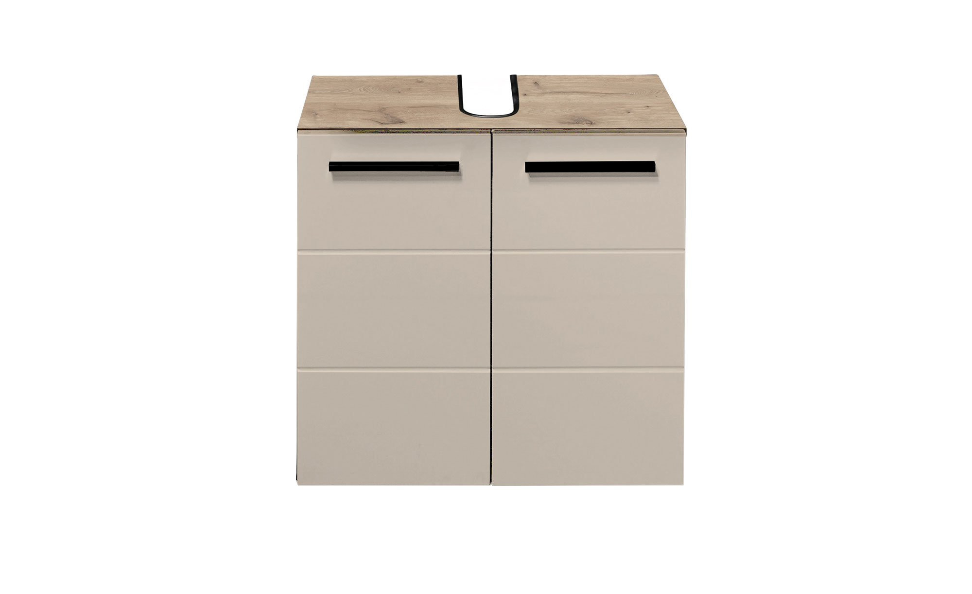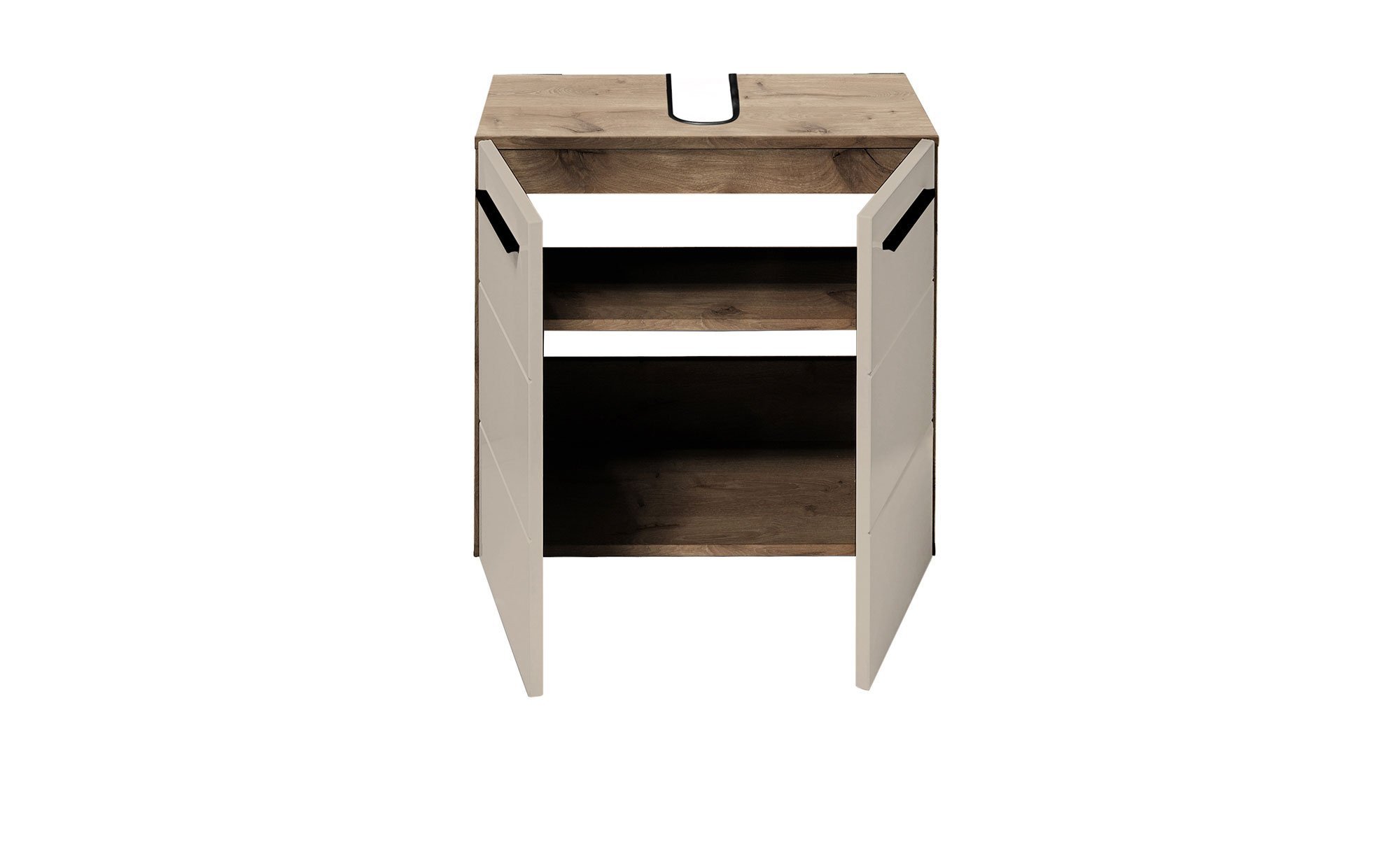 Das aus Holzwerkstoff bestehende Möbelstück misst ca. 60 x 62 x 31 cm und verfügt zusätzlich über einen ca. 10 x 24 cm großen Siphonausschnitt. Während der Korpus im natürlichen Dekor Viking Oak gehalten ist, begeistert die Front im Ton Sand.