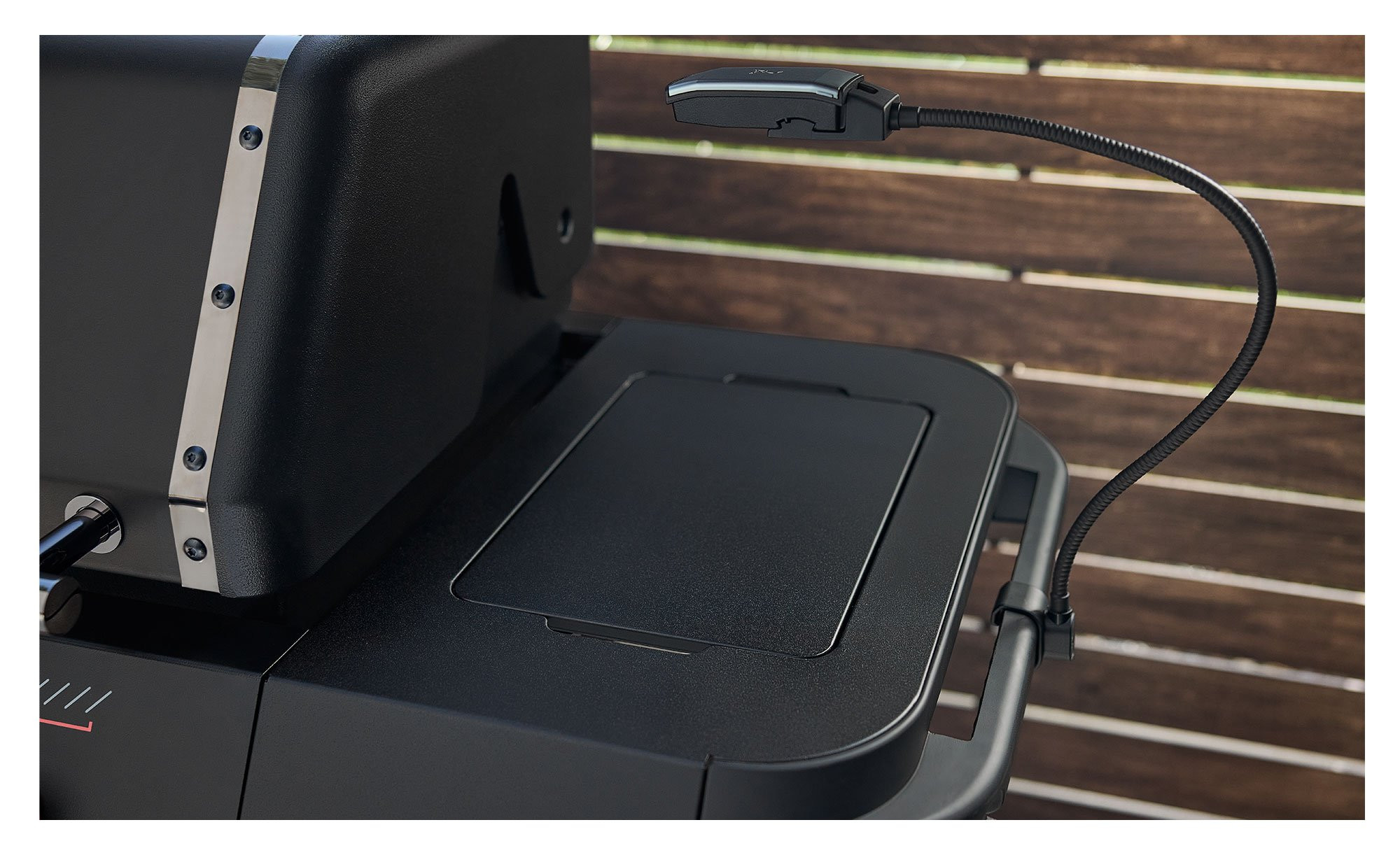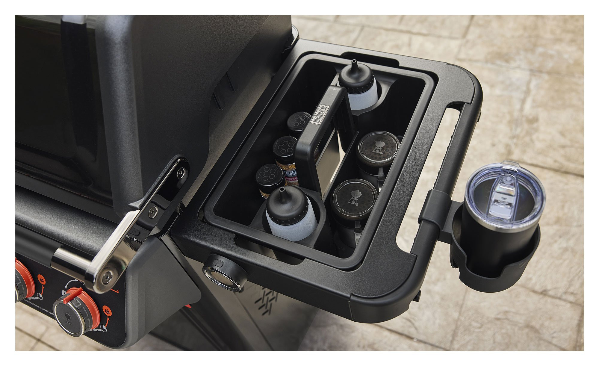Im Deckel mit integriertem Metallgriff befindet sich bei dem Grill ein Thermometer, sodass Sie bzgl. der Temperatur stets den Überblick behalten. Außerdem dürfen Sie sich auf Seitentische mit einer Leiste für einzuhängendes Weber-Zubehör freuen, die Ihnen die Handhabung zusätzlich erleichtern. Auch hinter der geschlossenen Front mit Tür sowie im Seitenschrank lassen sich diverse Utensilien platzsparend unterbringen. Eine praktische Mobilität gewährleisten vier Rollen.