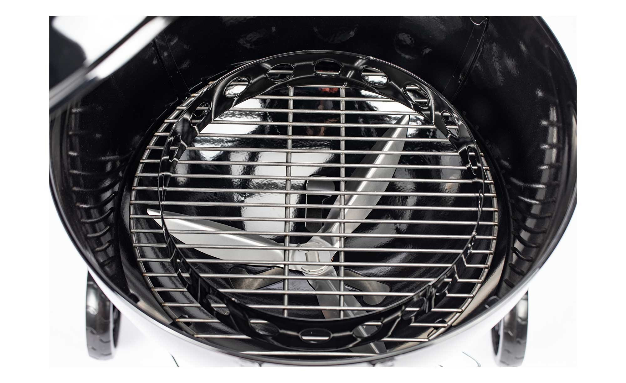 Neben einem einfach zu greifendem Lüftergriff gehört zum Holzkohlegrill ein glasverstärkter Nylon-Schalengriff. Zudem sind viele Bestandteile porzellanemailliert, beispielsweise der Holzkohlering, der Kessel und der Deckel. In letzterem wurde direkt ein Thermometer integriert, außerdem verfügt er über ein Deckelscharnier aus Edelstahl „for removable lid“ sowie einen Griff.