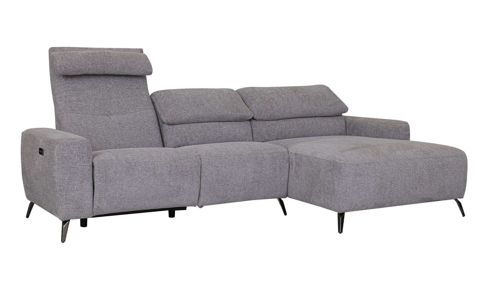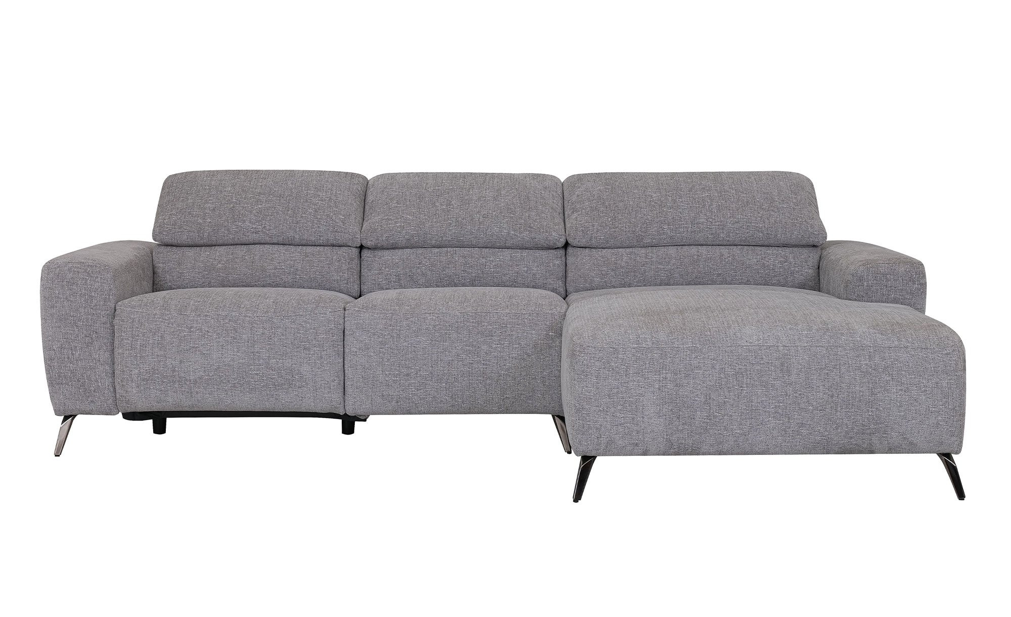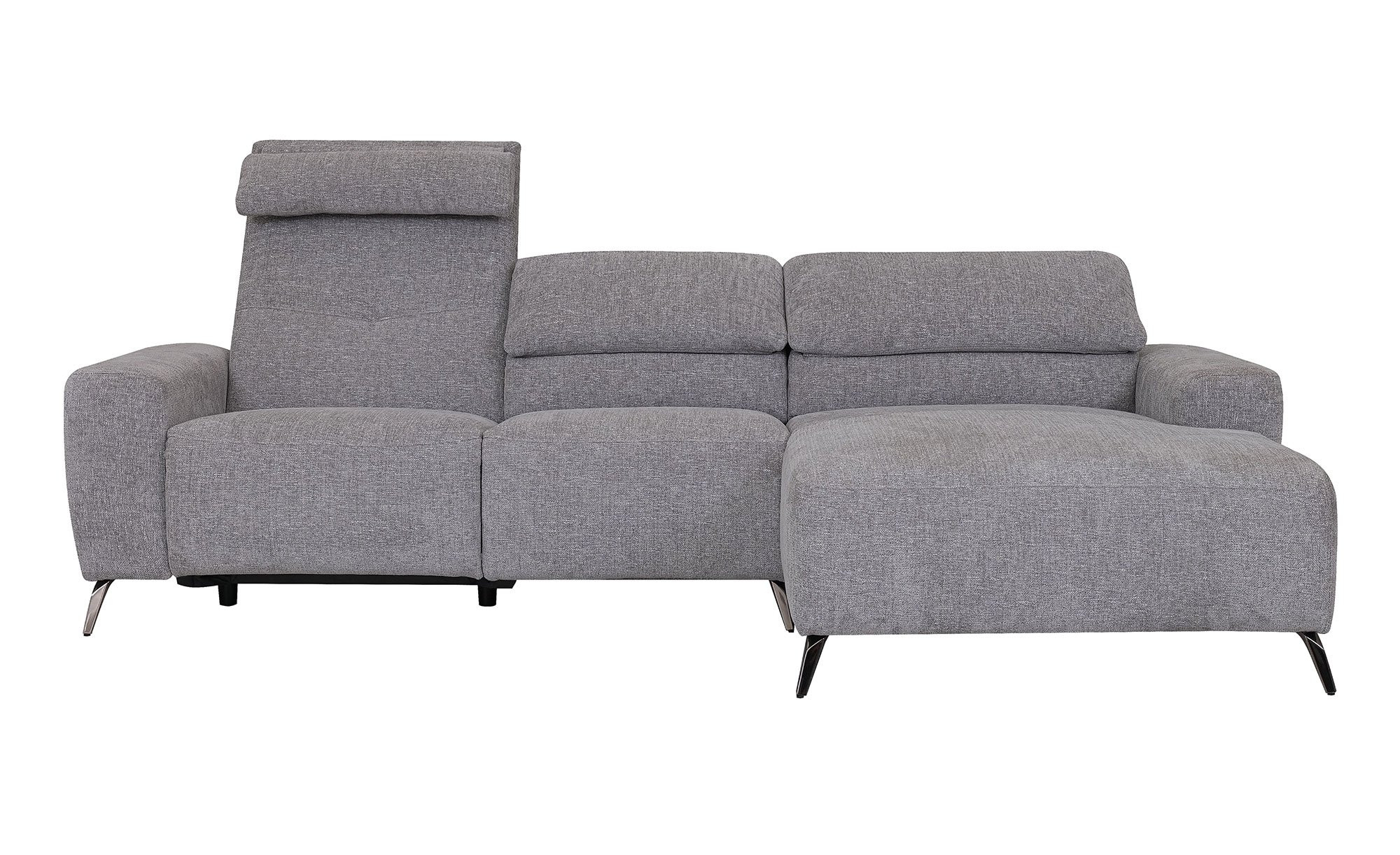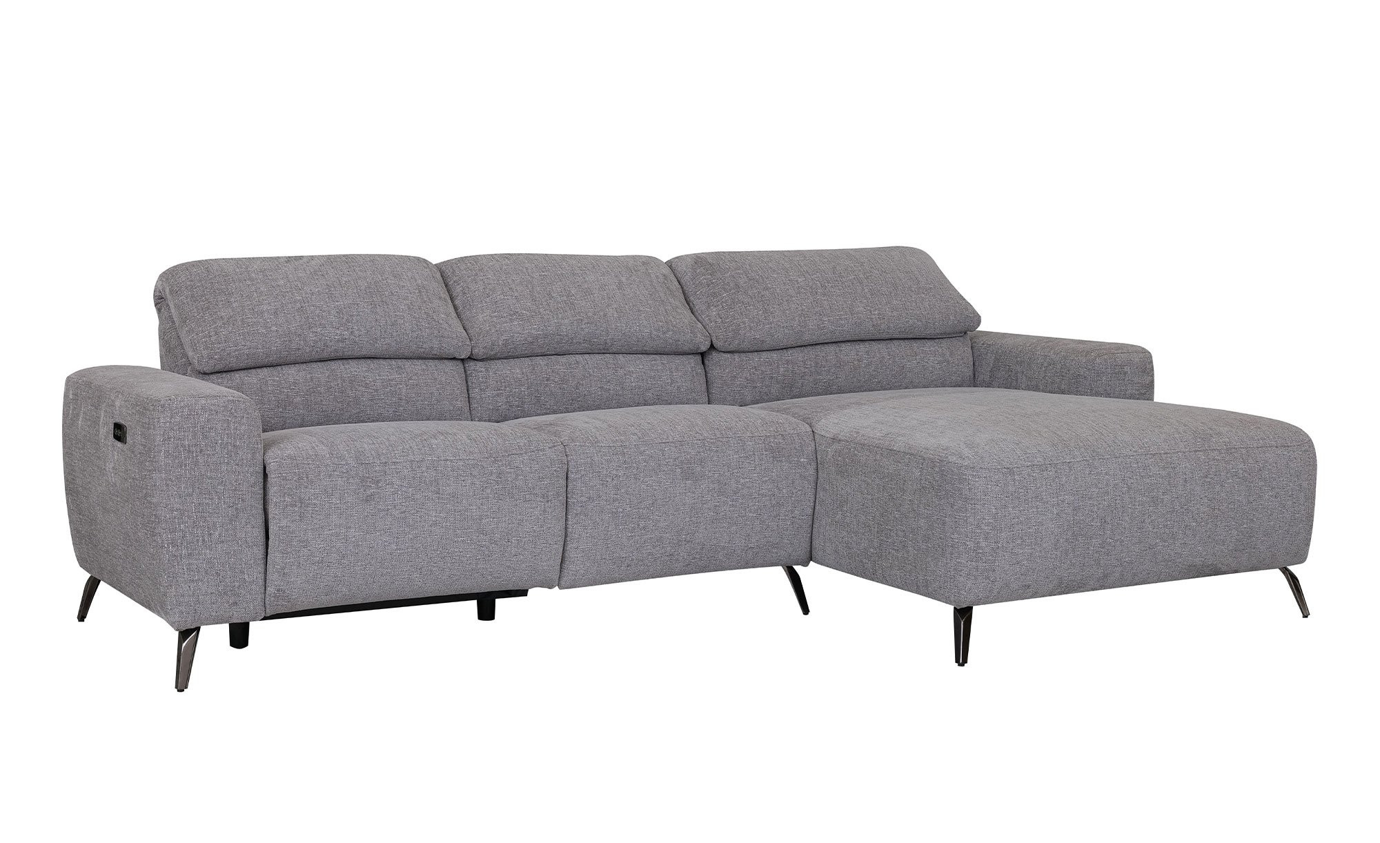 Ein strapazierfähiger Bezugsstoff in Grau umspannt das rechtsseitig ausgerichtete Möbelstück. Zudem dürfen Sie sich auf schwarze Metallfüße mit Pulverbeschichtung freuen.