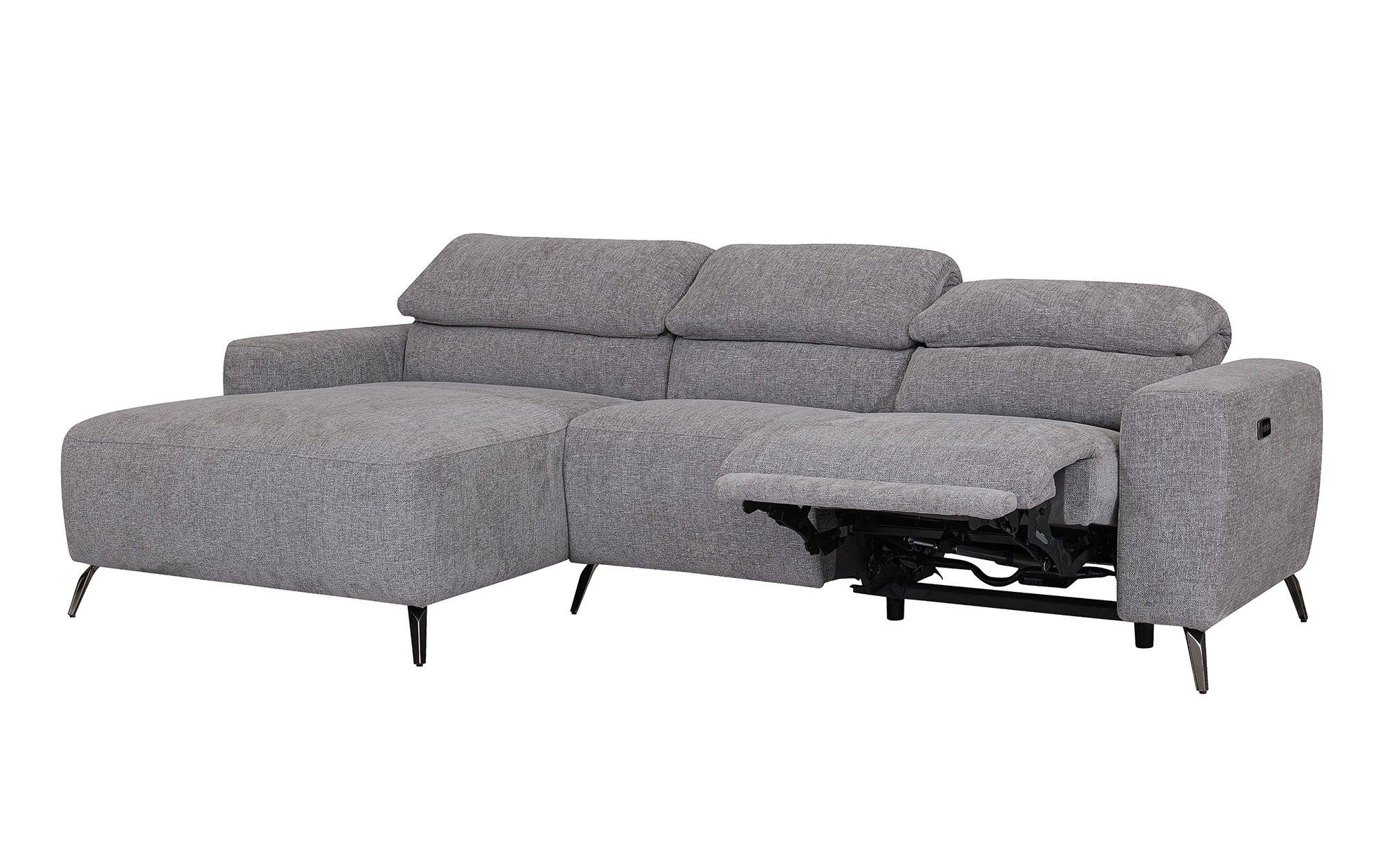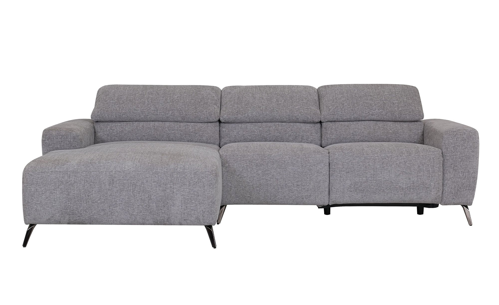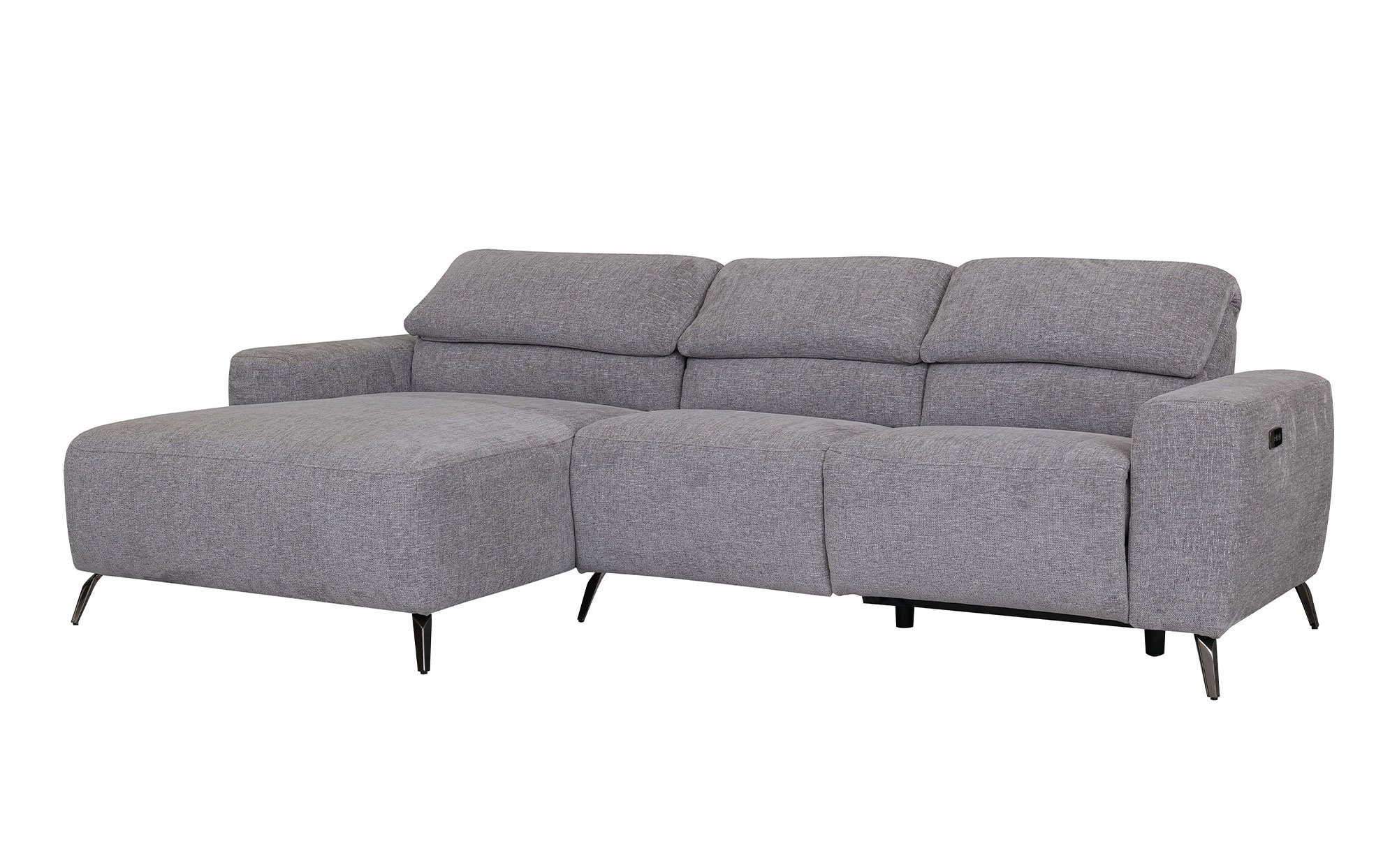 Ein robuster Stoffbezug in Grau verleiht dem linksseitig ausgerichteten Sofa eine moderne Ausstrahlung. Ergänzt wird das Erscheinungsbild durch schwarze Metallfüße mit Pulverbeschichtung.