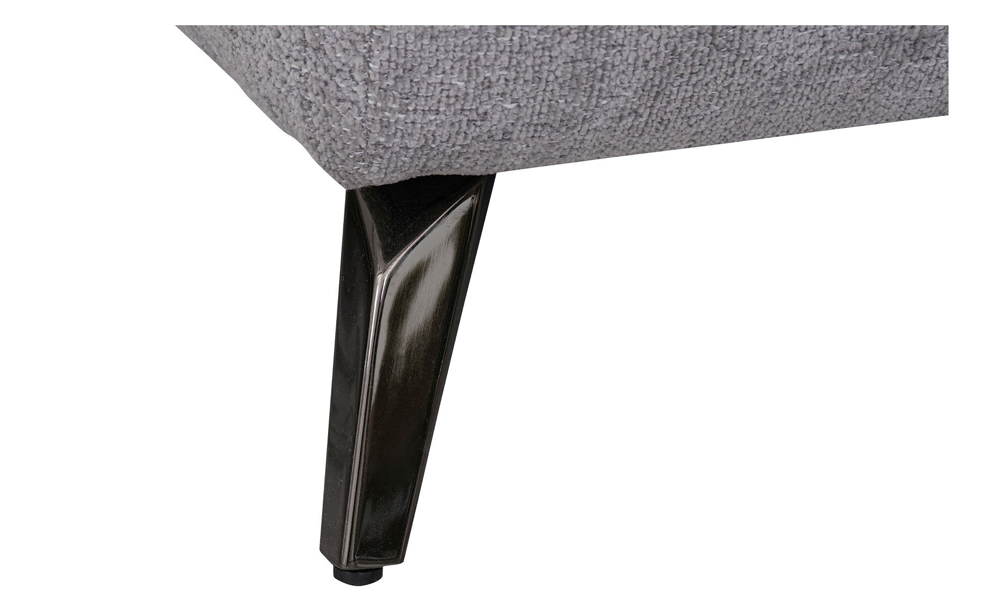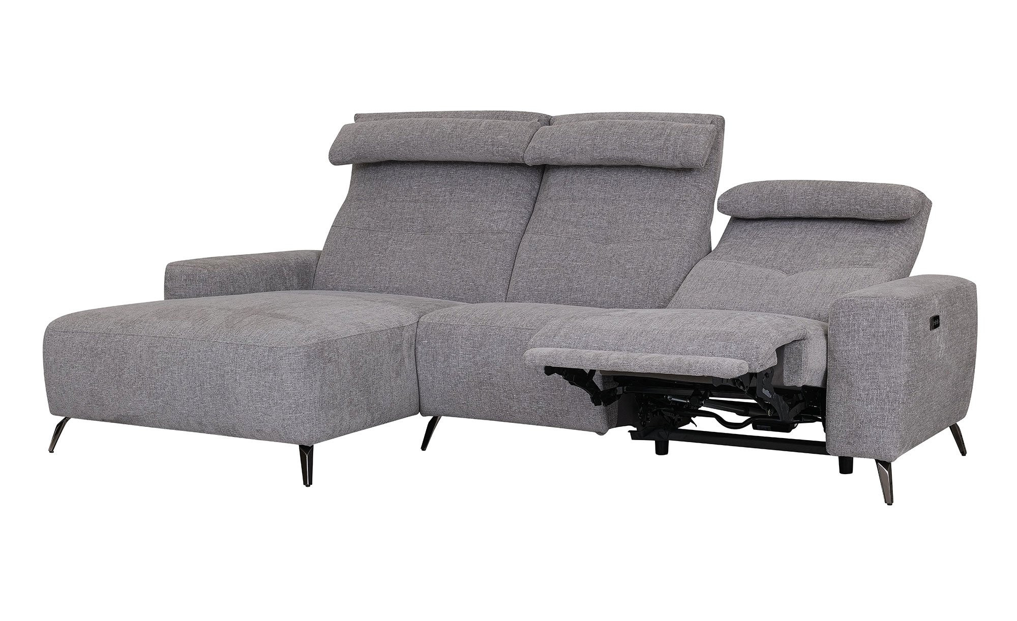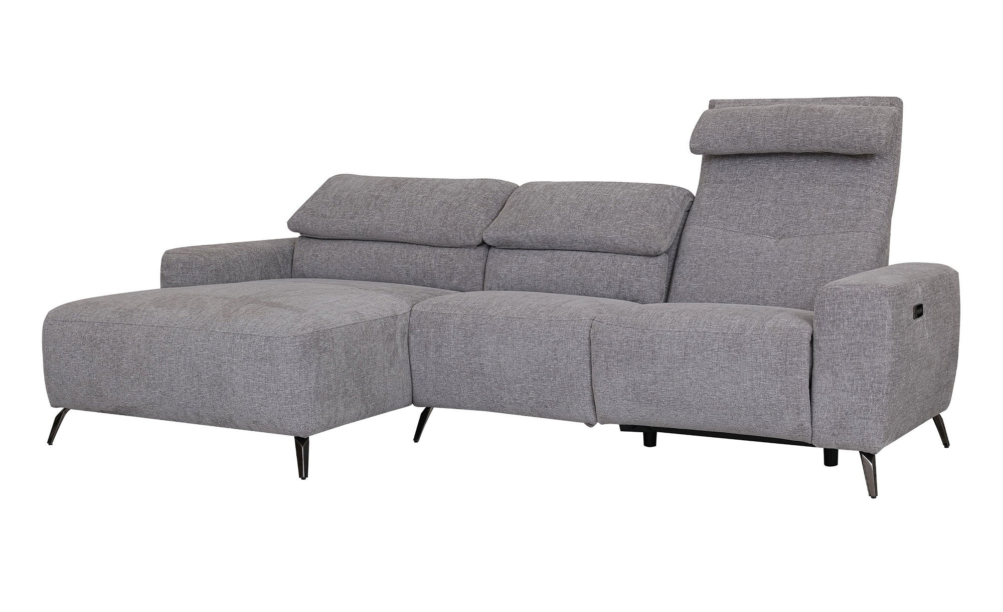 Ein robuster Stoffbezug in Grau verleiht dem linksseitig ausgerichteten Sofa eine moderne Ausstrahlung. Ergänzt wird das Erscheinungsbild durch schwarze Metallfüße mit Pulverbeschichtung.