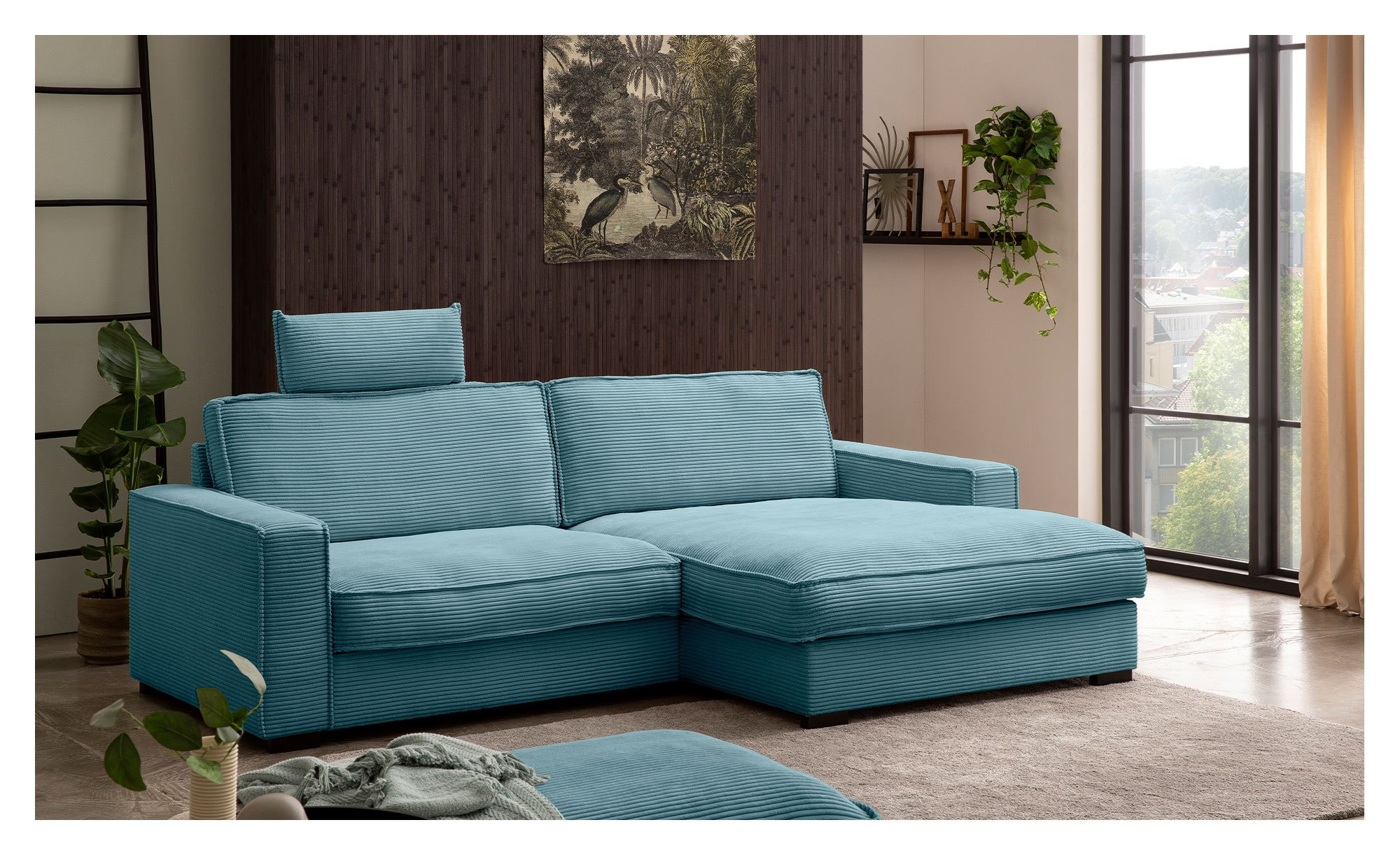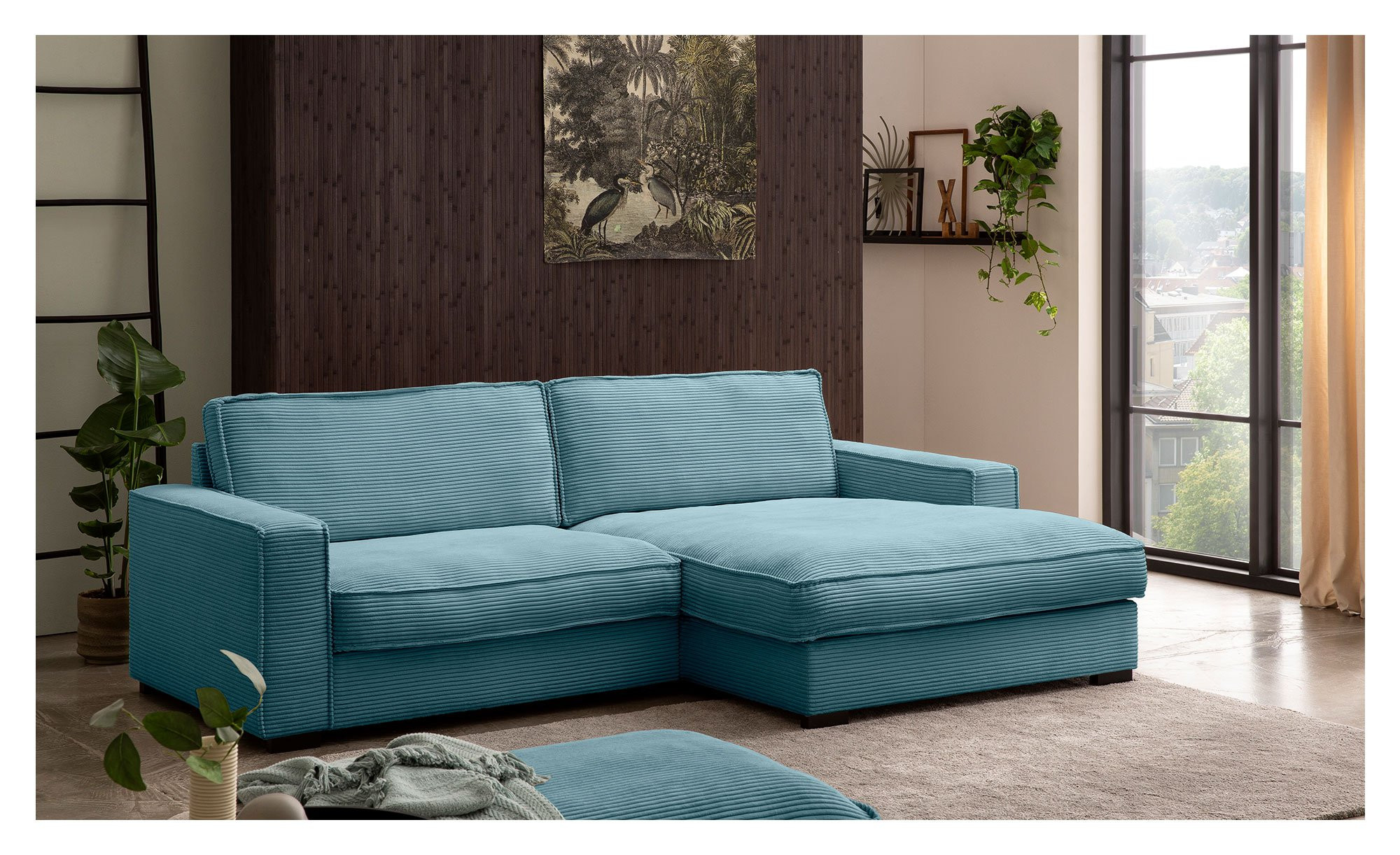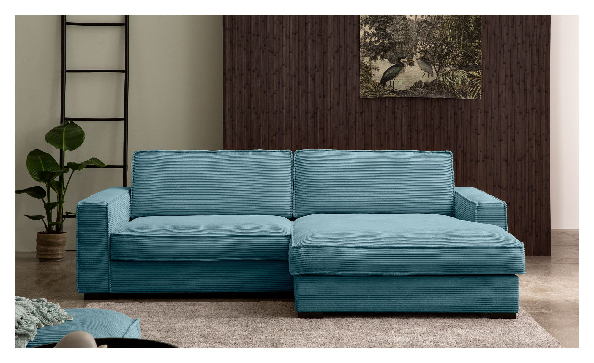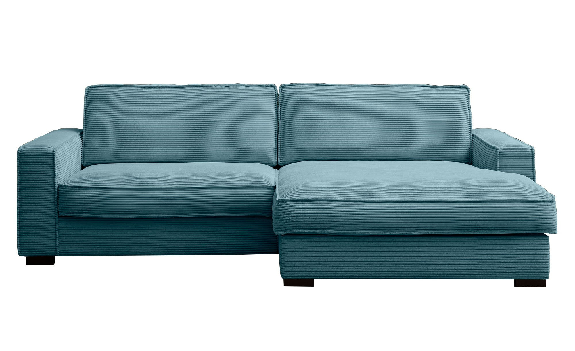 Das Möbelstück ist ca. 244 x 82 x 157 cm groß und mit einem weichen Cordstoff in Türkisblau bezogen. Da sich das Material auch am Rücken findet, ist ein Stellen überall im Raum problemlos möglich. Mitgeliefert werden zwei Rückenkissen, zudem erwarten Sie Holzfüße in der Farbe Wenge.