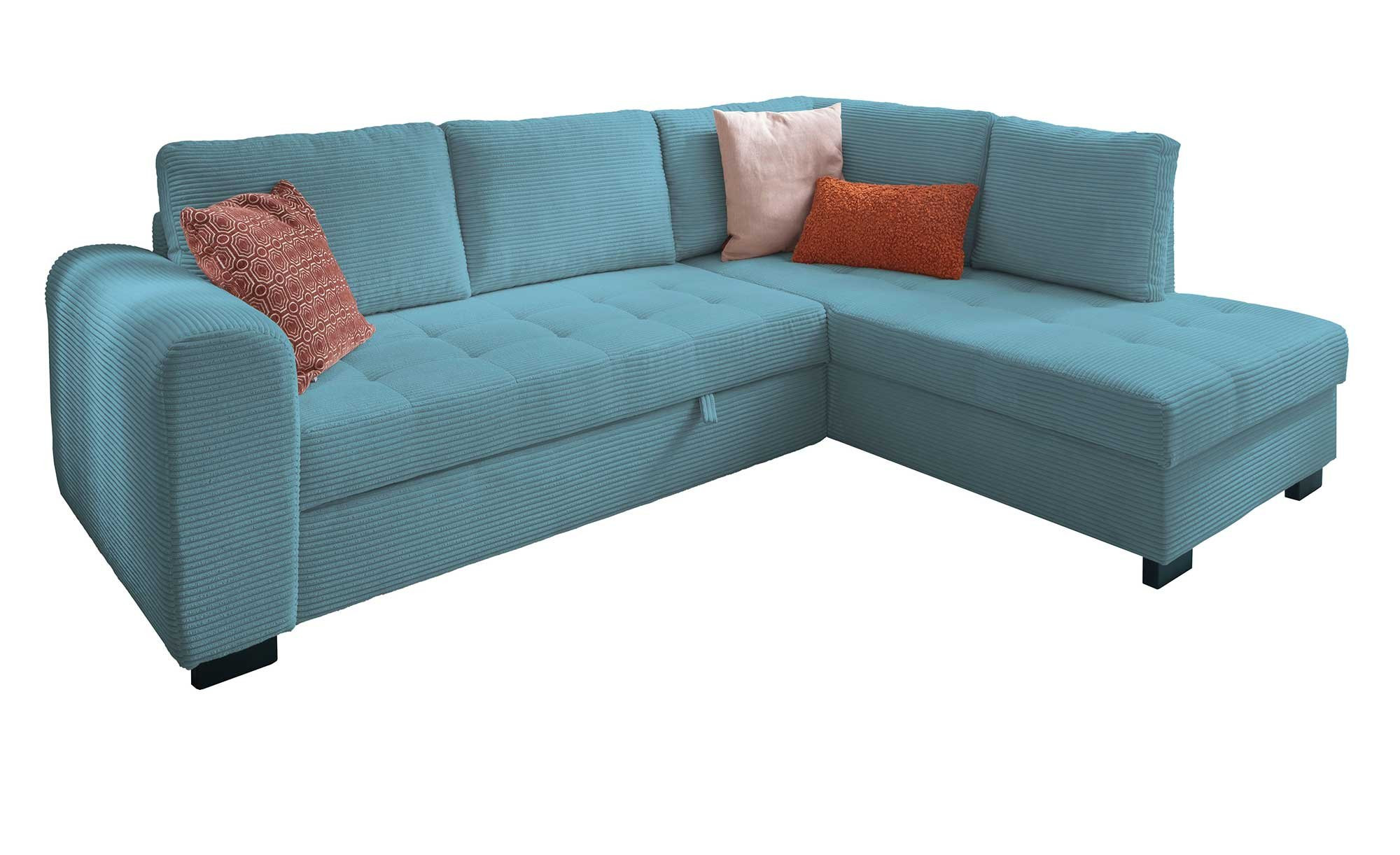 Das ca. 239 x 86 x 178 cm große Möbelstück beeindruckt durch einen modernen und strapazierfähigen Cord-Bezug in der Farbe Lagoon. Das Material findet sich auch am Rücken. Ca. 7 cm hohe Kunststofffüße in Schwarz passen perfekt zum Design.