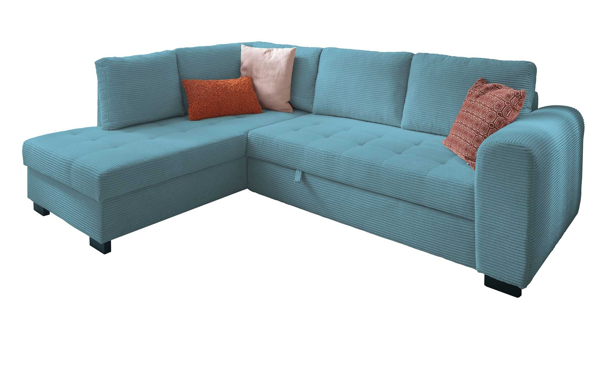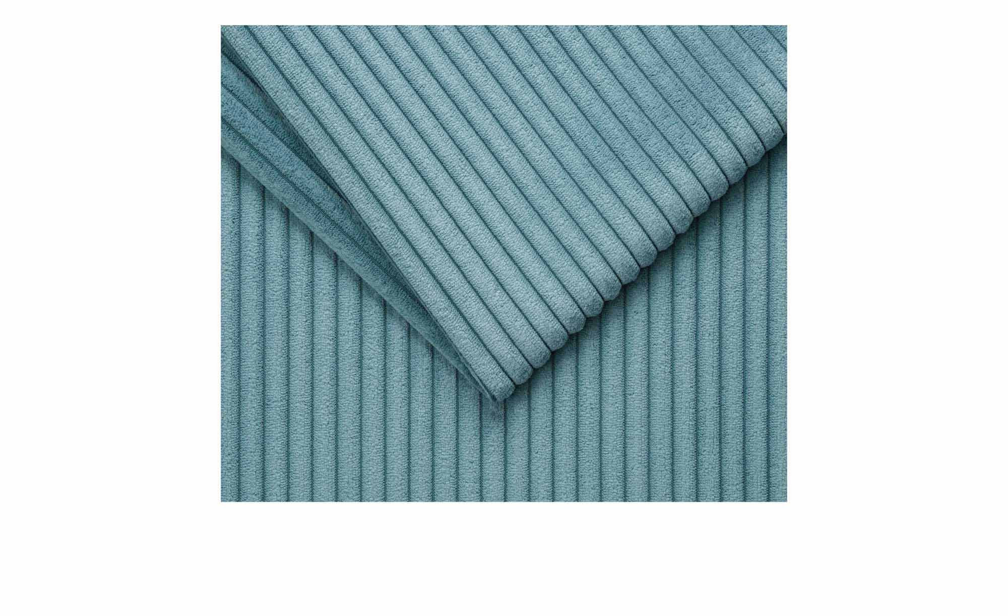 Das moderne Möbelstück misst ca. 239 x 86 x 178 cm und ist mit einem strapazierfähigen Cord-Bezug in der Farbe Lagoon ausgestattet. Dieser schließt auch den Rücken ein und harmoniert perfekt mit den ca. 7 cm hohen Kunststofffüßen in Schwarz.