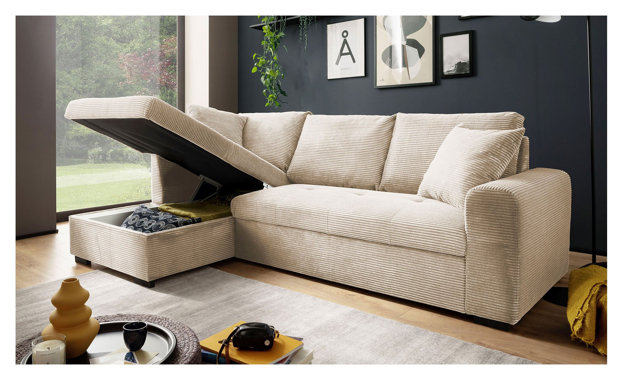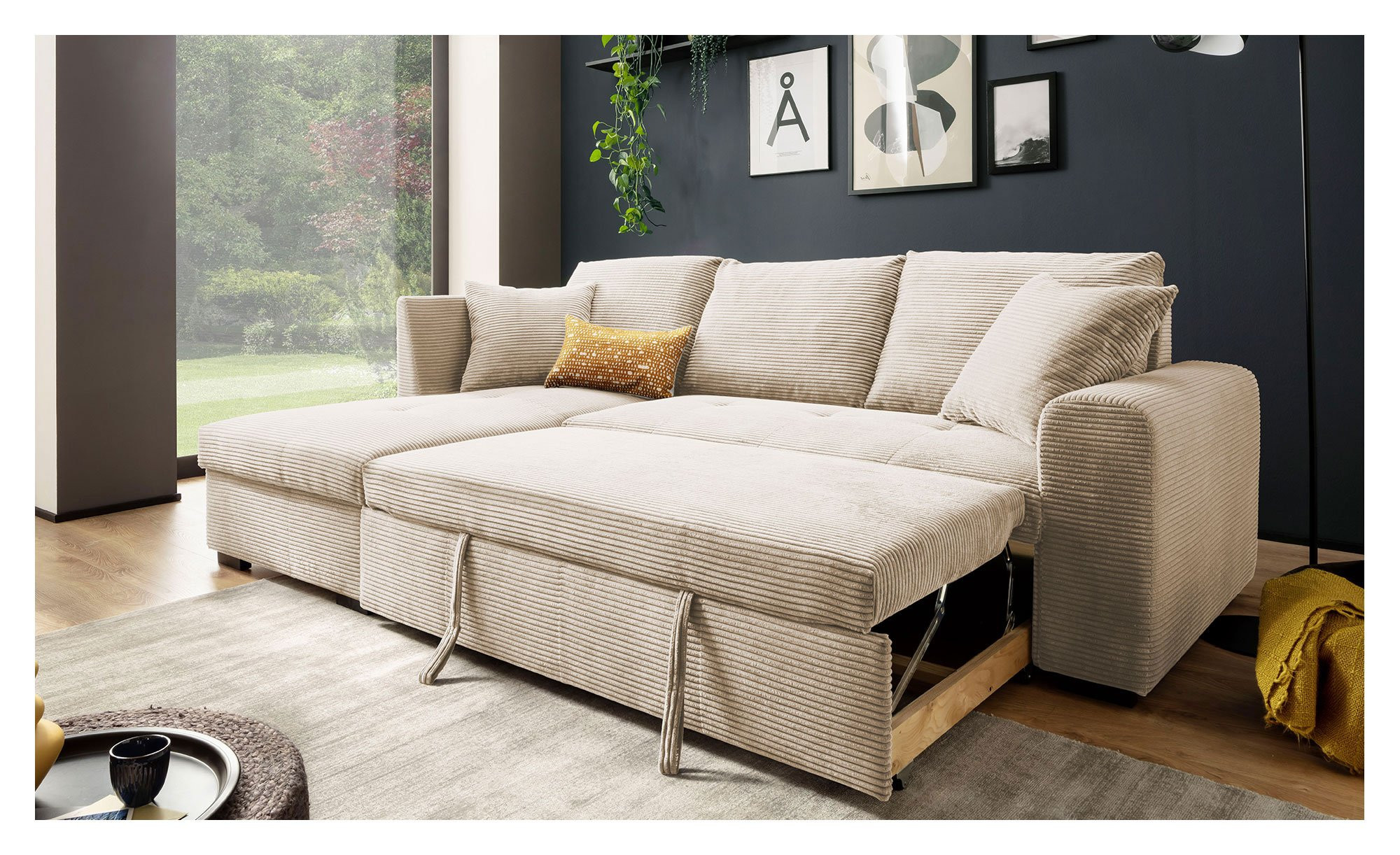 Freuen Sie sich auf einen strapazierfähigen Cord-Bezug in cream (creme-beige), der das ca. 239 x 90 x 158 cm große Möbelstück inklusive Rücken umspannt. Seine Füße bestehen aus schwarzem Kunststoff und sind ca. 7 cm hoch.