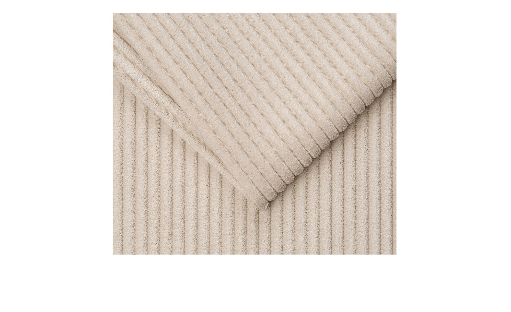 Freuen Sie sich auf einen strapazierfähigen Cord-Bezug in cream (creme-beige), der das ca. 239 x 90 x 158 cm große Möbelstück inklusive Rücken umspannt. Seine Füße bestehen aus schwarzem Kunststoff und sind ca. 7 cm hoch.