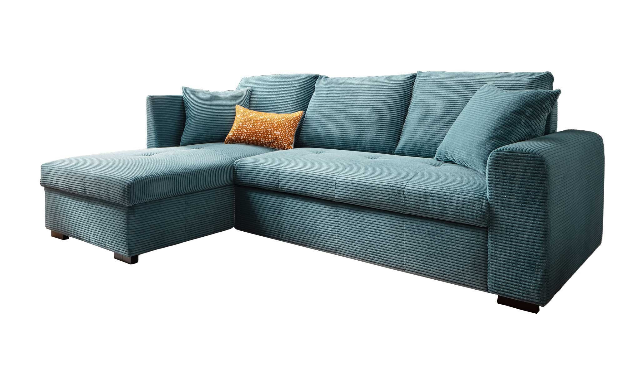 Freuen Sie sich auf einen strapazierfähigen Cord-Bezug in Blau, der das ca. 239 x 90 x 158 cm große Möbelstück inklusive Rücken umspannt. Seine Füße bestehen aus schwarzem Kunststoff und sind ca. 7 cm hoch.