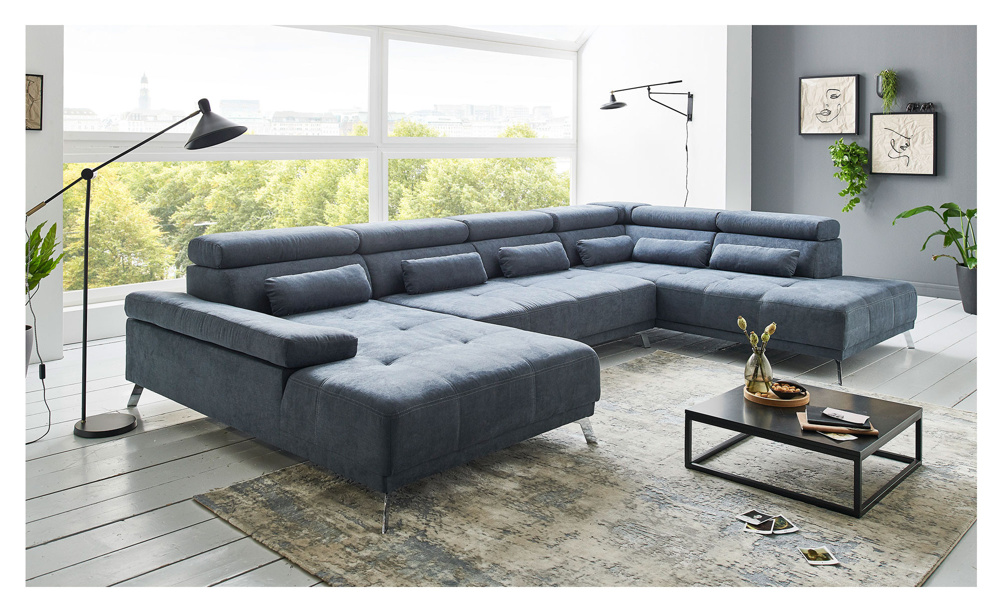 Das Sofa hinterlässt durch seinen grauen Stoffbezug und mit Metallfüßen in wahlweise in chrom, schwarz gepulvert oder verchromt, unmittelbar einen wertigen Eindruck. Der echte Rücken stellt es ihnen frei, ob Sie die Wohnlandschaft herkömmlich an einer Wand oder einfach inmitten des Zimmers platzieren möchten. Sechs Nierenkissen sind im Lieferumfang inbegriffen.