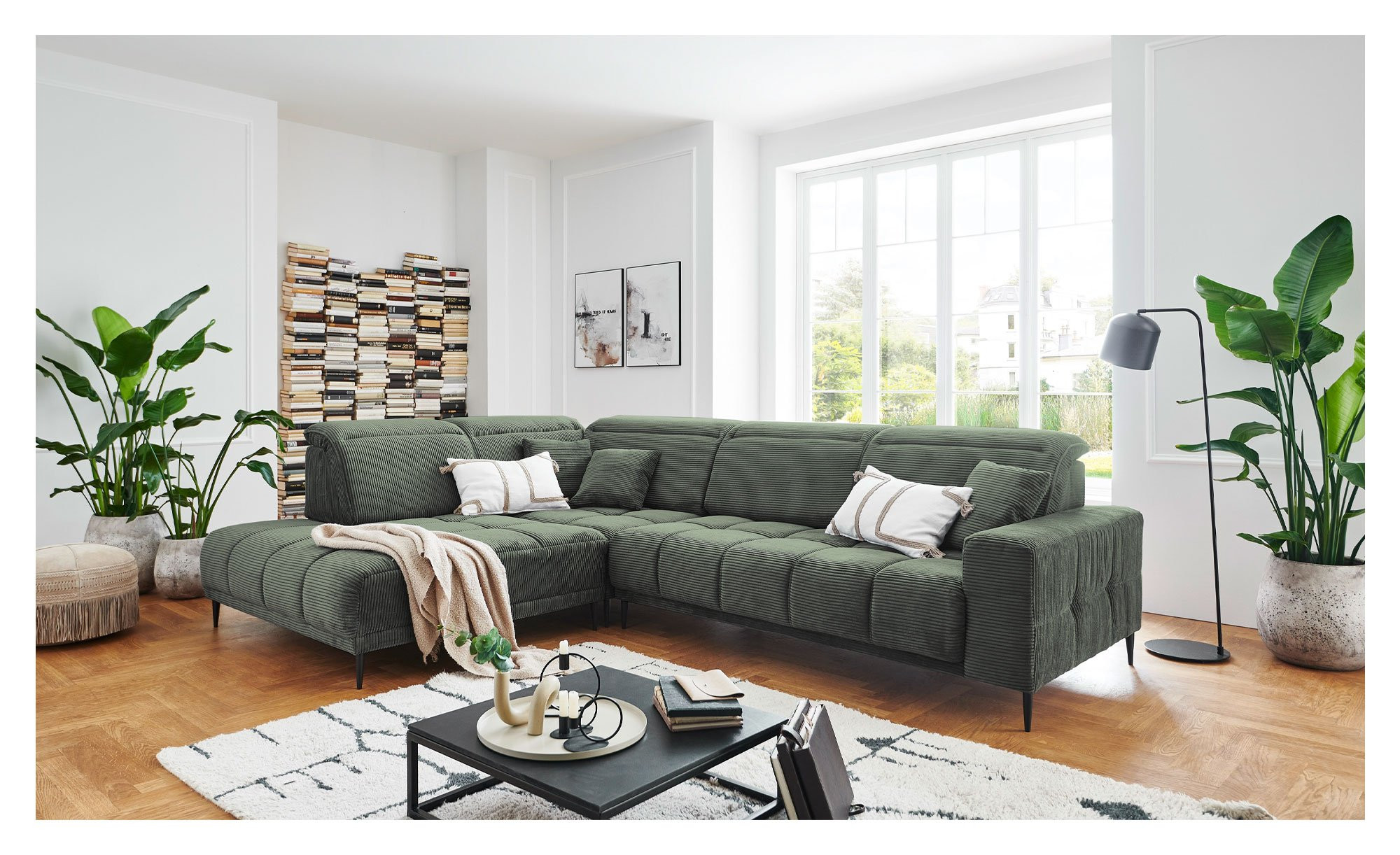 Das ca. 317 x 87-107 x 234 cm große Sofa ist inklusive Rücken in grünem Cordstoff bezogen und steht auf mattschwarzen Metallfüßen. Drei im Lieferumfang enthaltene Kissen im selben Bezugsstoff unterstreichen den wohnlichen Charakter.