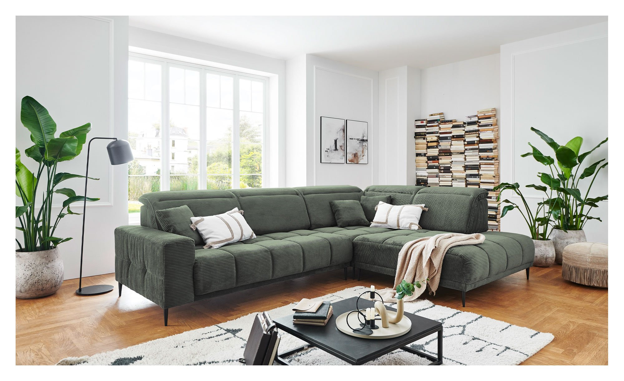Seine zeitlos-moderne Optik verdankt das ca. 317 x 87-107 x 234 cm große Möbelstück unter anderem einem grünen Cordstoff, der auch den Rücken umspannt. Zusätzlich werden drei Zierkissen im selben Bezugsstoff mitgeliefert, und es gibt Metallfüße in mattem Schwarz.