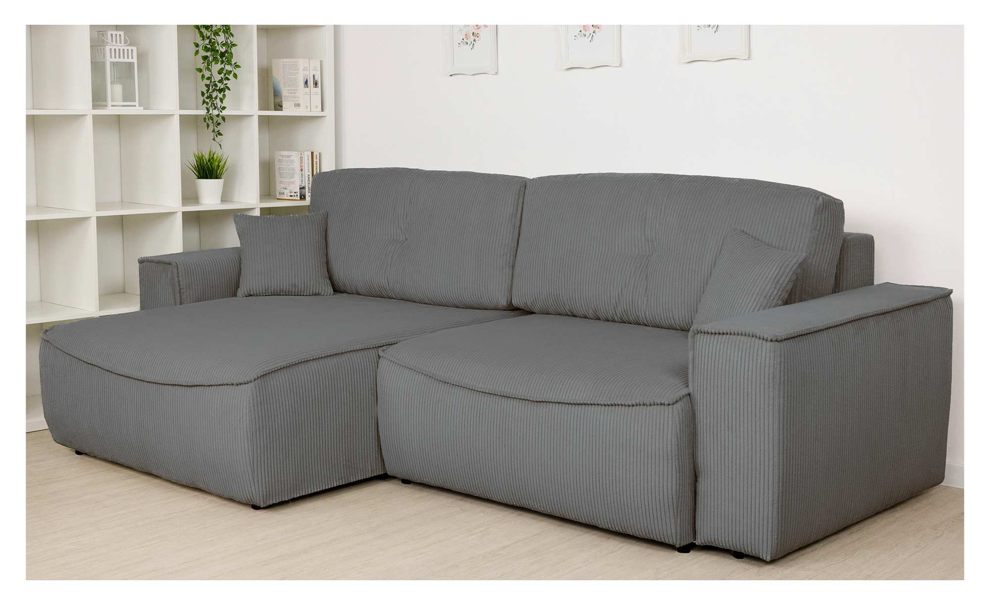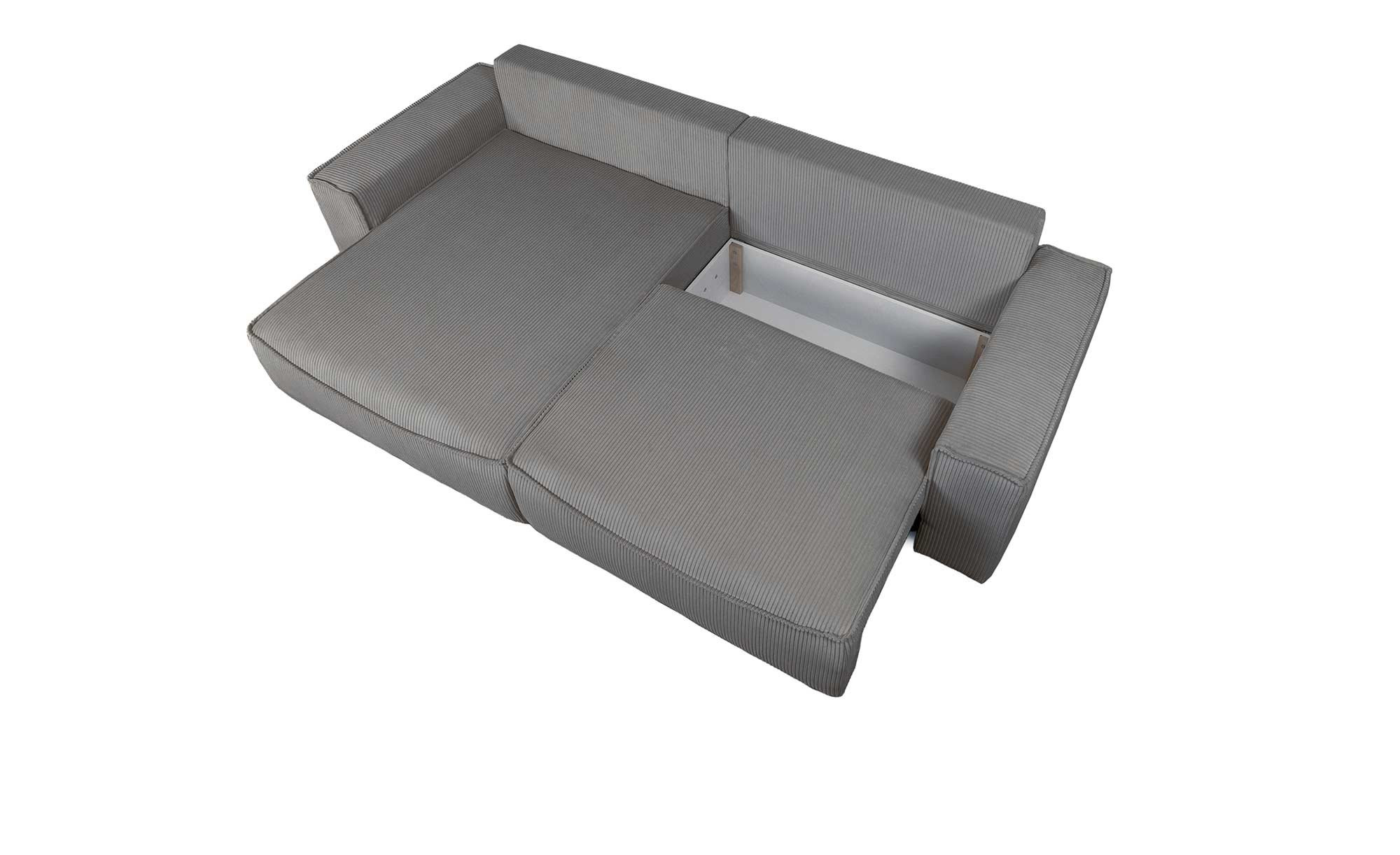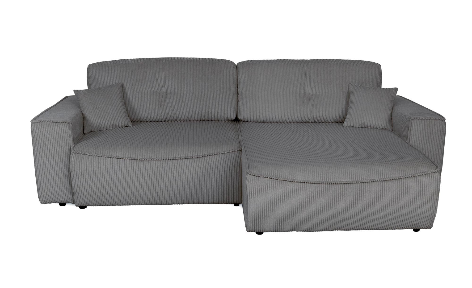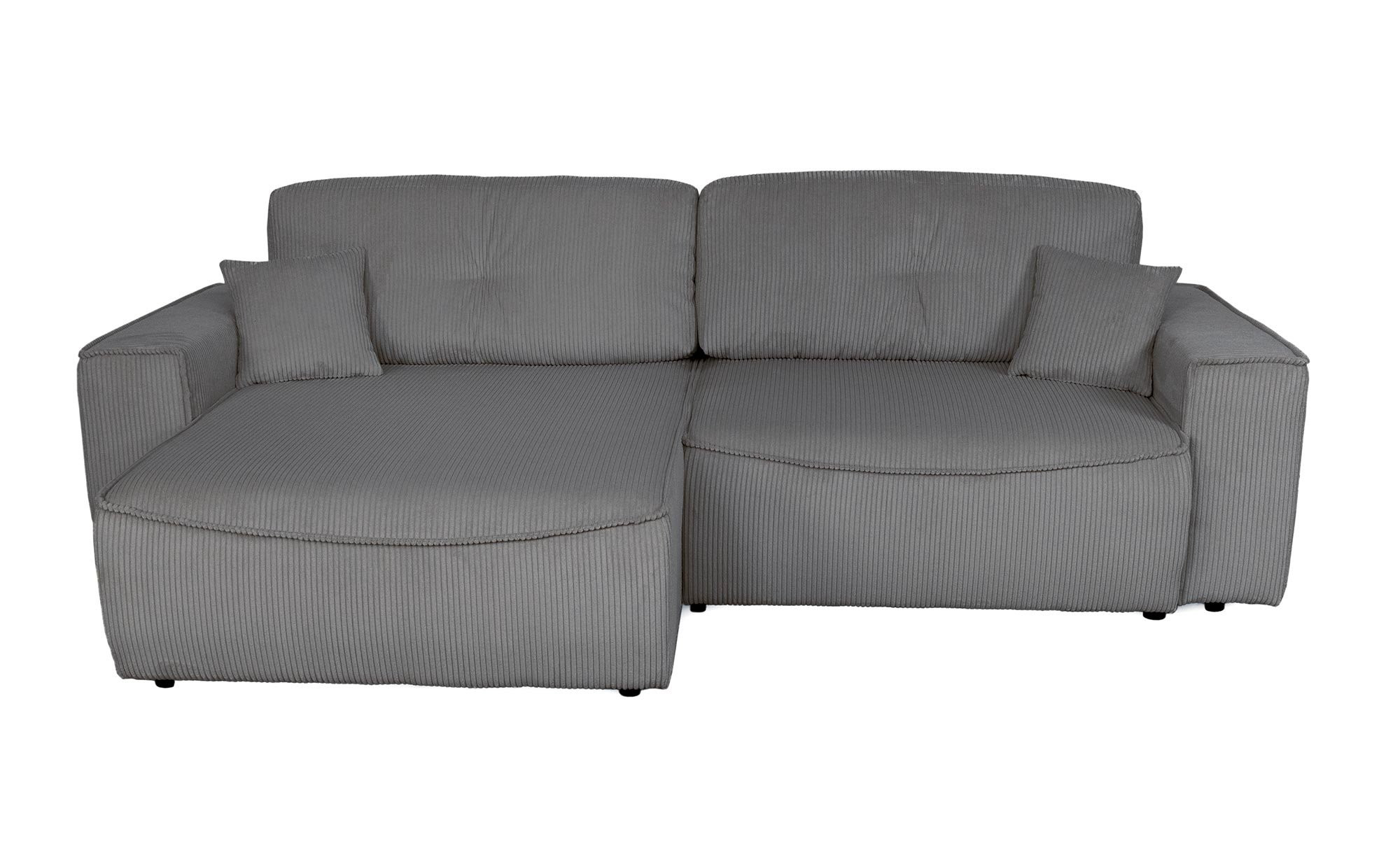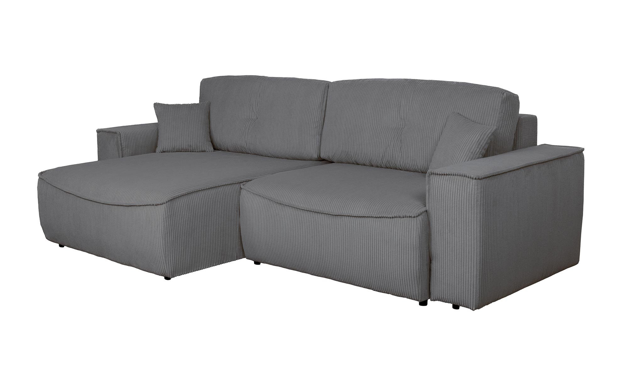 Bezogen mit einem grauen Stoff aus 100 % Polyester, lädt das ca. 265 x 85 x 148 cm große Möbelstück zum Verbringen entspannter Momente ein. Im Angebot enthalten sind zwei Zierkissen im gleichen Stoff, die den Komfort und gemeinsam mit ca. 2 cm hohen Kunststofffüßen in Schwarz auch das Erscheinungsbild abrunden.