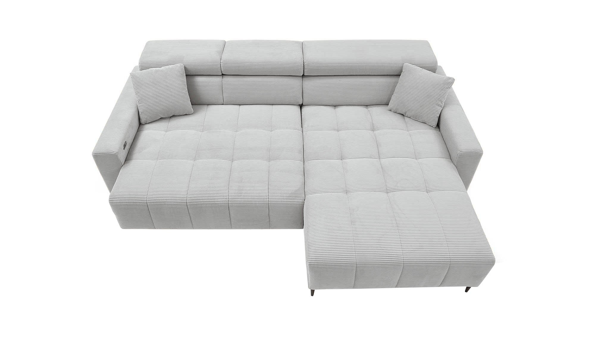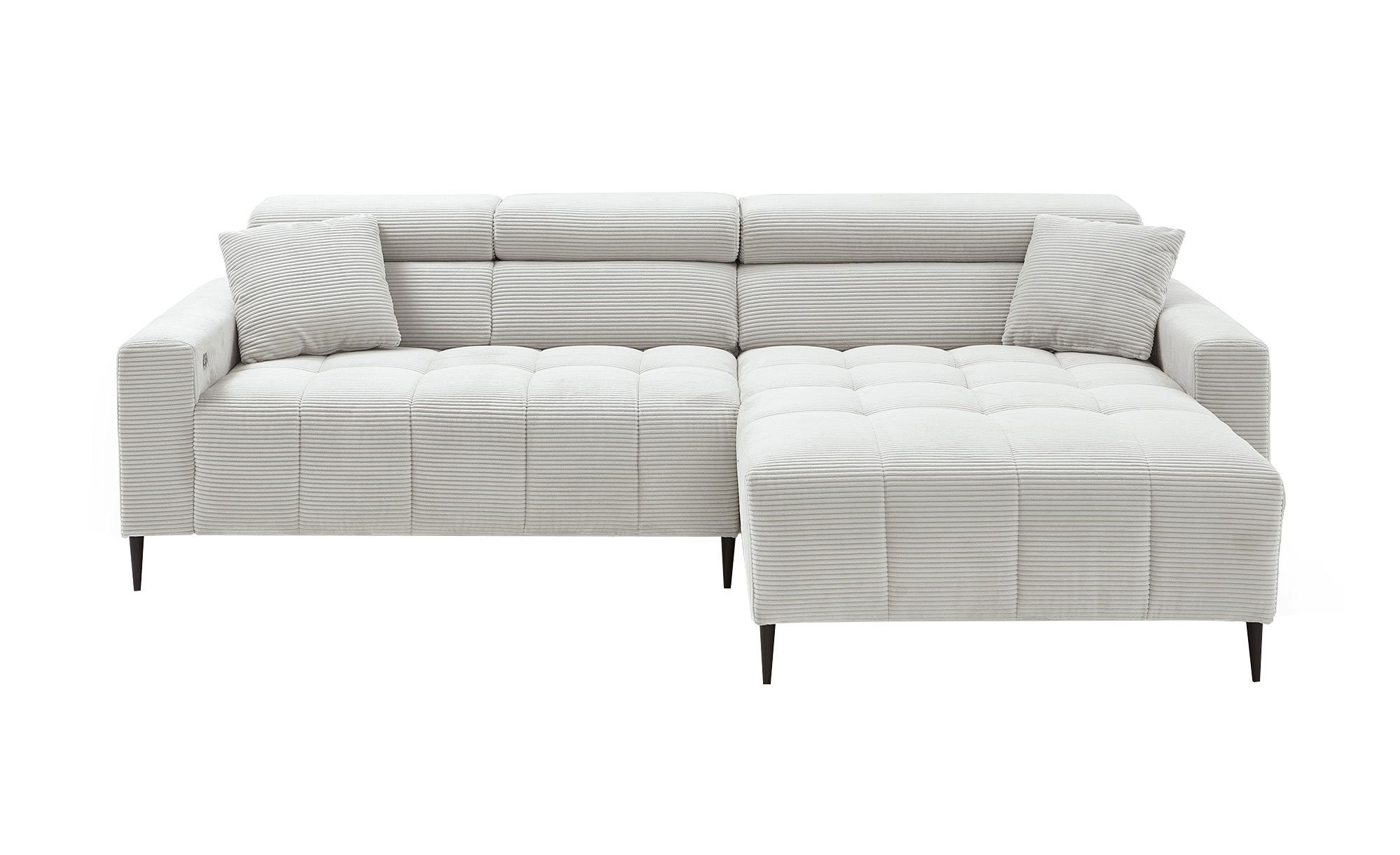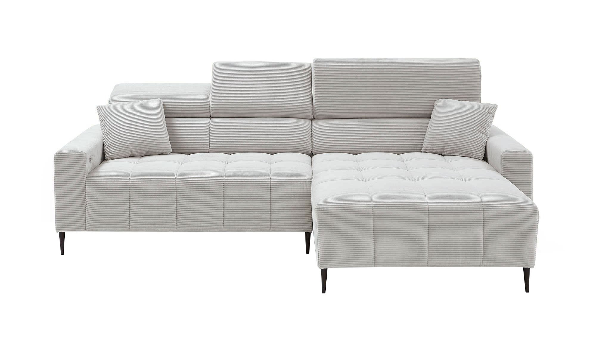 Das komfortable Sofa bietet mit seinen Maßen von ca. 256 x 78-100 x 105 cm ausreichend Platz zum Entspannen. Bezogen mit einem kuscheligen Cordstoff im Farbton Silber, strahlt die Wohnlandschaft eine behagliche Atmosphäre aus. Zwei farblich abgestimmte Kissen sind im Lieferumfang enthalten und runden das Gesamtbild ab. Die modern gestalteten, schwarz gepulverten Metallfüße und die rechtsseitige Ausrichtung verleihen dem Möbelstück zudem eine elegante Note.