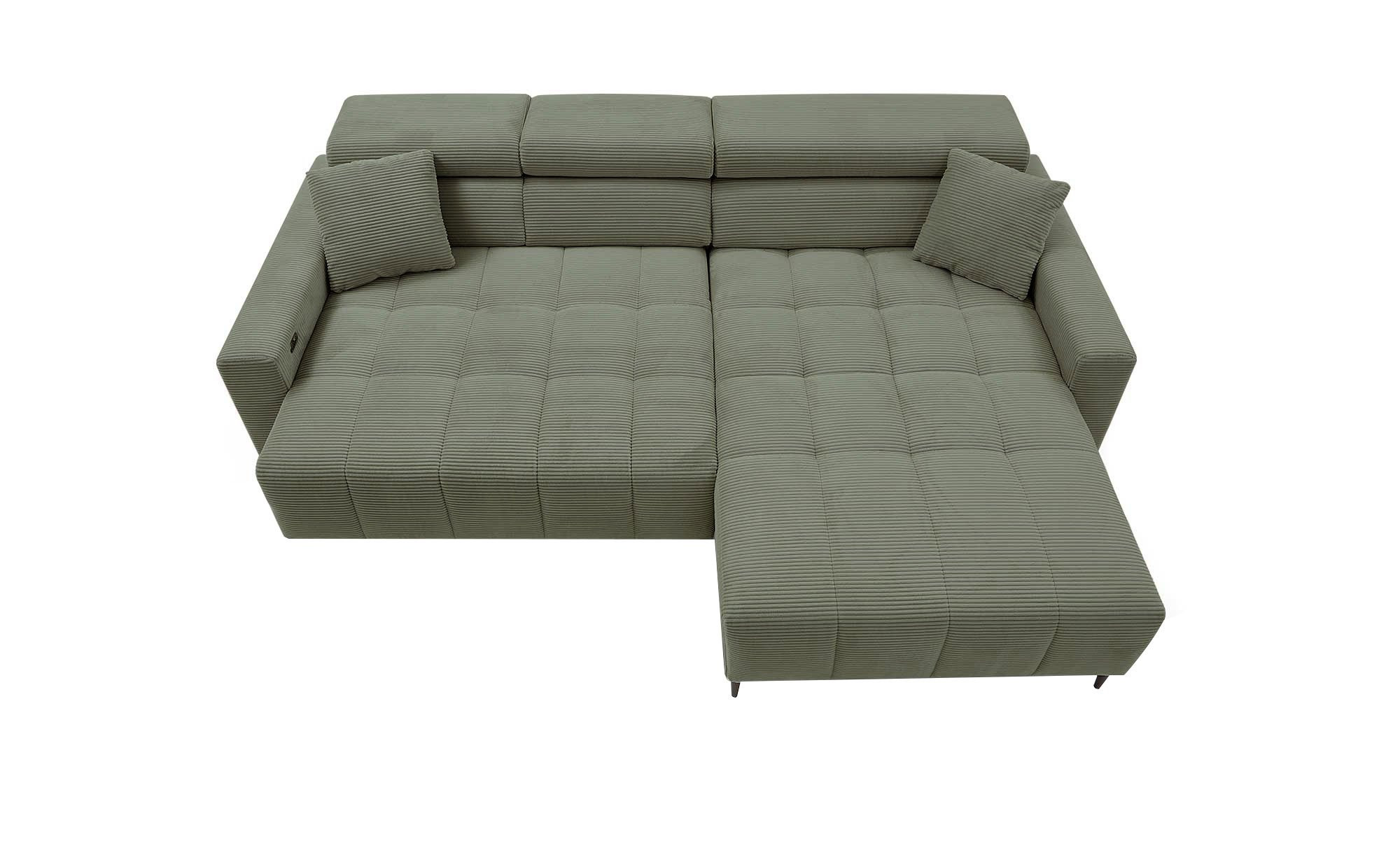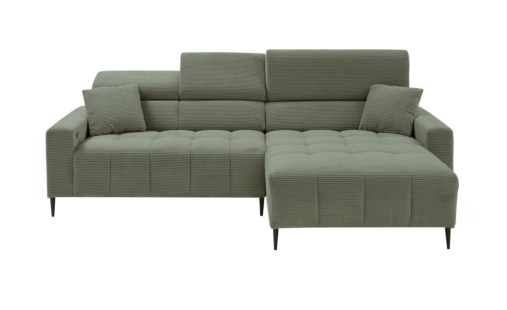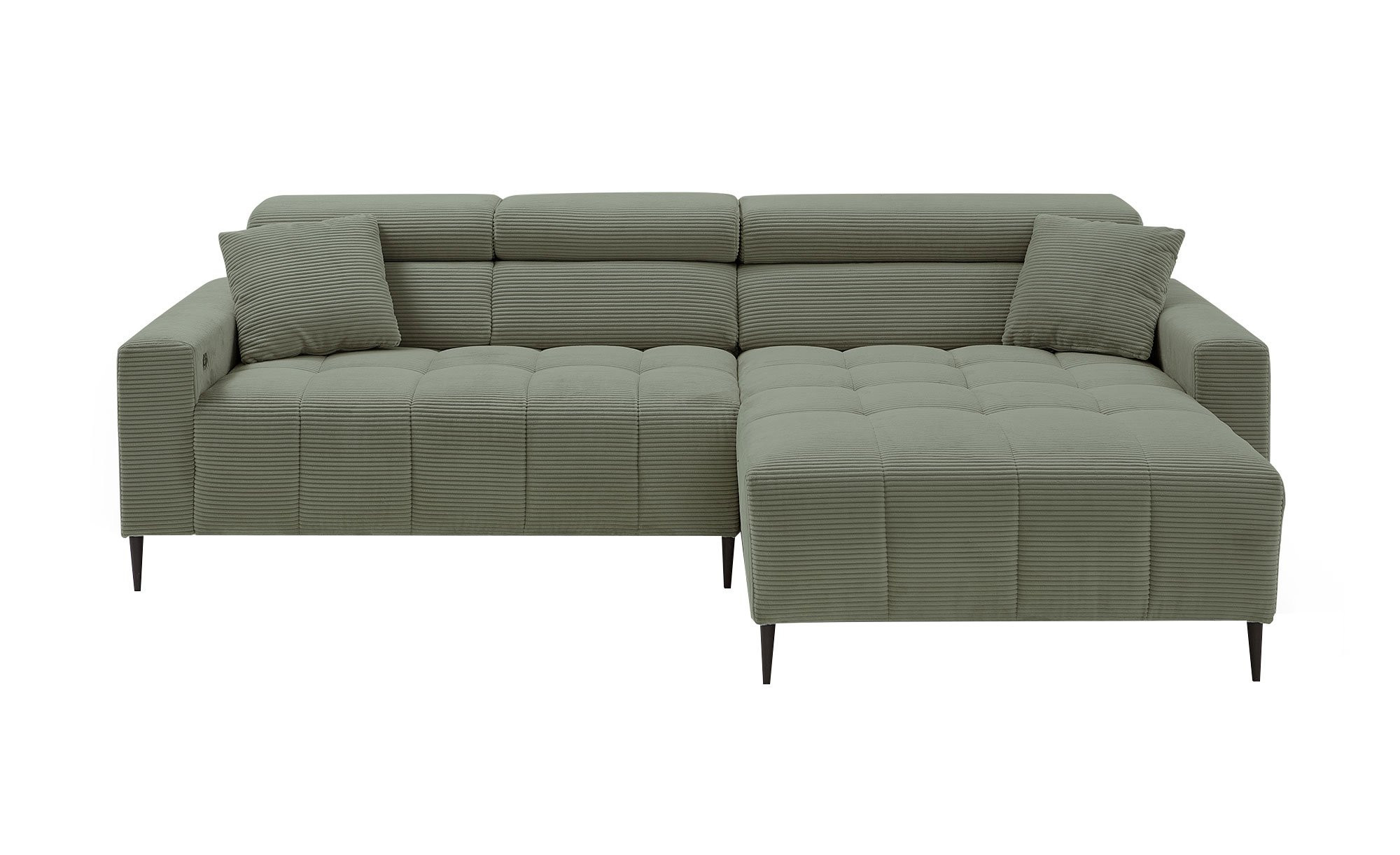 Der weiche Cordstoff in Grün verleiht dem ca. 256 x 78-100 x 105 cm großen Sofa einen einladenden Charakter. Zwei mitgelieferte Kissen im gleichen Bezug runden das Gesamtbild harmonisch ab. Eine rechtsseitige Ausrichtung und die schwarz gepulverten Metallfüße unterstreichen den modernen Stil zusätzlich.