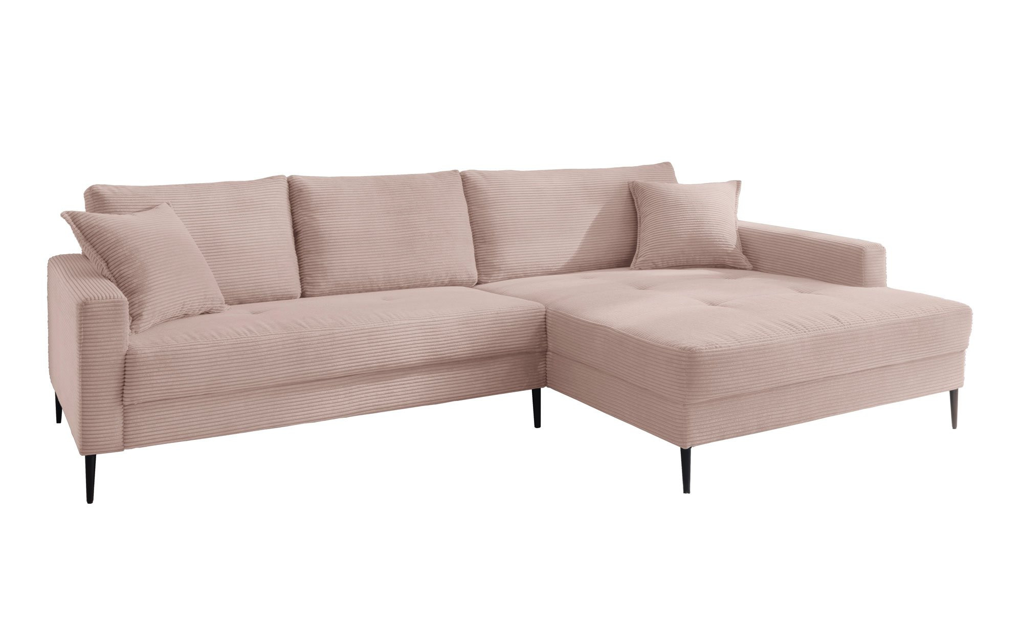 Der weiche, aber strapazierfähige Cord-Bezug in der Farbe Flamingo verleiht dem Möbelstück eine gemütliche Ausstrahlung. Da der Rücken komplett bezogen ist, sind flexible Stellmöglichkeiten gegeben. Ergänzt wird das Design durch filigrane, schwarze Metallfüße mit einer Höhe von ca. 15 cm.