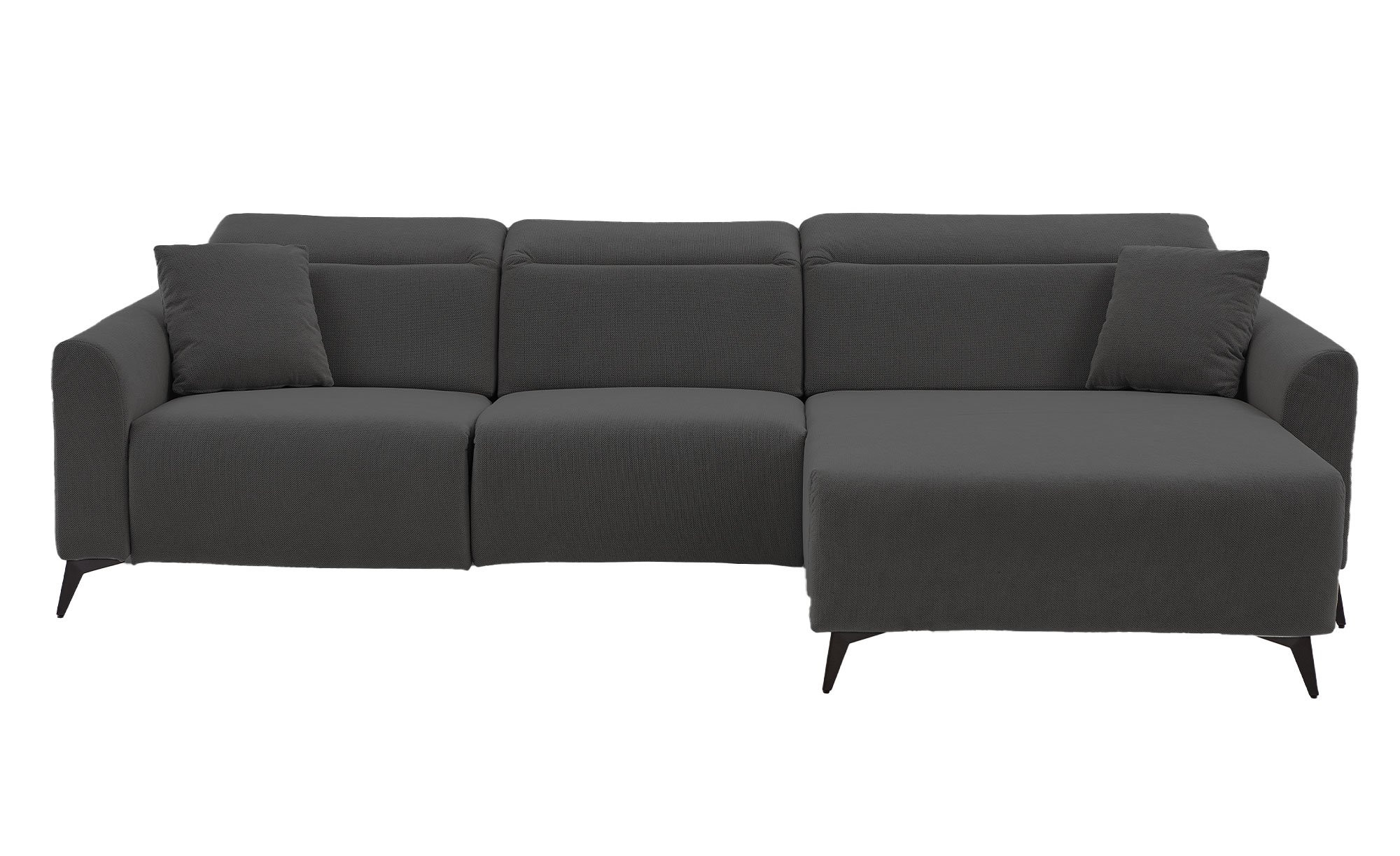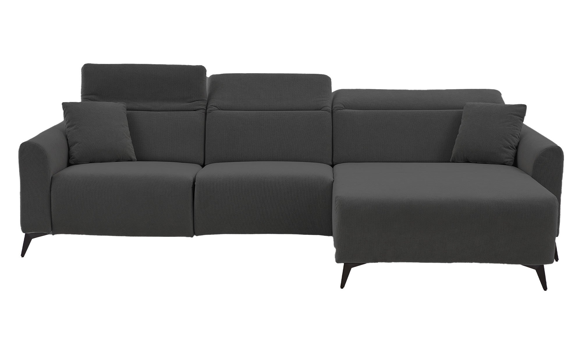 Bezogen mit einem dunkelgrauen Stoff, wirkt das ca. 280 x 75-95 x 167 cm große Sofa besonders stilvoll. Passend dazu gibt es zwei Zierkissen im selben Bezugsstoff sowie schwarze Metallfüße, die dem Gesamtbild einen zeitgemäßen Akzent verleihen. Auch der Rücken ist echt bezogen und erlaubt somit eine freie Platzierung im Raum.